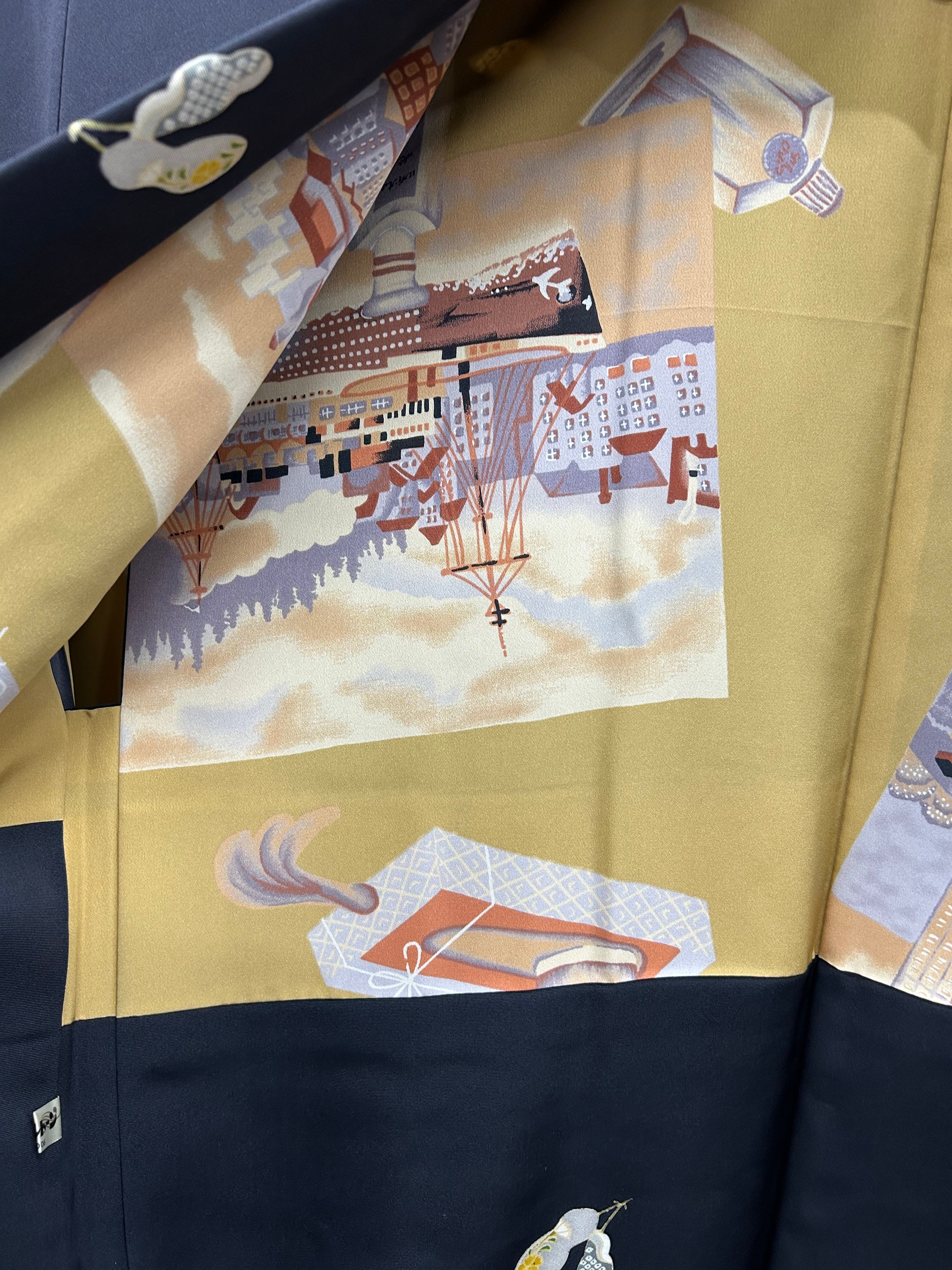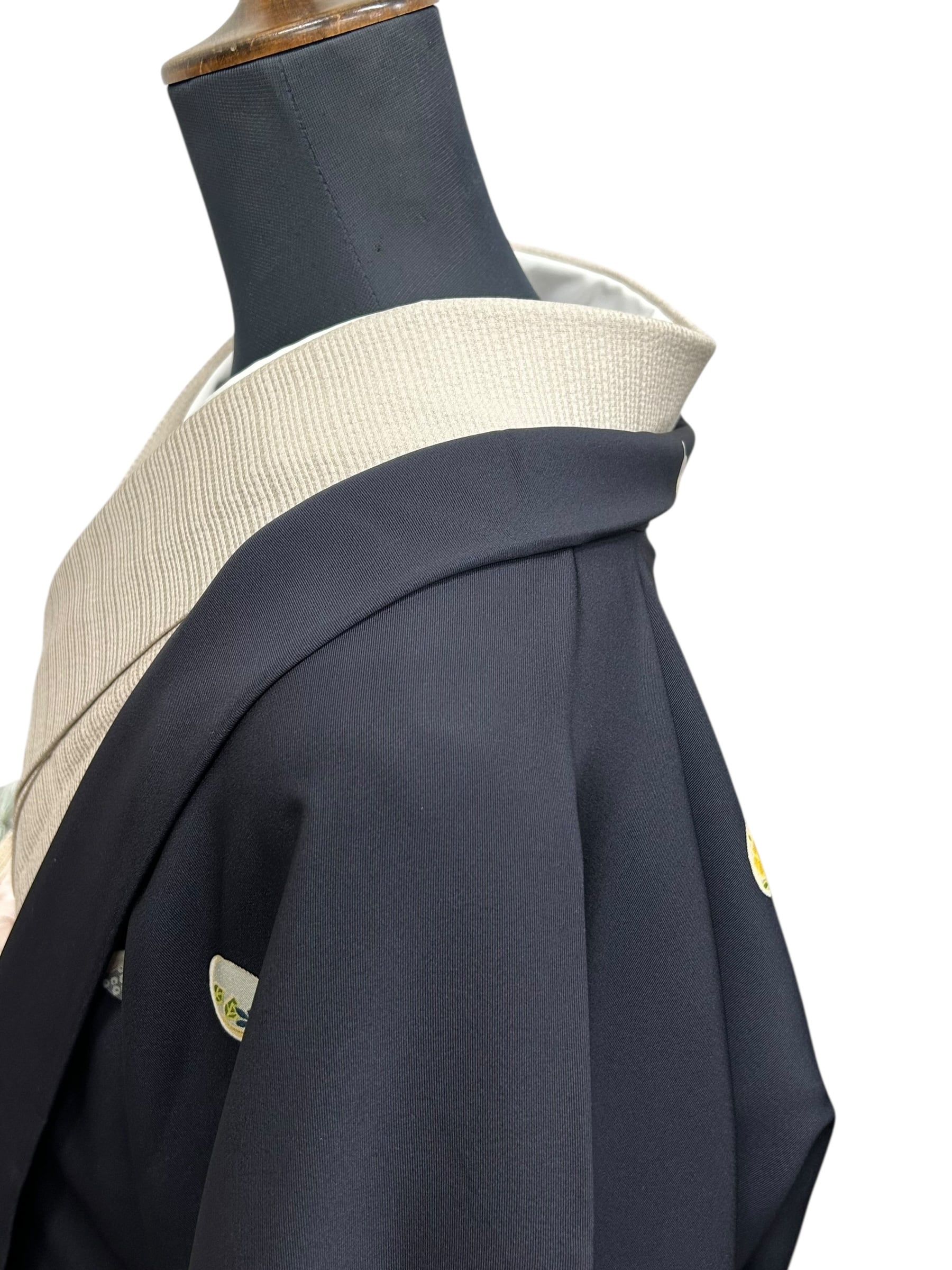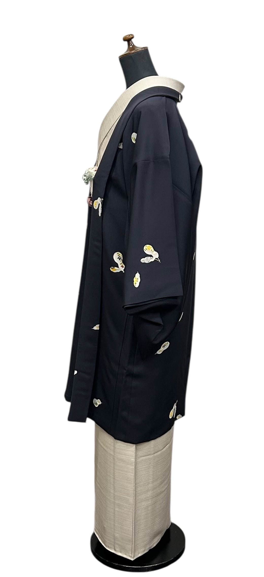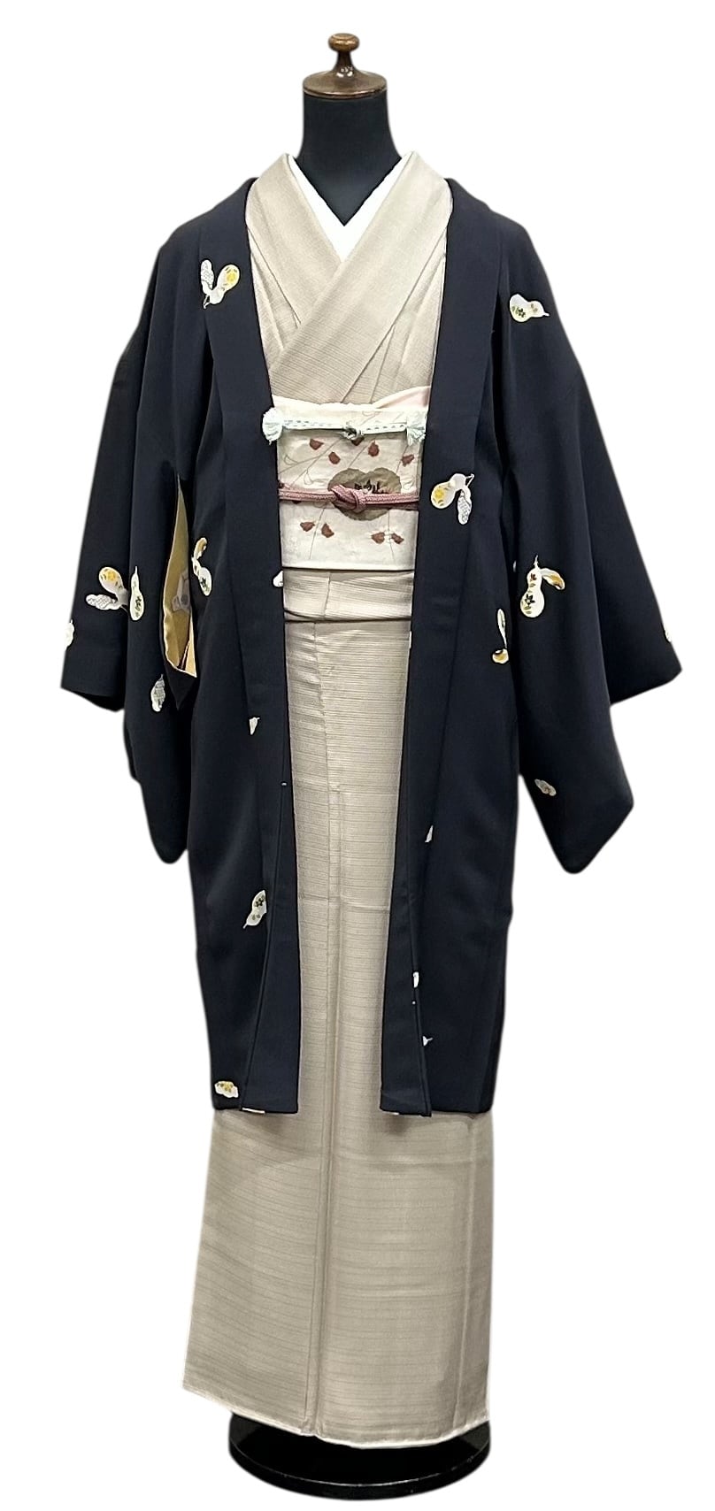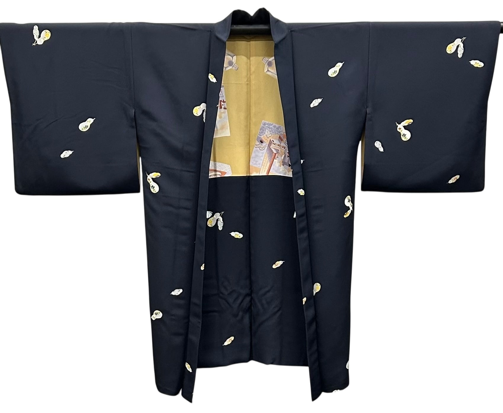 こちらは、遊び心あふれる魅力を持つ羽織です。黒地に可愛らしい瓢箪の飛び柄が散りばめられ、多色使いの草花や疋田柄が全体を華やかに彩っています。つるつるとしたなめらかな生地は、心地よい着用感を与え、様々なスタイルに合わせやすく、一枚あると重宝するアイテムとなっています。