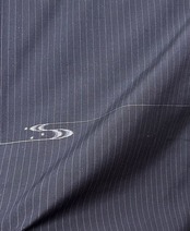 こちらは、藍鉄色の地に細い白のストライプがあしらわれ、優雅な流水模様が施された紬のお着物です。まるでハンサムなスーツのような雰囲気と質感が魅力的です。しつけ糸つき。ガード加工されているため、安心して着用いただけます。