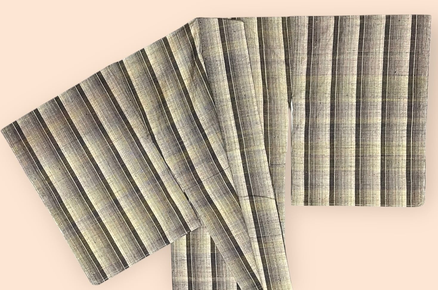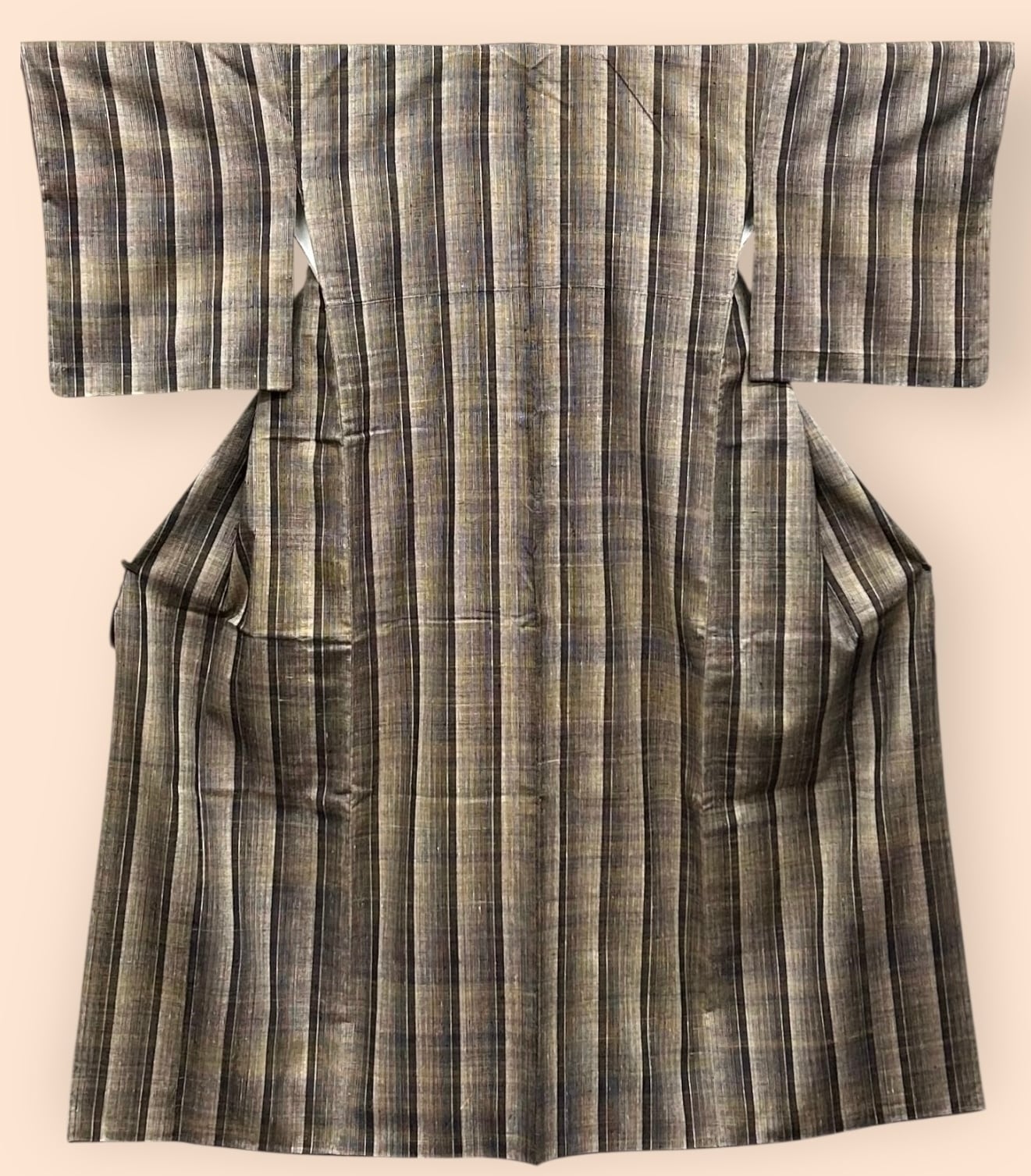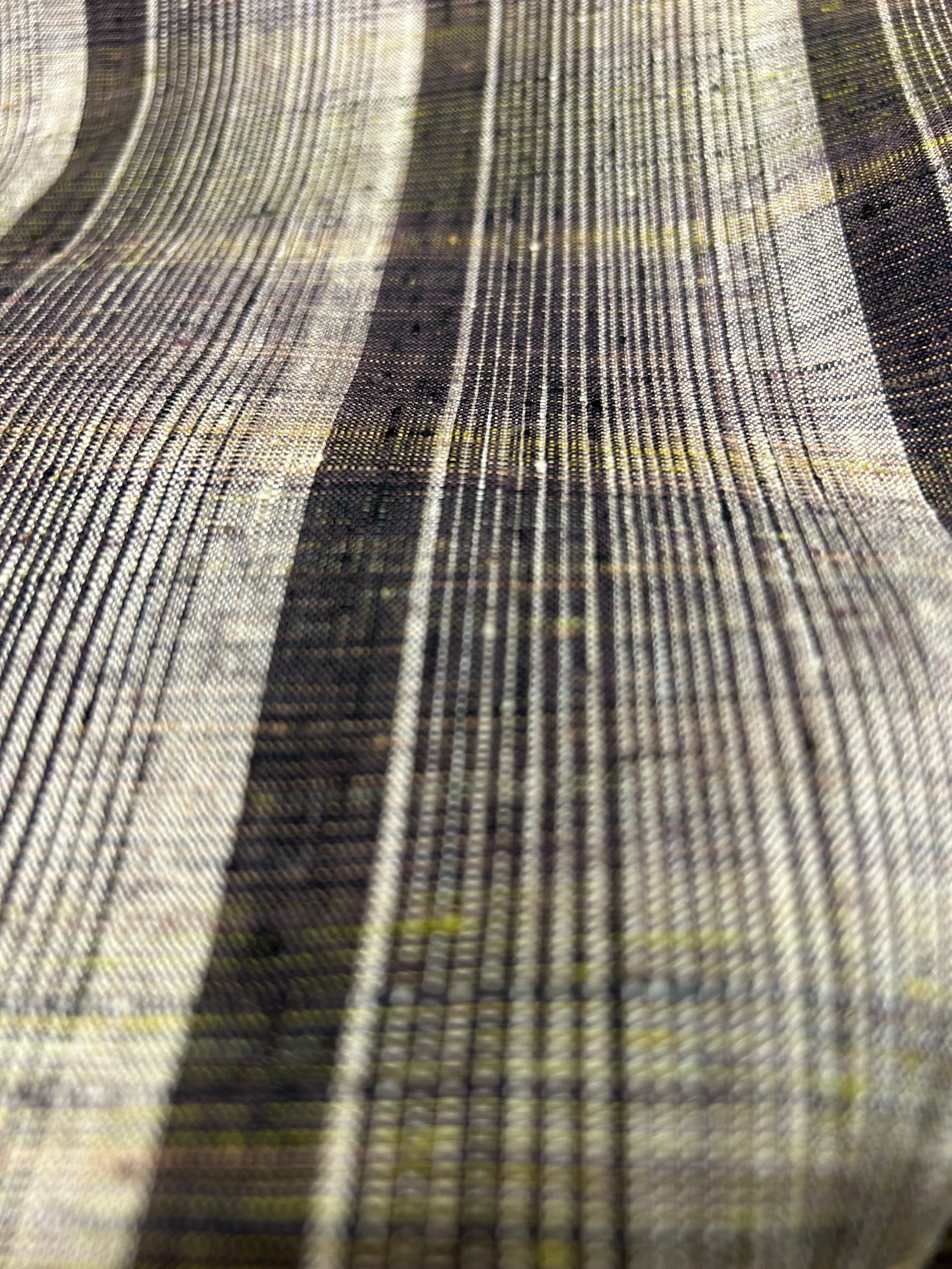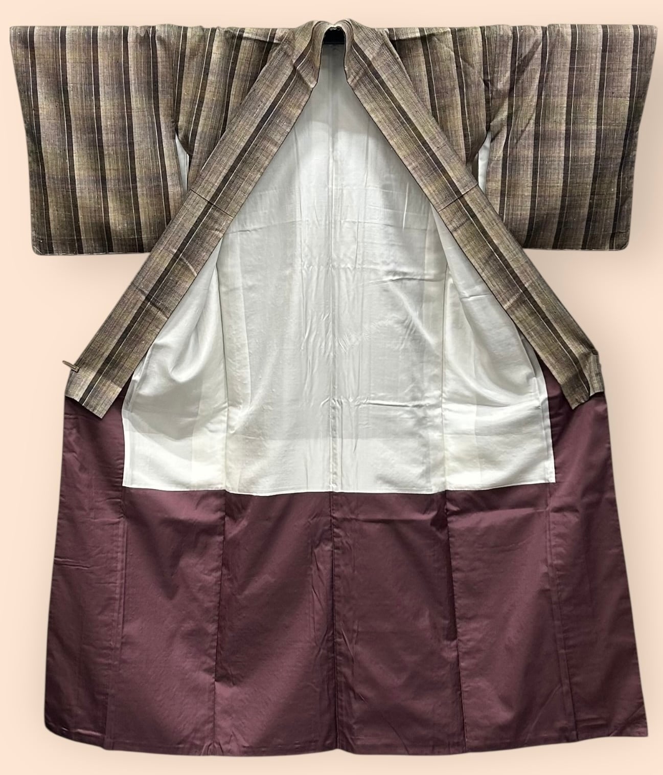 こちらは、郡上紬の魅力あふれるお着物です。赤墨色に濃い目の亜麻色などの縦縞が施され、さまざまな太さのストライプが美しく 印象的です。フシが多めで風合いの良いざっくりとした肌触りは、着心地の良さを感じさせてくれます。しつけ糸つき。