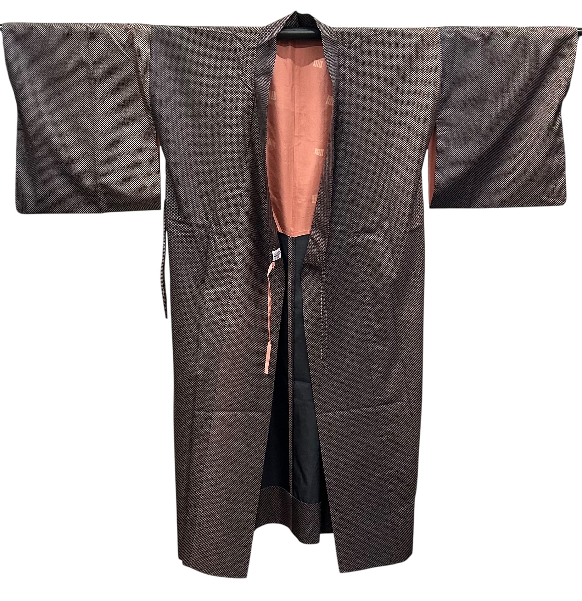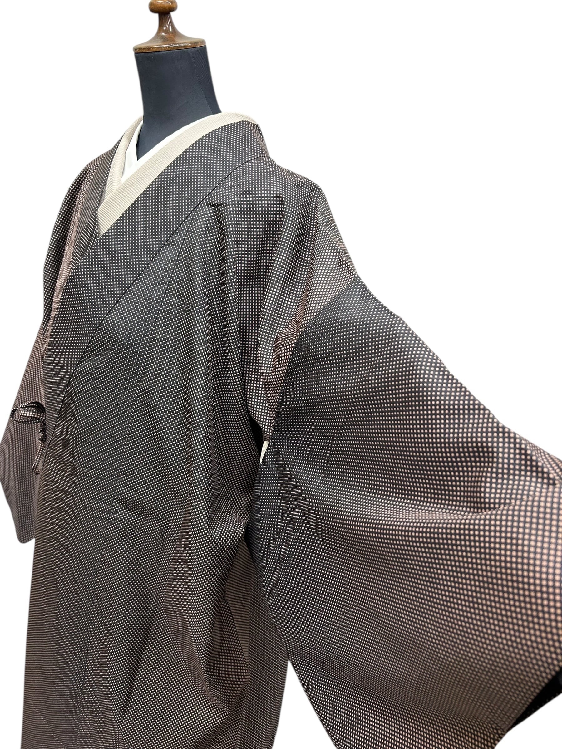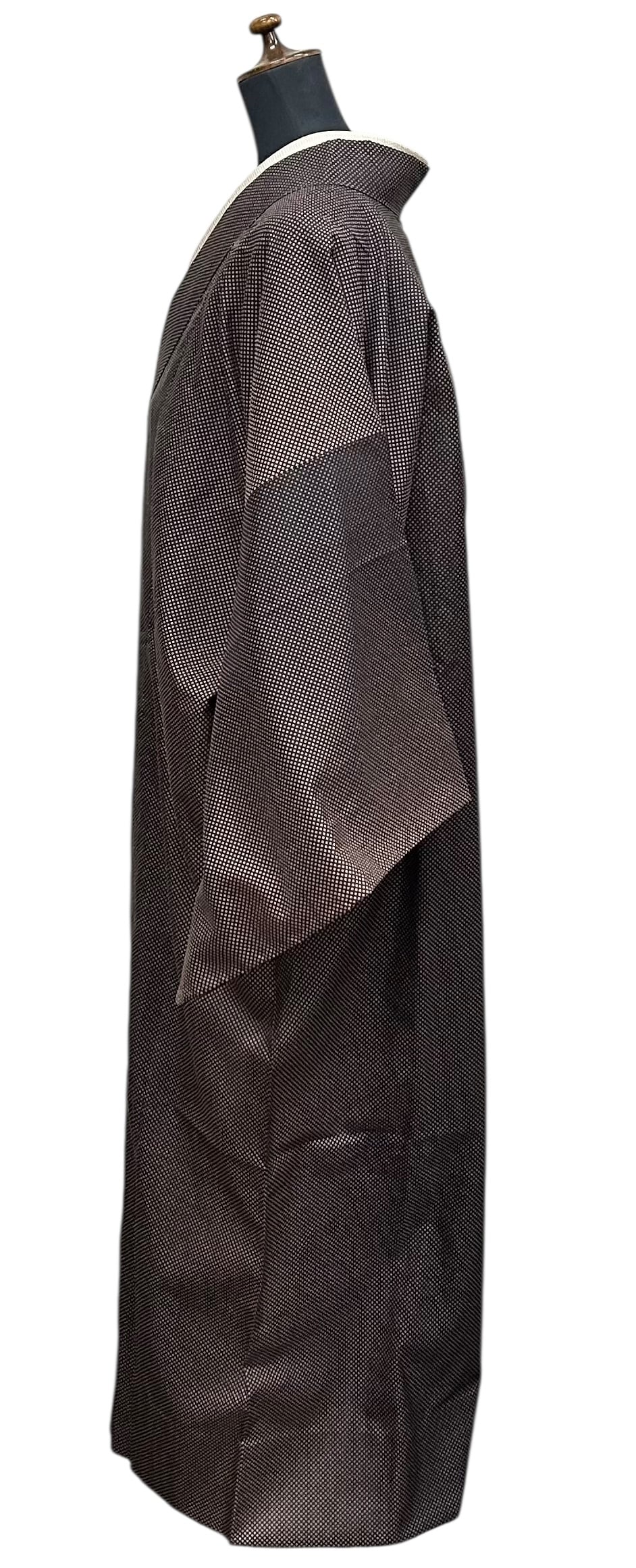 こちらは、洗練されたデザインの道中着です。黒地に伽羅色の細かい点が施されており、遠目から見ると美しい2色使いが魅力的です。こちらは薄手の単衣仕立て、ゆったりとしたサイズ感です。胴当てが施されているため、より安心してお召しいただけます。やまとお誂え。