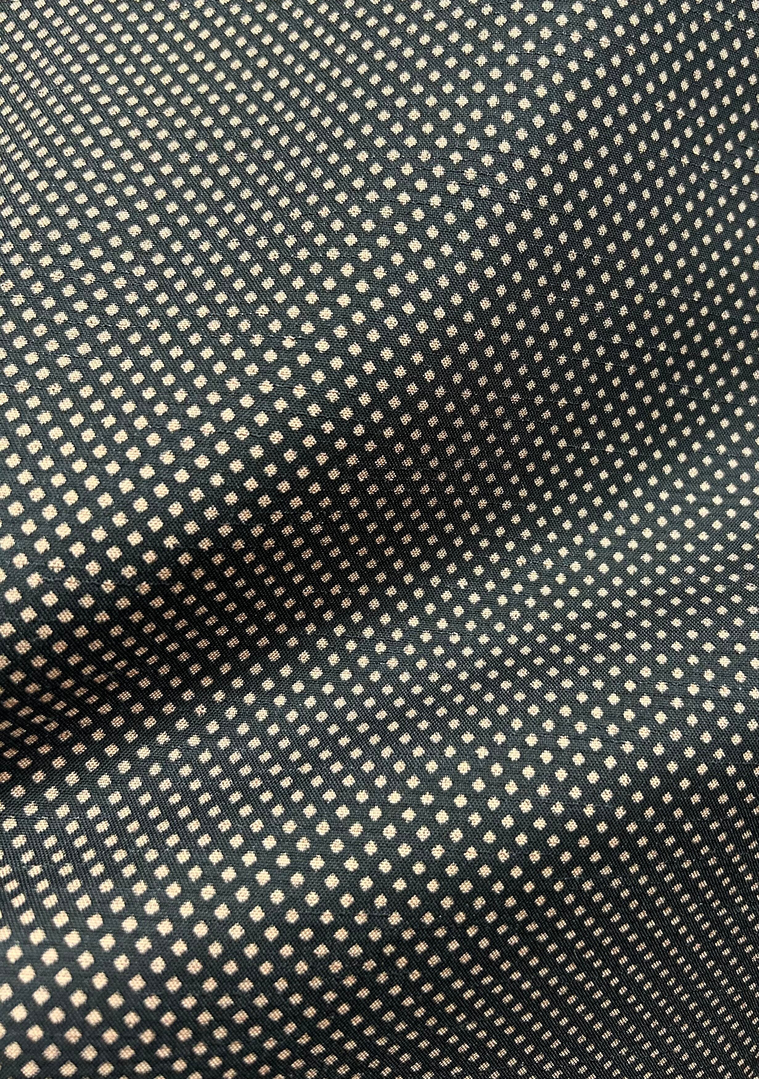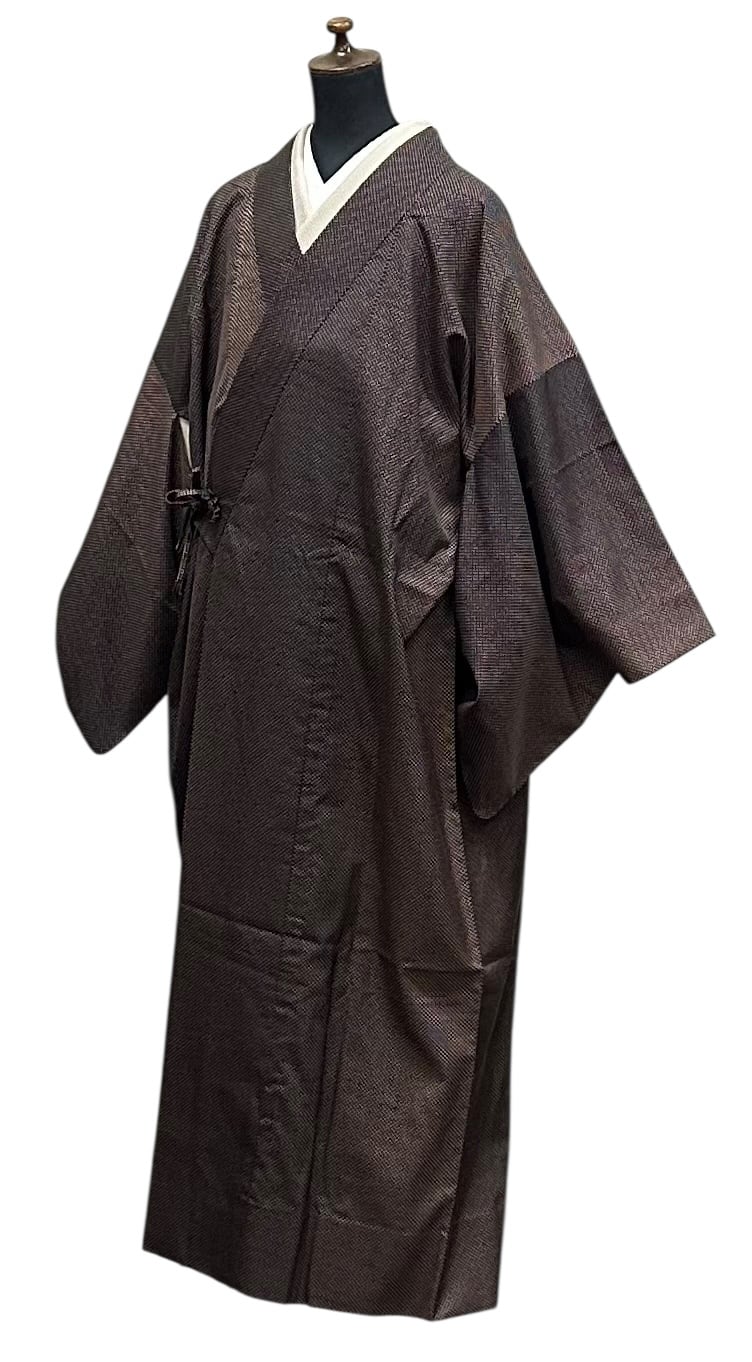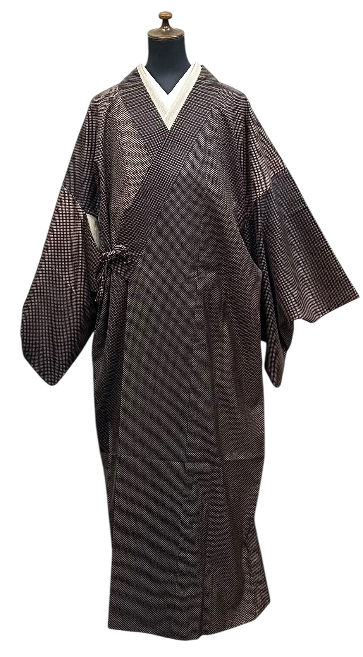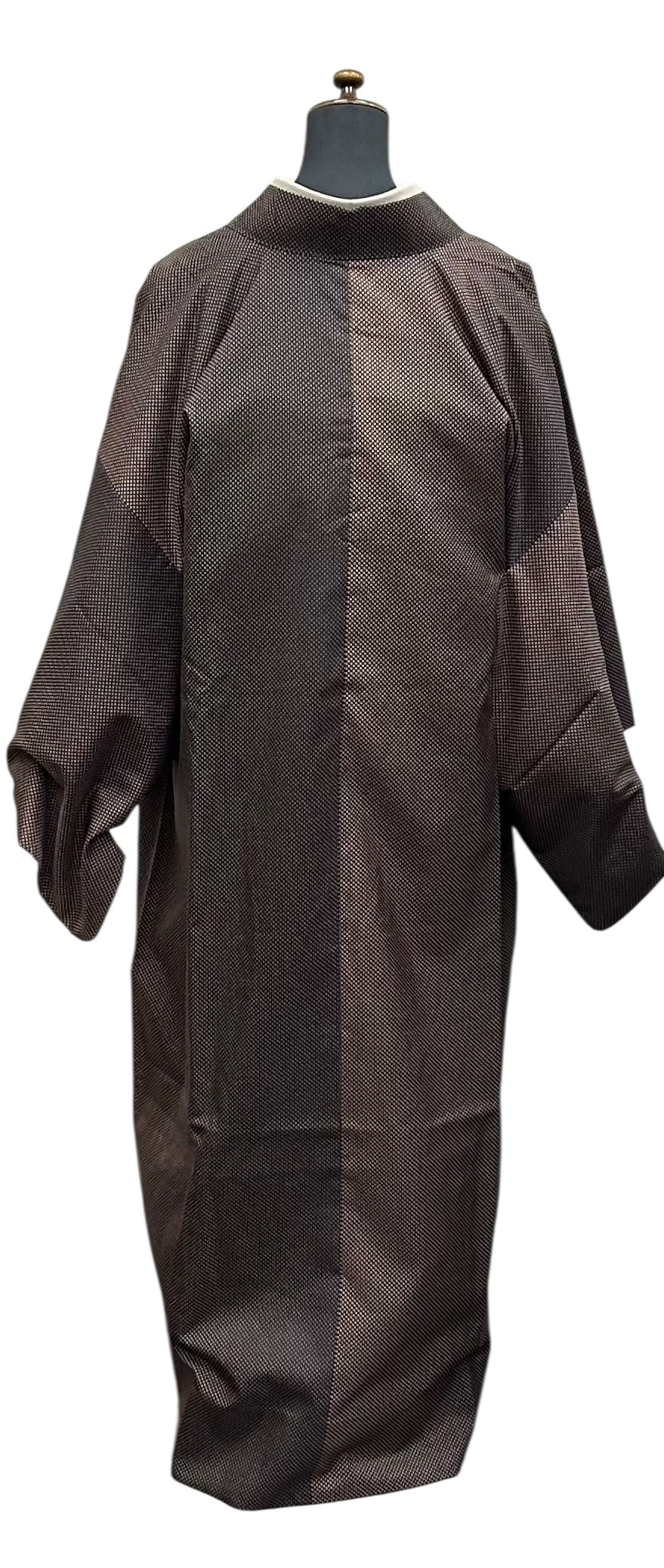 こちらは、洗練されたデザインの道中着です。黒地に伽羅色の細かい点が施されており、遠目から見ると美しい2色使いが魅力的です。こちらは薄手の単衣仕立て、ゆったりとしたサイズ感です。胴当てが施されているため、より安心してお召しいただけます。やまとお誂え。