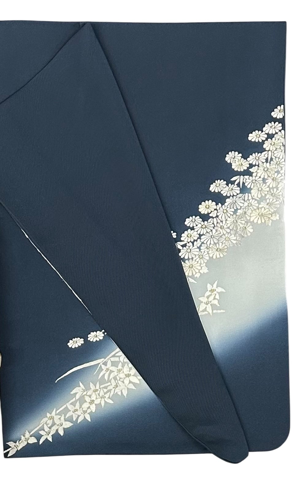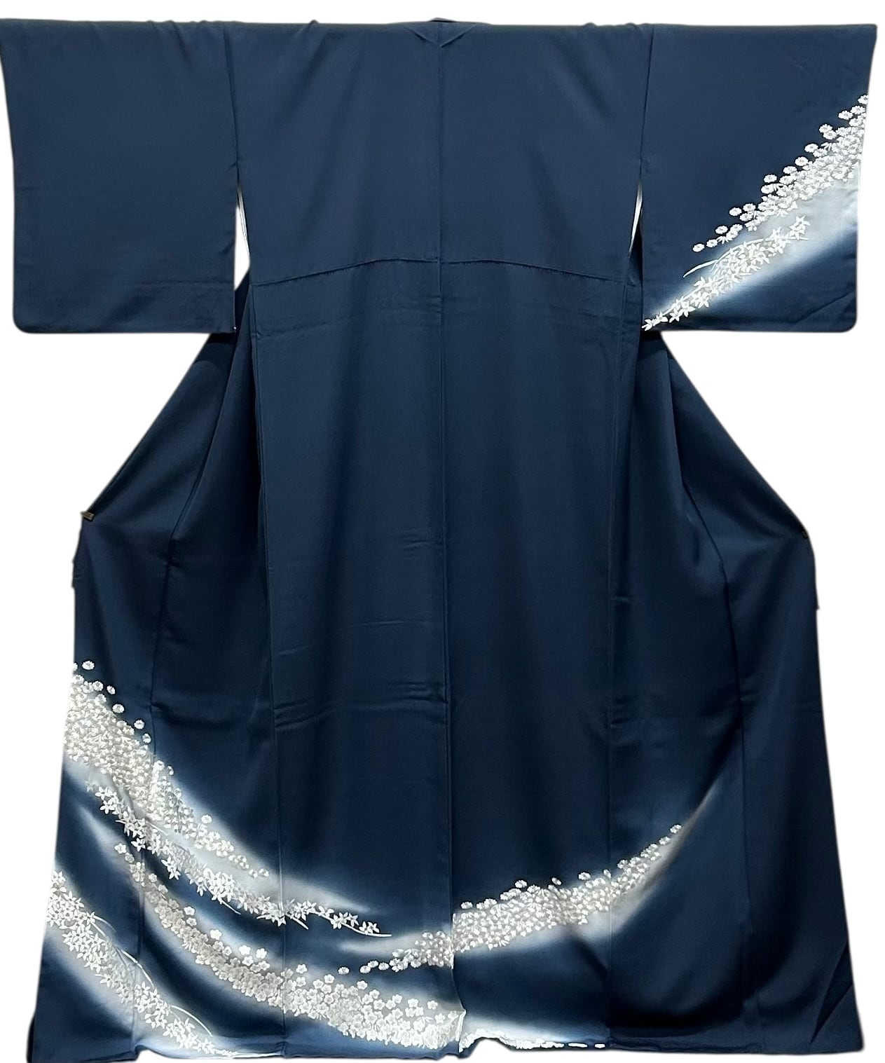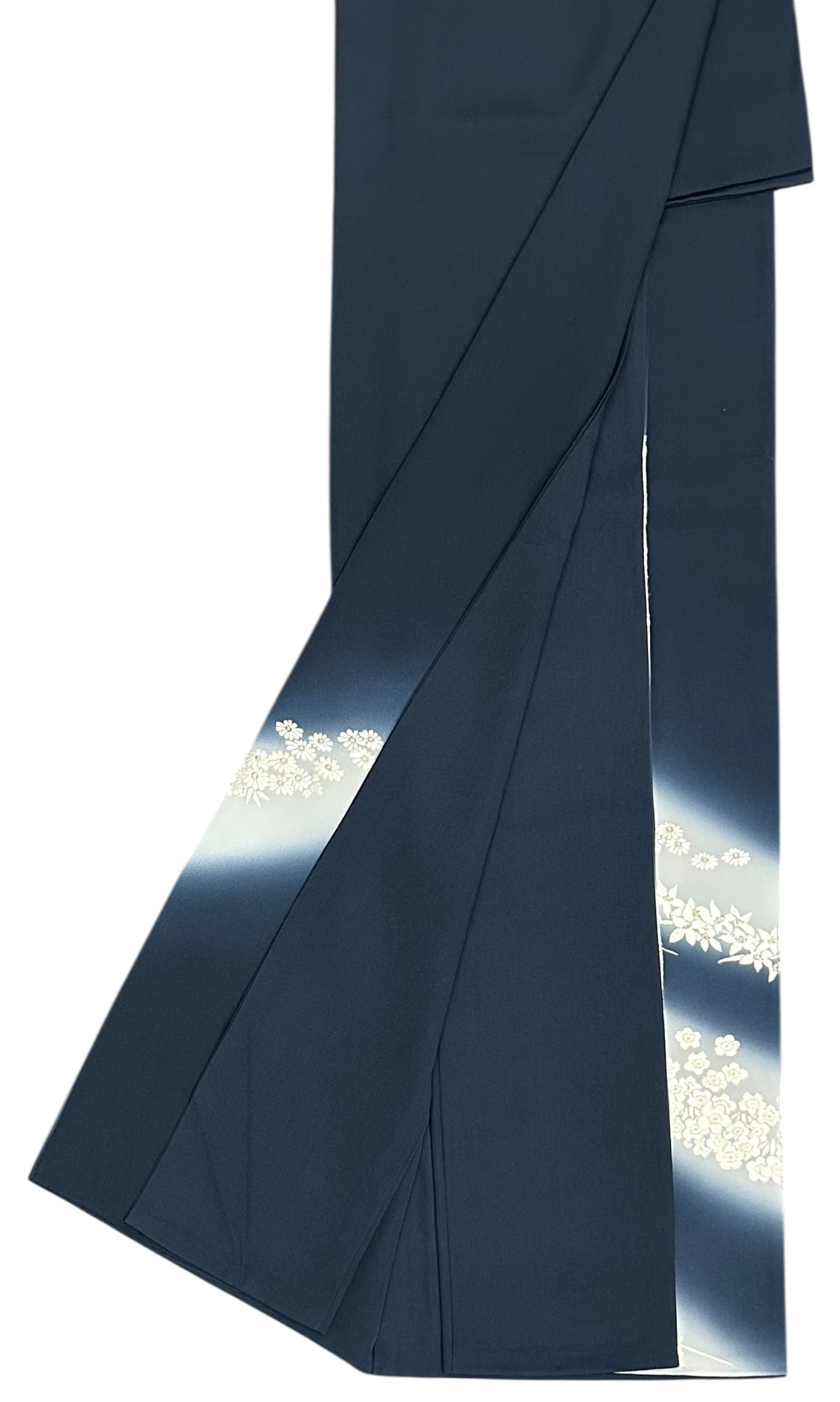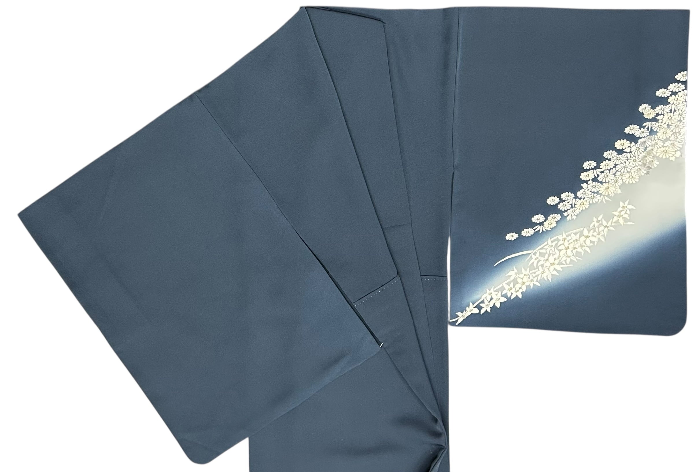 付下げ 刺繡 菊と梅 少し青みのある褐返色の地 裾と袖にかけてうすい灰青色へのグラデーション 裄丈 69㎝ K5034