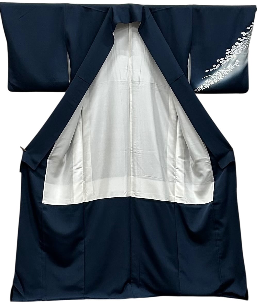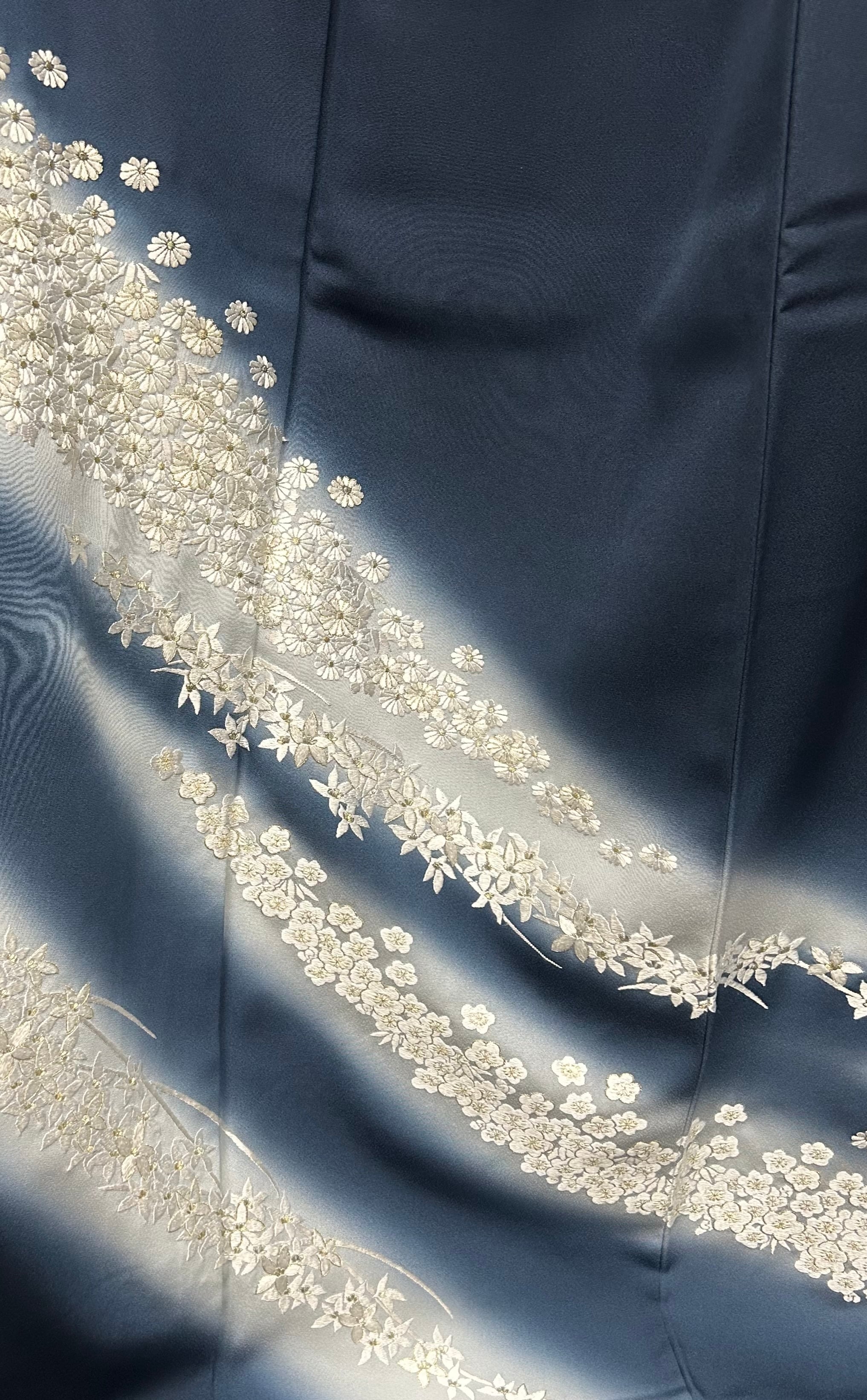こちらは、優美さと豪華さを融合させた付下げのお着物です。少々青みのある褐返色の地に、裾と袖にかけてうすい灰青色へのグラデーションが施されています。光沢の美しい白と金色の小菊や梅などの刺繍が流れる川のようにあしらわれ、上品な印象を与えます。なめらかな肌触りは着用時に心地よく、特別なシーンをより一層引き立てることでしょう。
