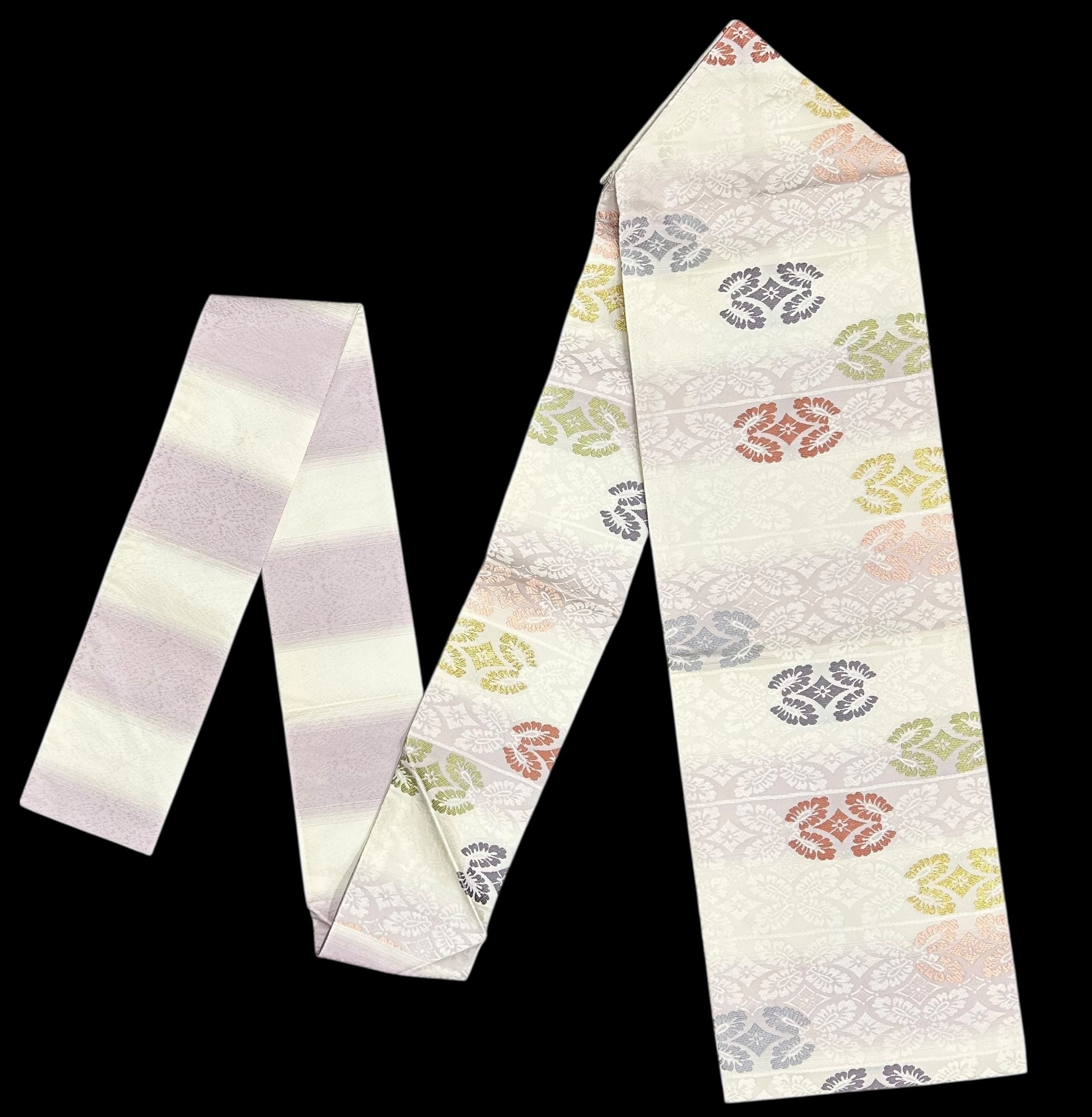 名古屋帯 象牙色と薄梅鼠色の横段の地 優美な華文 長さ 358㎝ Q4832