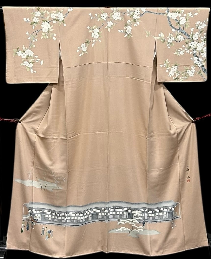 訪問着 浅井青仁 京友禅 茶色がかった赤香色 桜と松と家屋と人々 落款あり 裄丈 65.5㎝ K6137