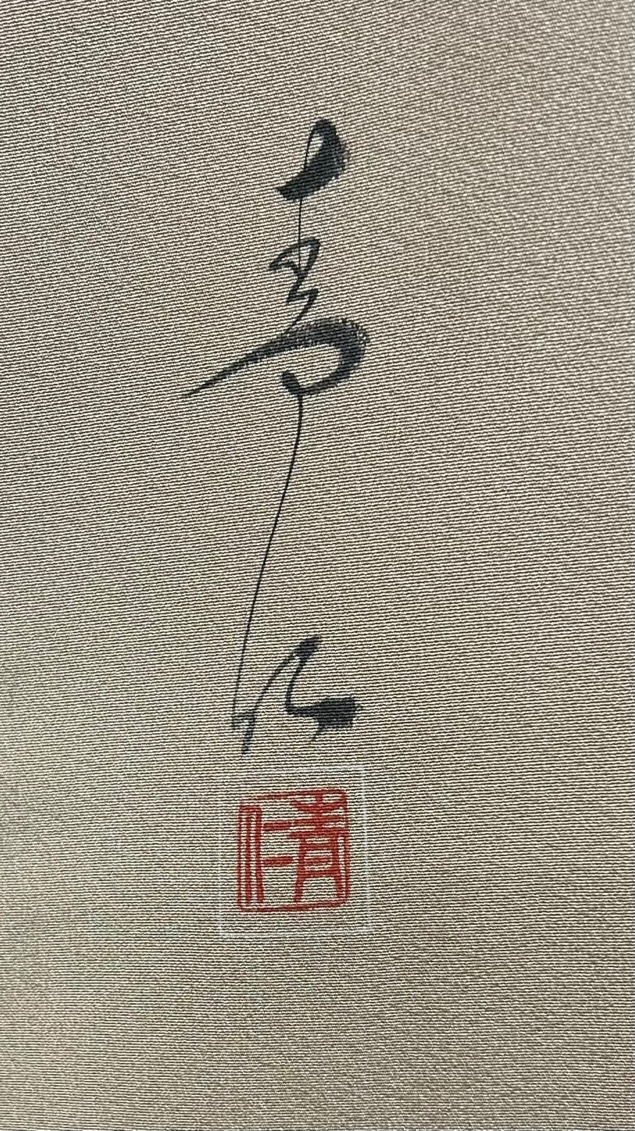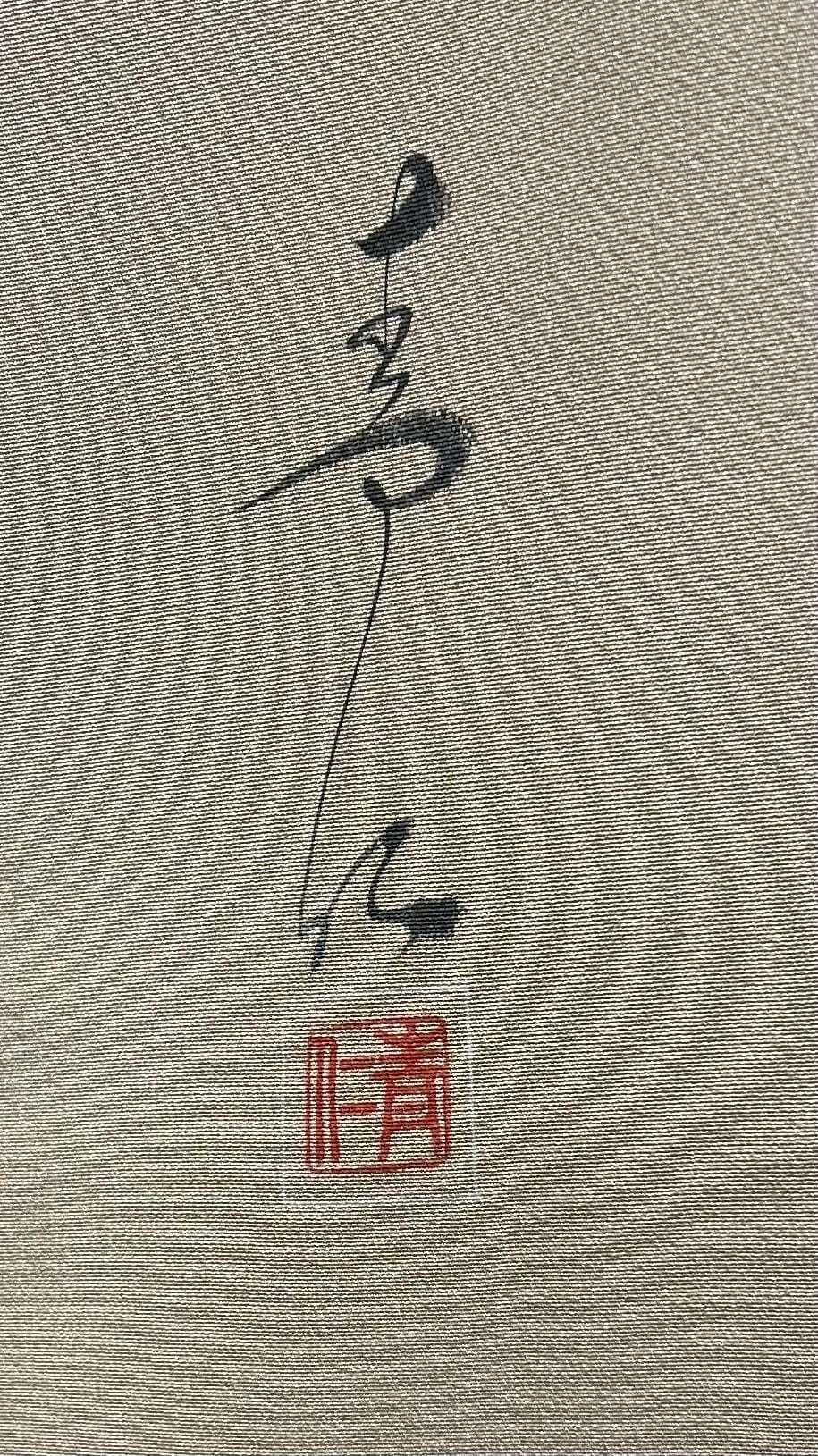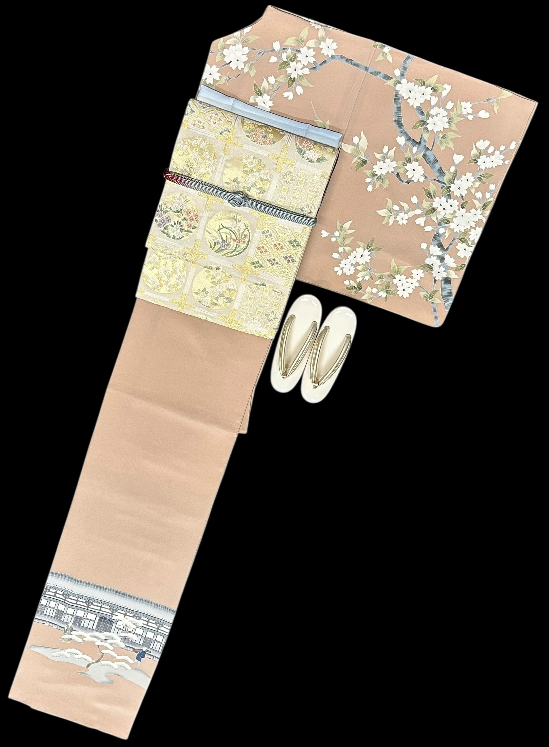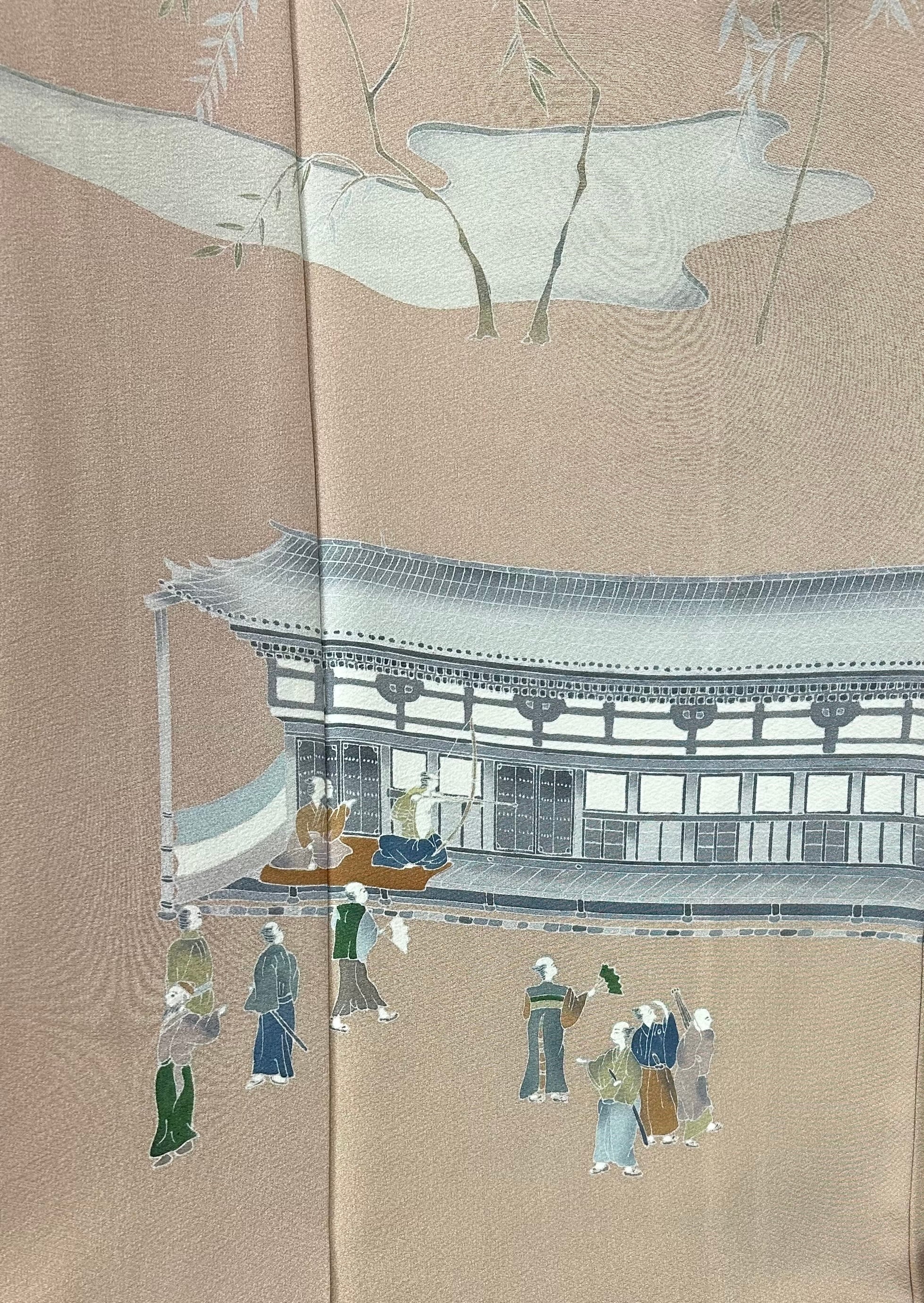 こちらは友禅の巨匠浅井青仁の魅力的な訪問着です。茶色がかった赤香色の地に、豪華な桜、雪の積もった松、そして侍や町人たちが描かれており、風情ある日本を感じさせます。家屋の長い廊下で弓の稽古に励む姿が印象的で、特別な場面でも一層引き立つ存在感を演出します。しっとりとした質感の生地は、肌触りも良く、着用時の心地よさをお楽しみいただけます。落款もあり、特別な作りの一品です。