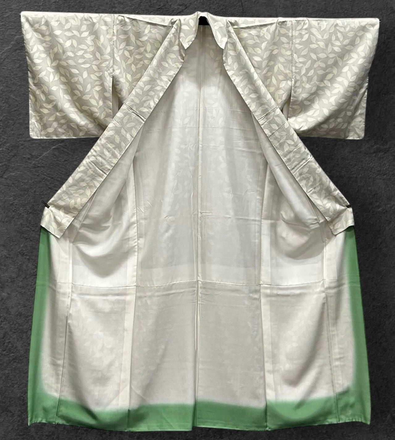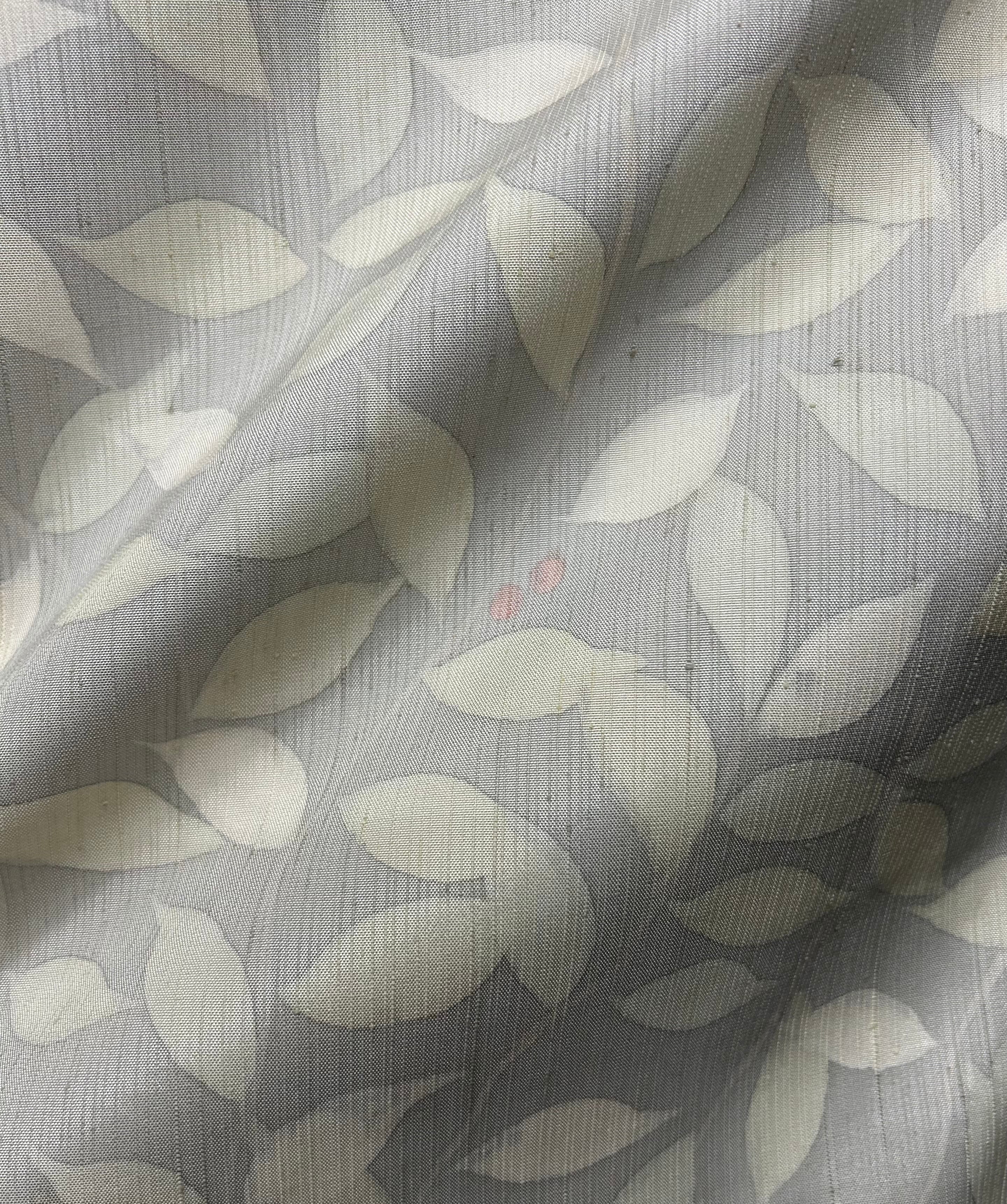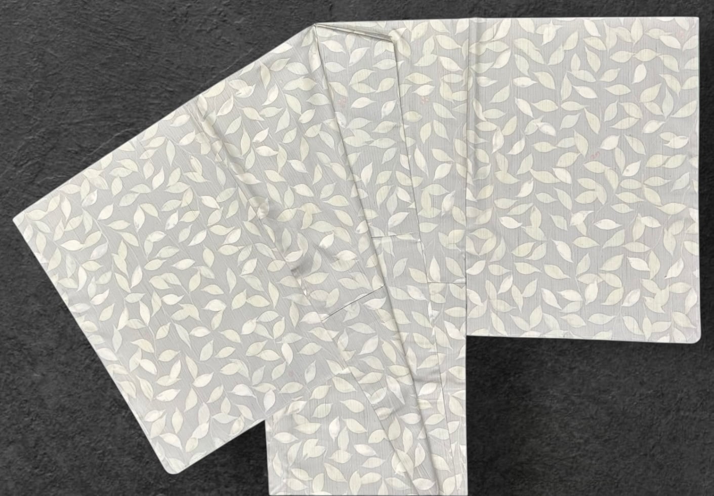 こちらはごく薄い灰青色の地に植物柄が施された紬です。薄いグリーン系とイエロー系の葉、さらに薄い薄紅色の実が、柔らかな印象を与えつつ、フシが柄と一体化して美しさを引き立てています。薄めのハリのある地は、着用時に心地よさを感じさせ、特別なシーンでも存在感をしっかりと演出します。
