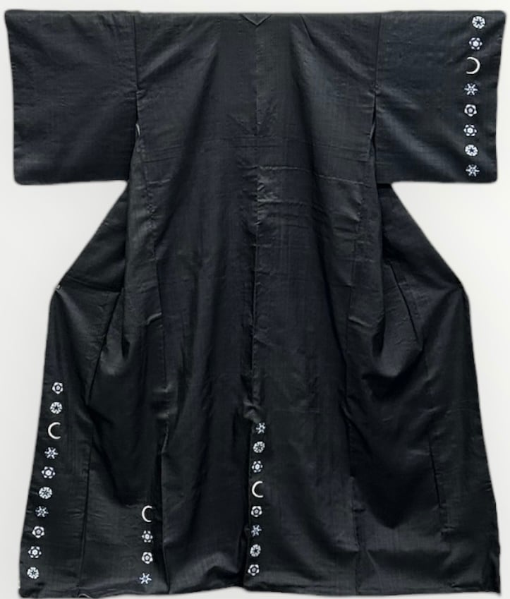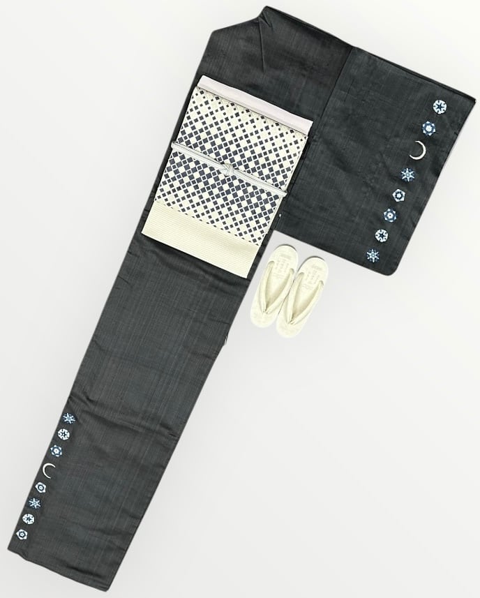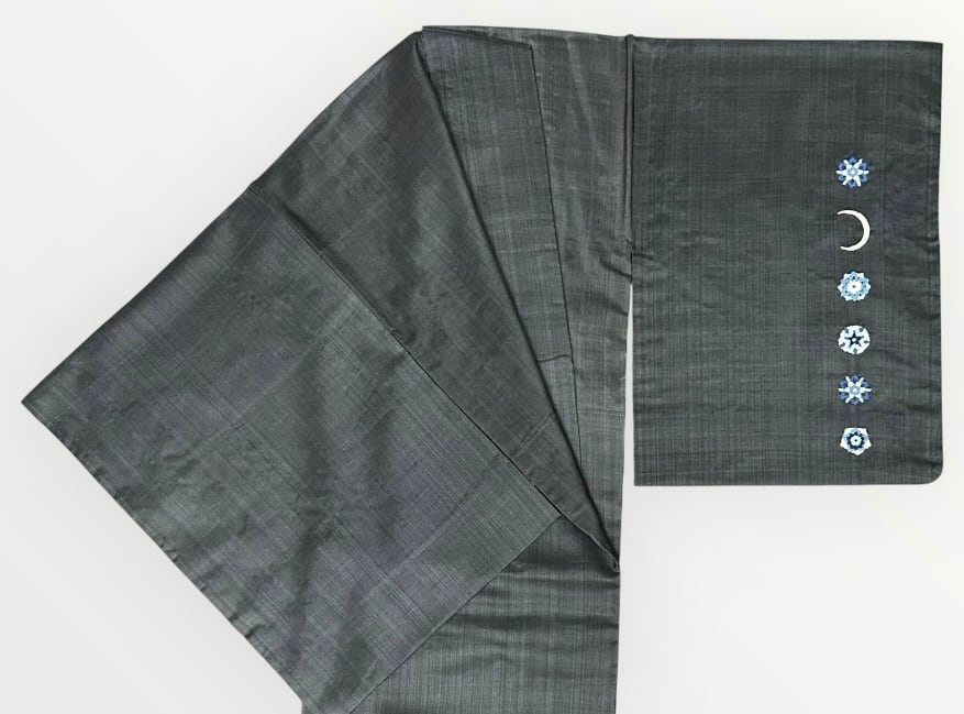 こちらは、優雅な魅力を持つ付下げの紬地、藍墨茶色の一品です。雪の結晶をモチーフにした相良刺繍が施され、白、水色、薄縹色、藍色などの柔らかな色合いが美しく調和しています。さらに、三日月にあしらわれたビーズが、華やかさを添え、特別なシーンでも存在感を引き立てます。薄めでハリのある生地は、着用時の心地よさを感じさせ、幅広いシーンでお洒落を楽しんでいただけるでしょう。鈴乃屋さんのお品です。