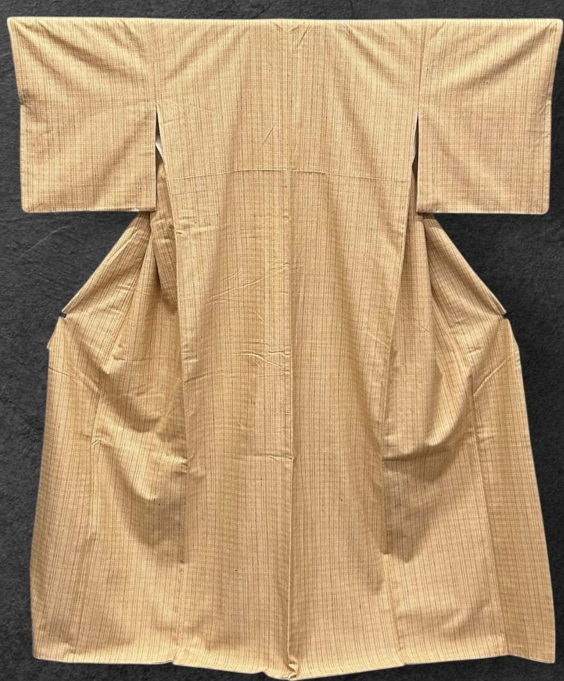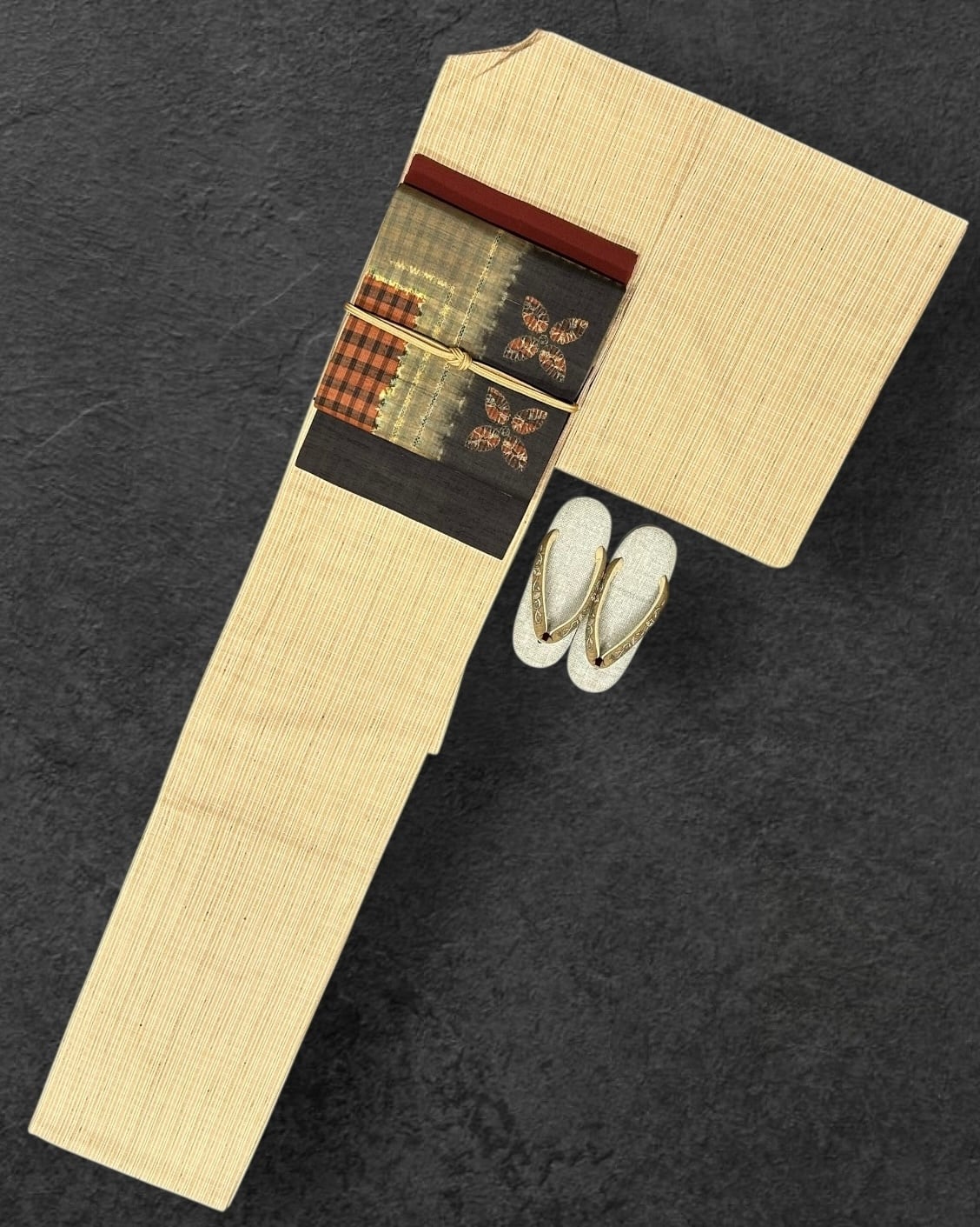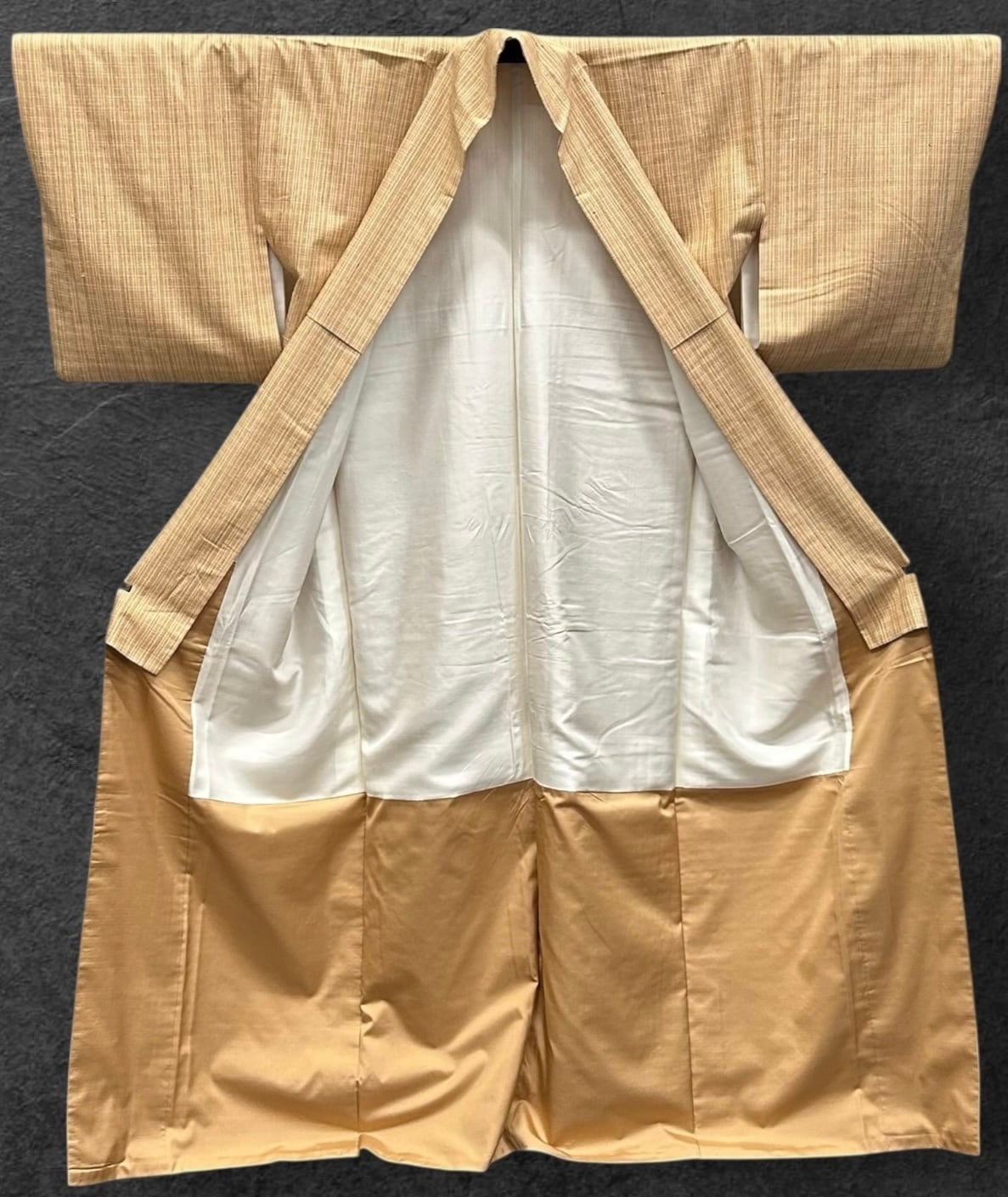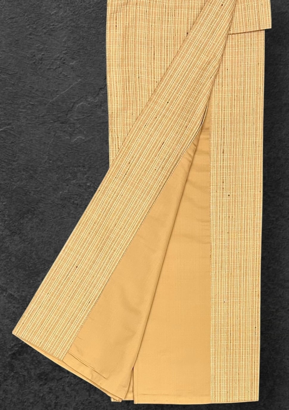 こちらは、美しい紬のお着物です。明るめの伽羅色に白と錆色の変わり格子が施されたデザインは、特別な存在感を引き立てます。また、フシ多めでハリのある肌触りが特徴で、着用時には心地よさを感じさせ、日常のスタイルを格上げしてくれることでしょう。