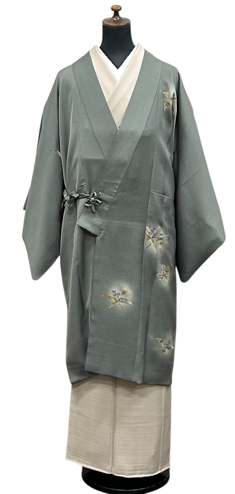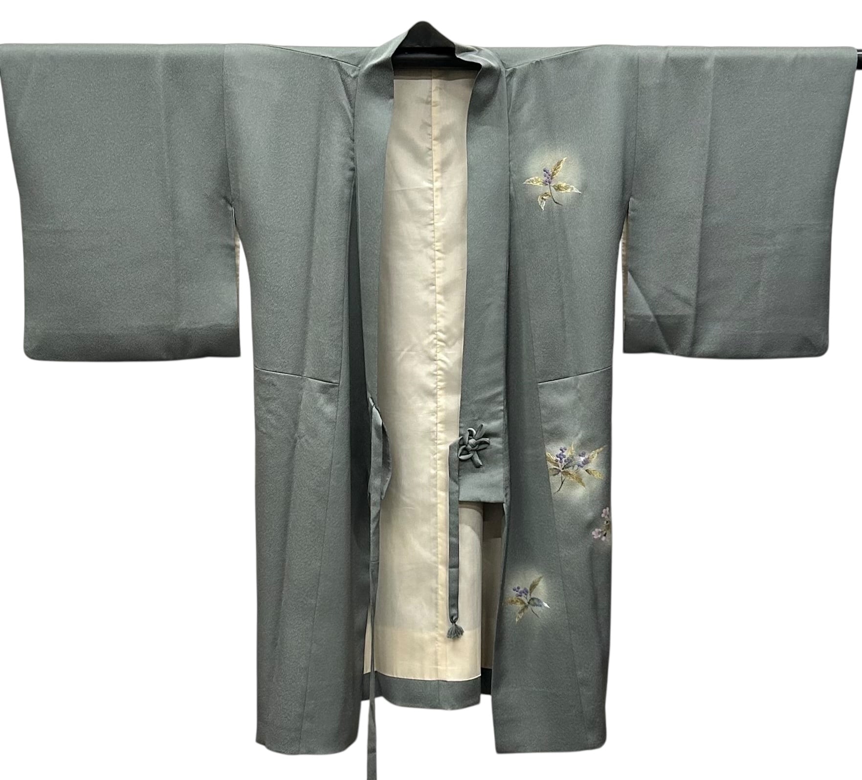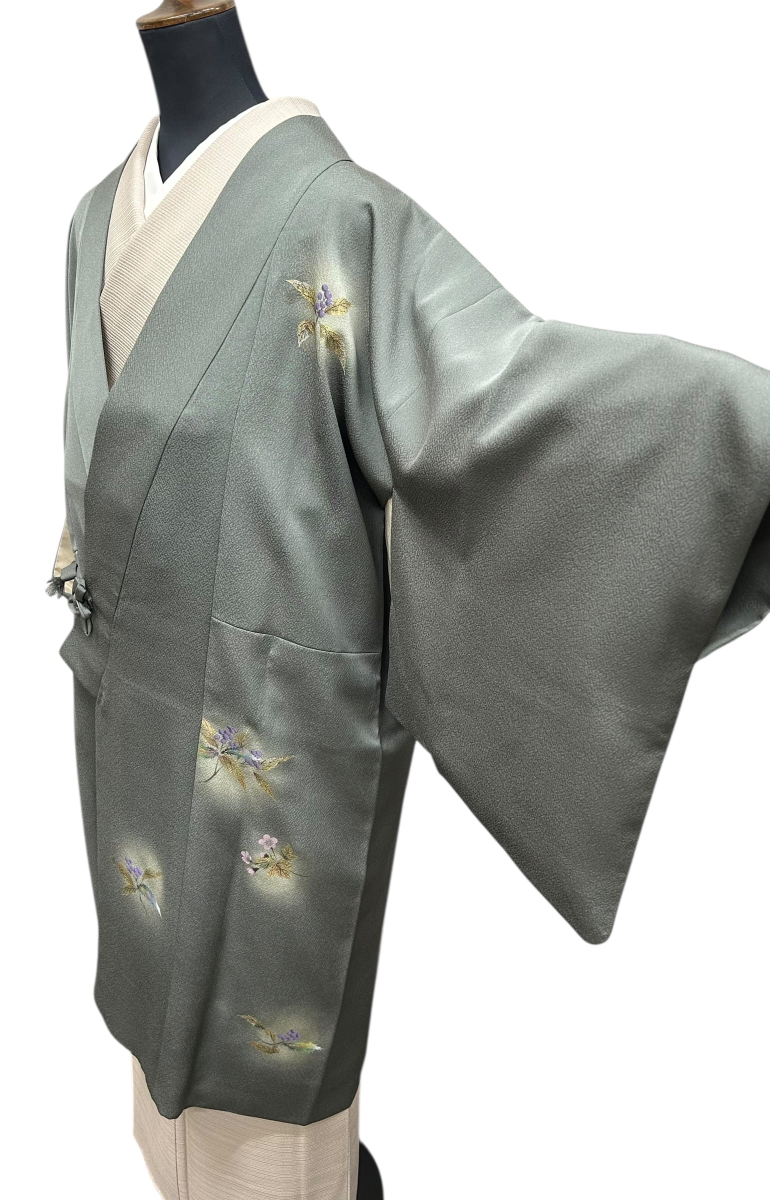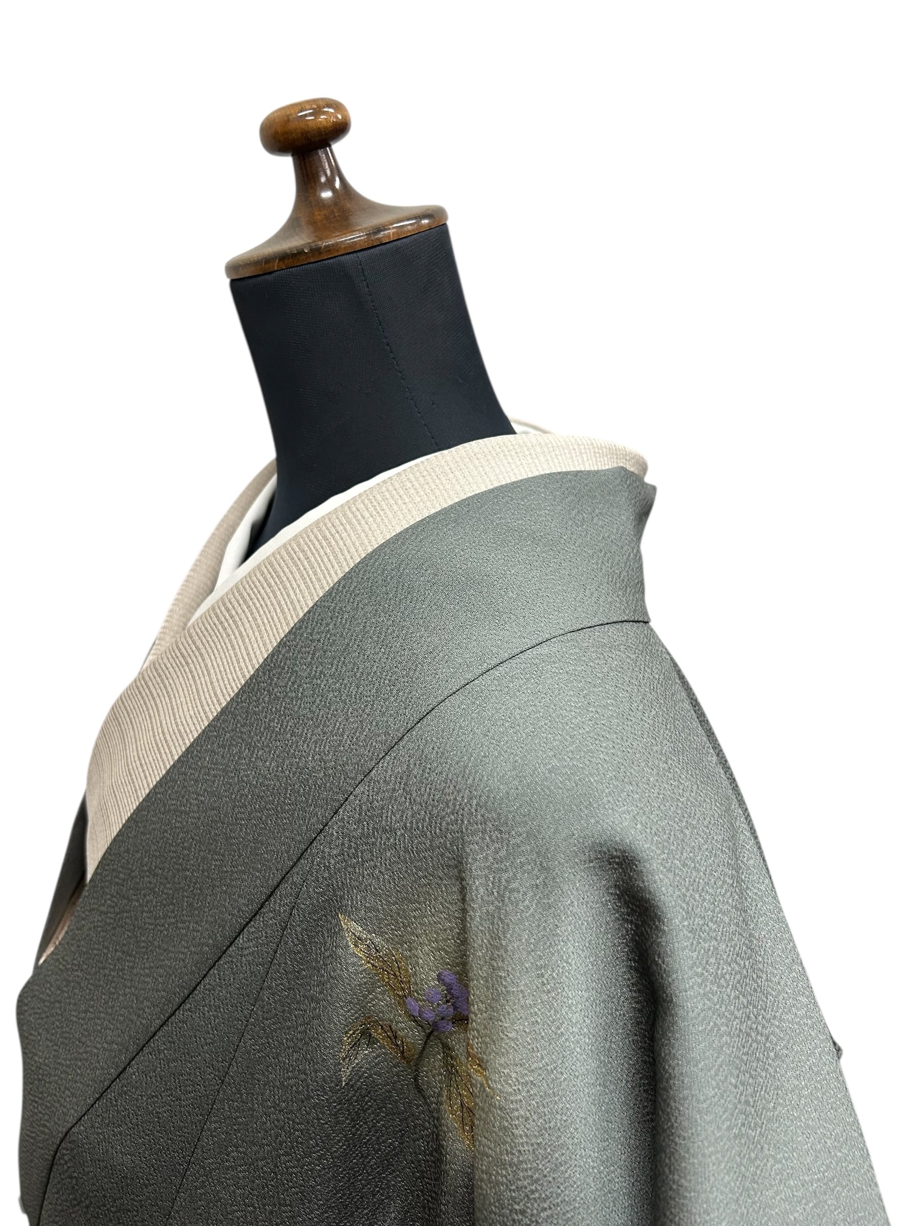 こちらは、上品な草花が描かれた道中着です。暗めの青鈍色のちりめん地は、凹凸のある表面感が特徴で、優雅な雰囲気を醸し出します。金、紫苑色、紅藤色、暗めの青緑色などの美しいの草花模様が施されています。しっとりとした肌触りは心地の良い着用感をもたらしてくれます。