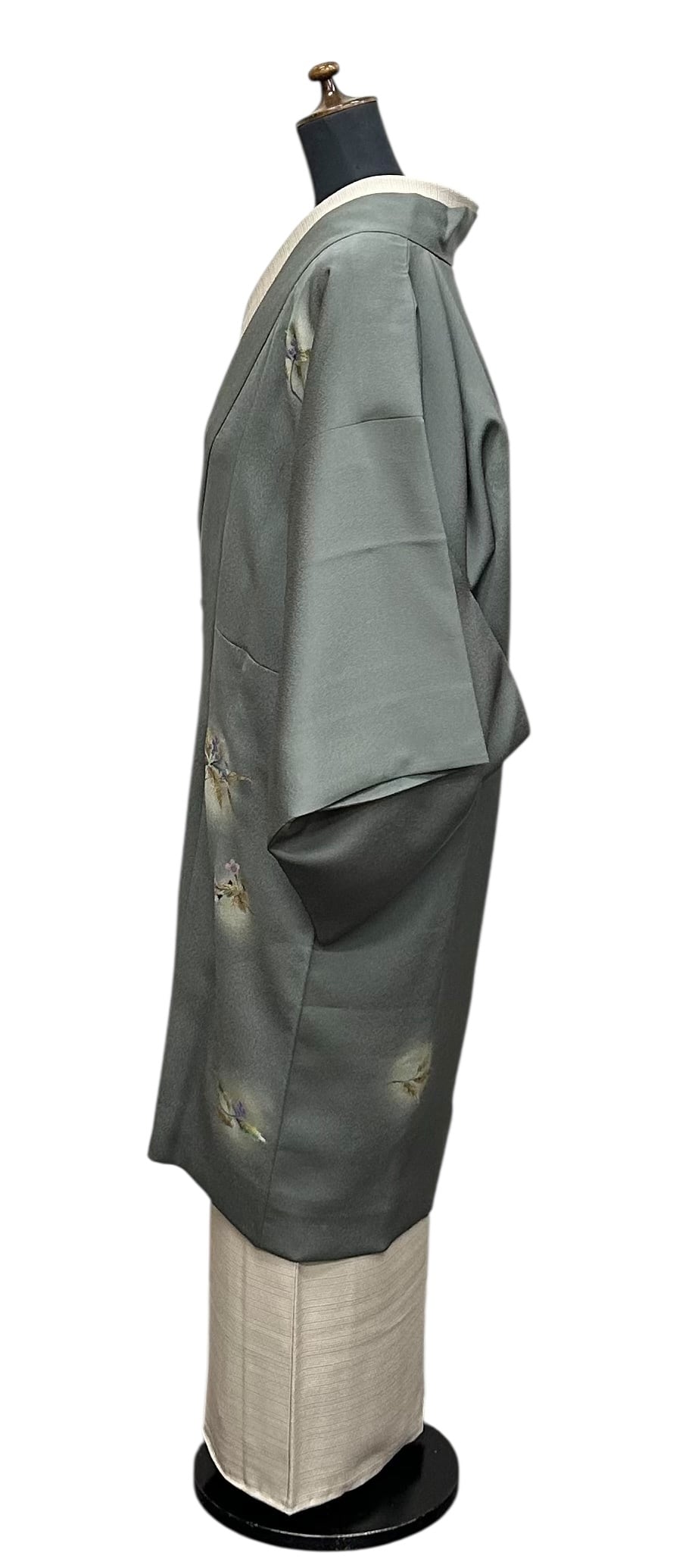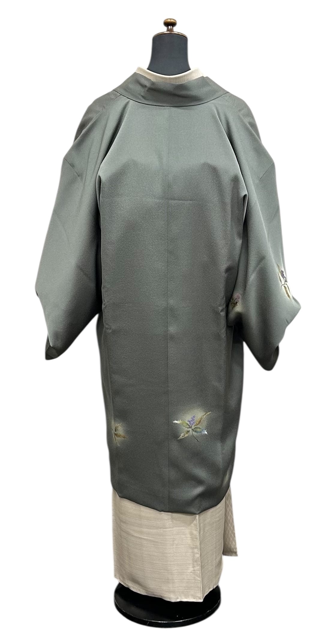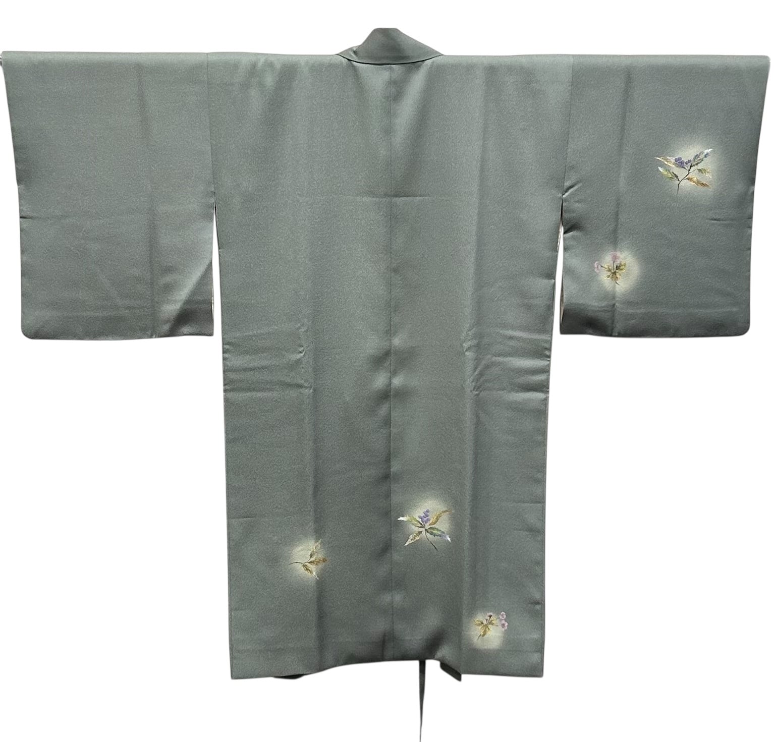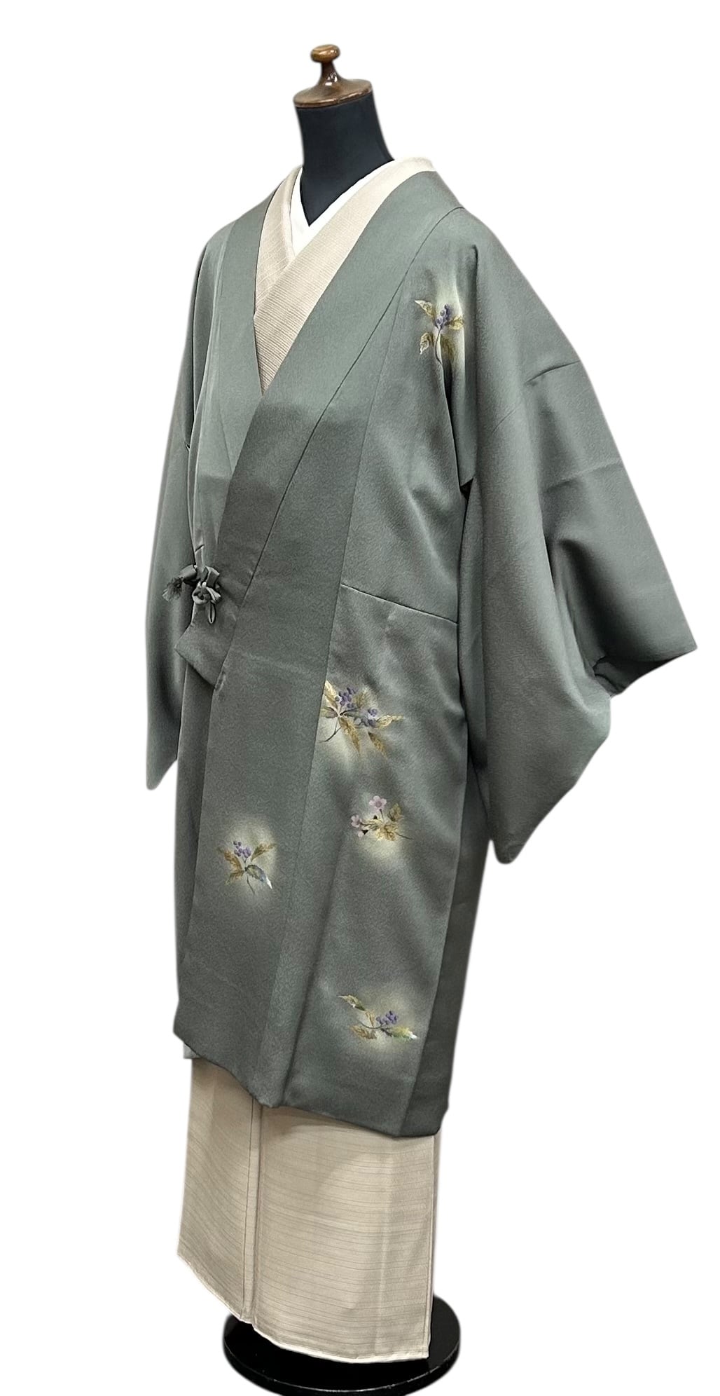 こちらは、上品な草花が描かれた道中着です。暗めの青鈍色のちりめん地は、凹凸のある表面感が特徴で、優雅な雰囲気を醸し出します。金、紫苑色、紅藤色、暗めの青緑色などの美しいの草花模様が施されています。しっとりとした肌触りは心地の良い着用感をもたらしてくれます。