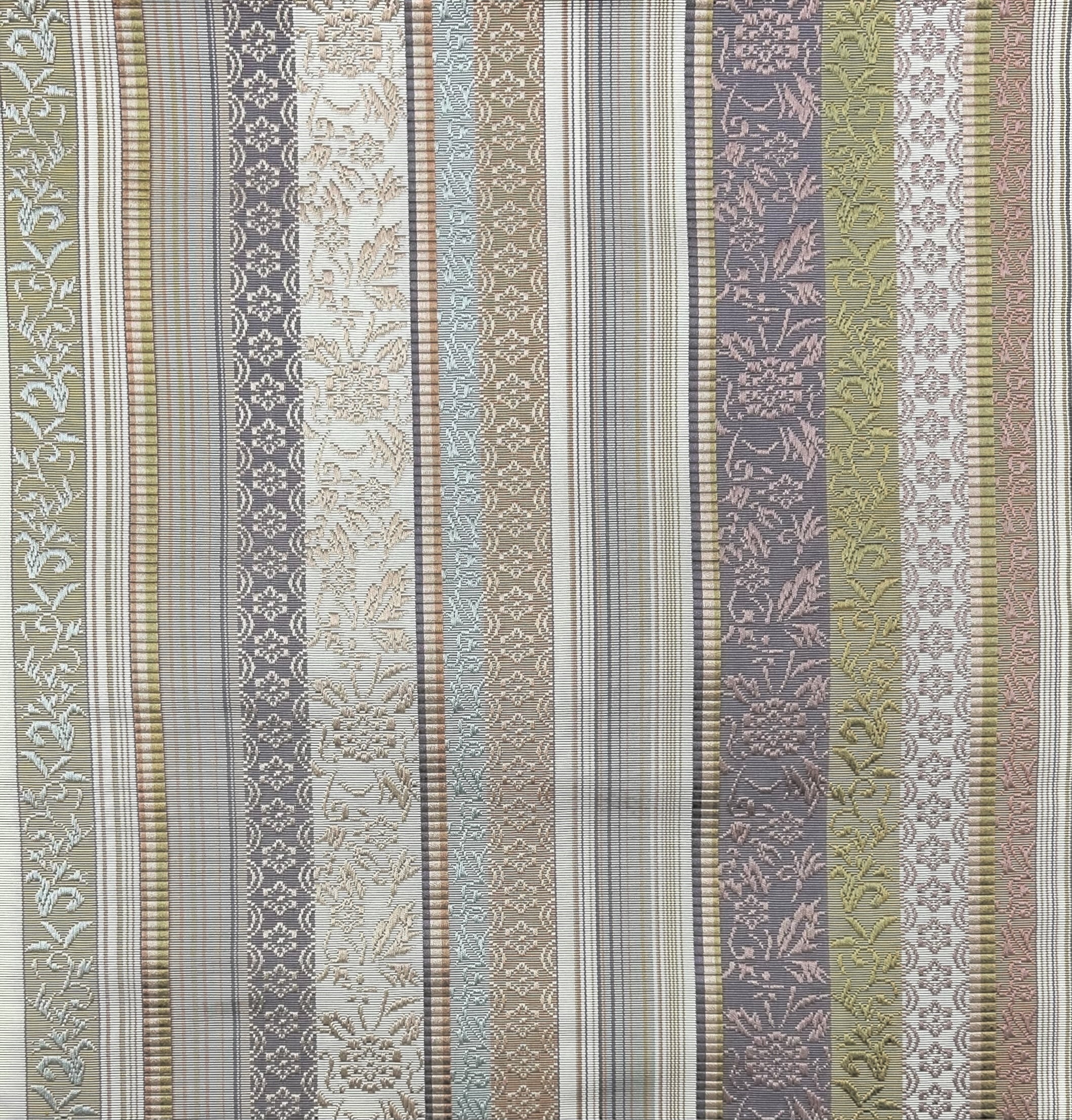 こちらは、優美な色合いが魅力の名古屋帯です。練色の地に、紫苑色、曙色、黄土色などのクスミカラーを多彩に使ったデザインは、縦縞と草花の美しい柄が施されており、軽やかな印象を与えます。ハリのあるしっかりとした生地感は、締めやすさと存在感を兼ね備え、特別なシーンや日常使いにも最適です!