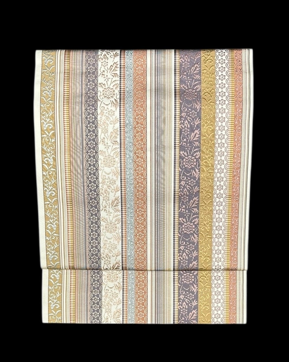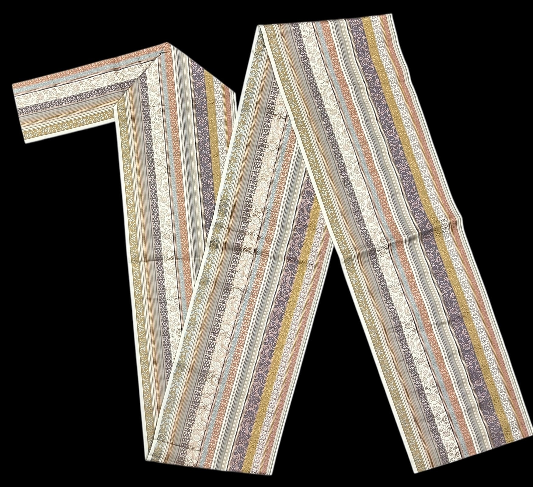 八寸名古屋帯 博多 練色 紫苑色 曙色 黄土色など 縦縞 草花 長さ 378㎝ Q5730