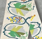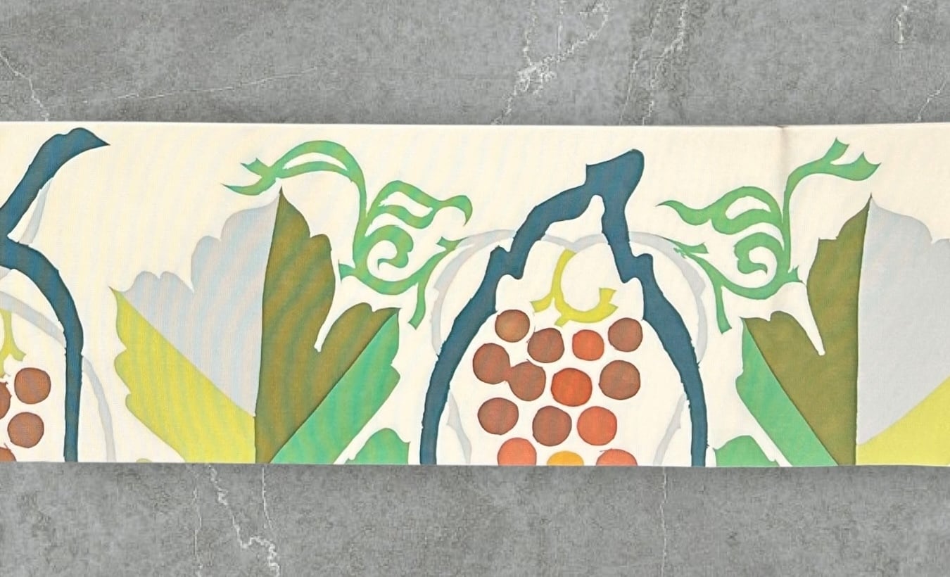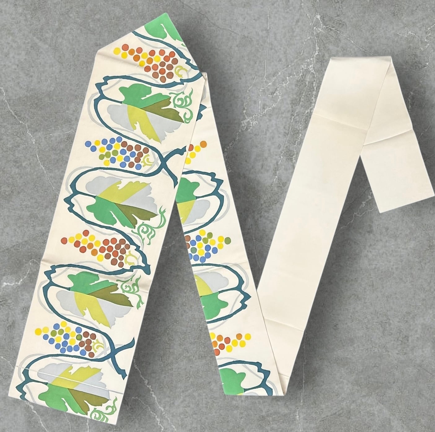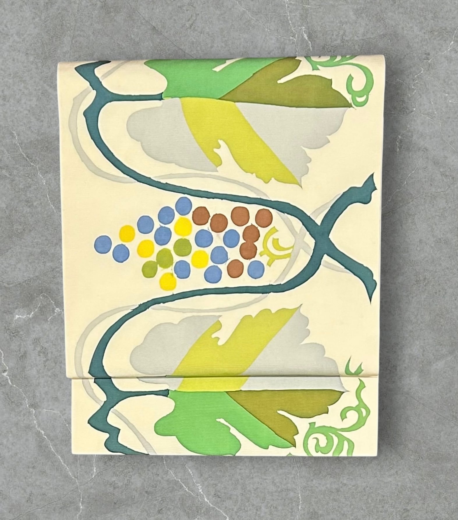 こちらは、洗練されたデザインが魅力の塩瀬の名古屋帯です。鳥の子色の地にハリのある生地が特徴で、グリーン系・茶系・ブルー系などの抽象的なブドウと葉が描かれた華やかな一品です!なめらかな質感は着用時の快適さをサポートします。