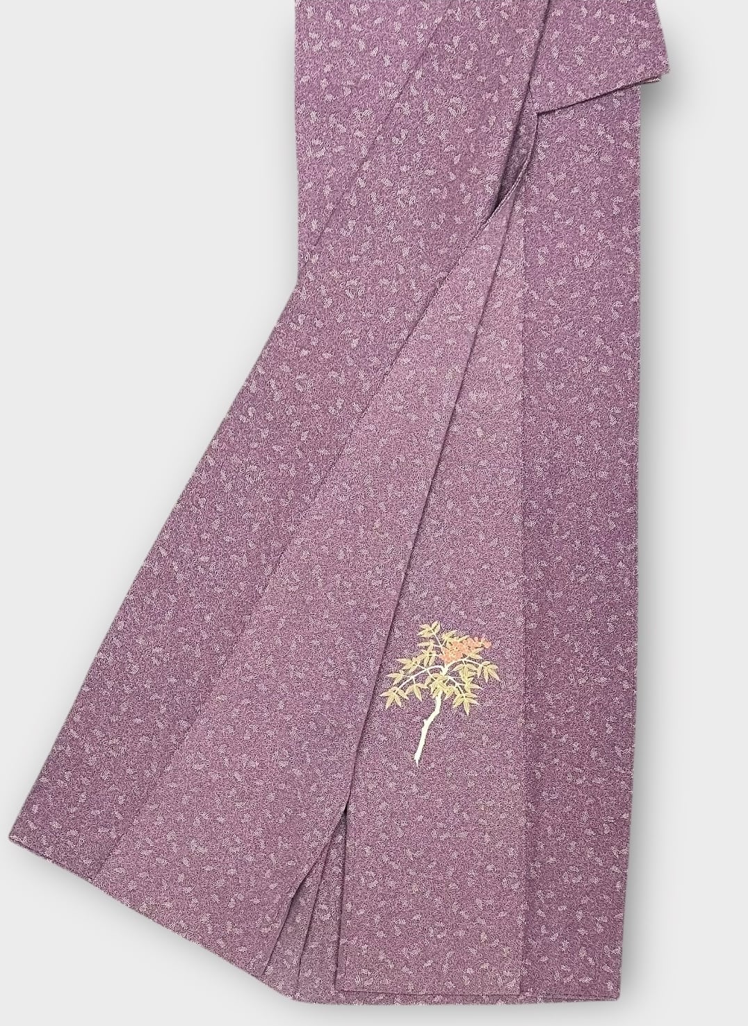 こちらは、優雅さと伝統を感じさせる江戸小紋のお着物です。二藍色の地に植物の実と葉が施されたデザインは、落ち着いた雰囲気を醸し出しながらも、さりげなく華やかさを添えています!八掛には植物の柄が施されており、細部にまでこだわりが感じられます。しっとりとした肌触りが特徴で、着用時の快適さを実現しています。一部しつけ糸つき。
