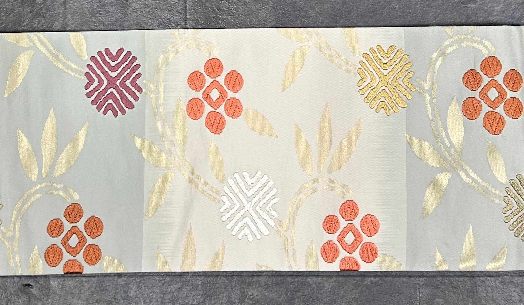 名古屋帯 三越 練色と薄い青磁鼠色の横段の地 上品な笹蔓文様 長さ361 ㎝ Q5277