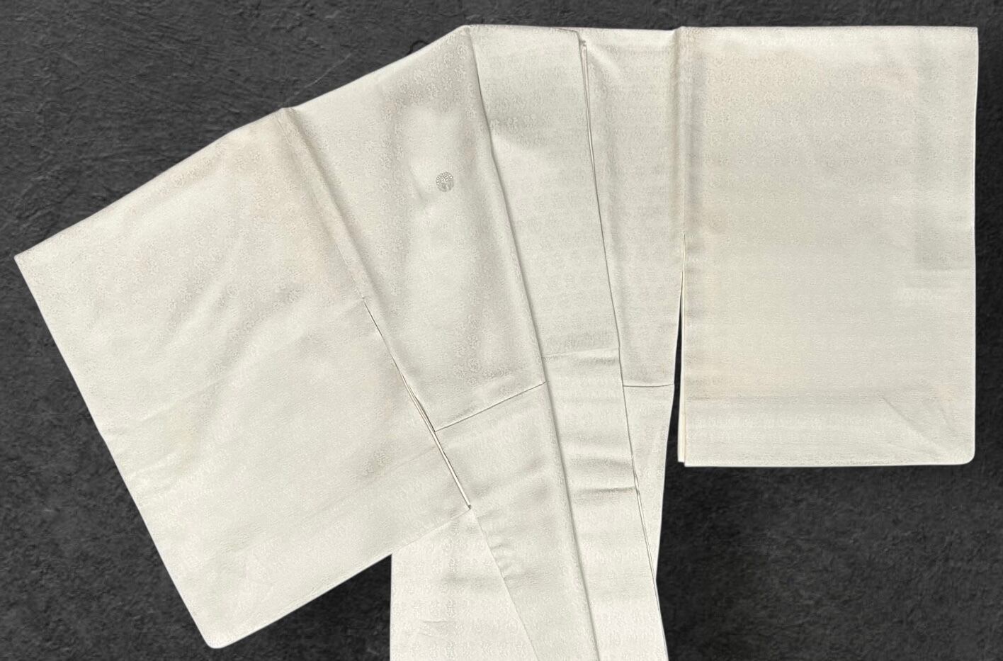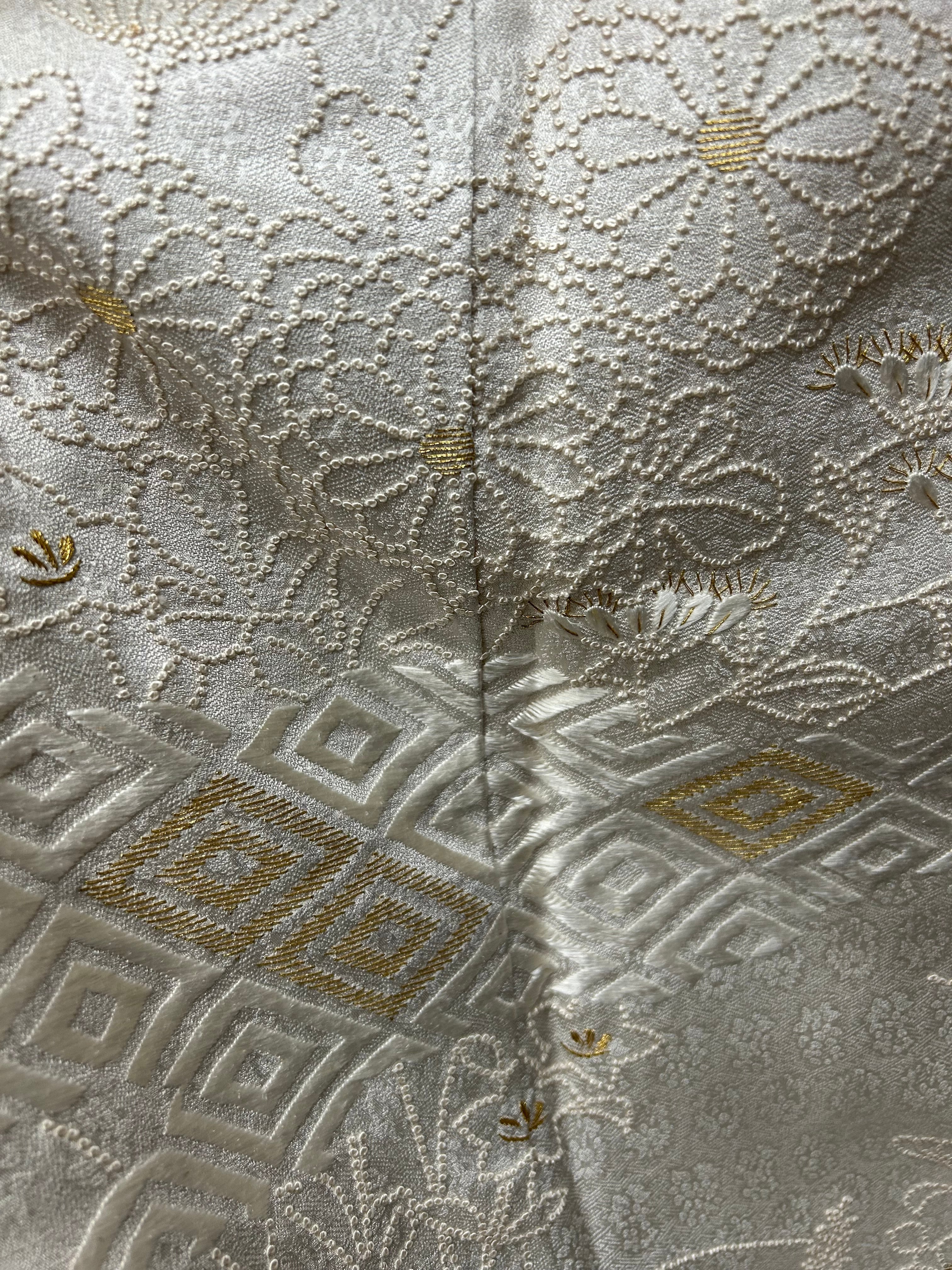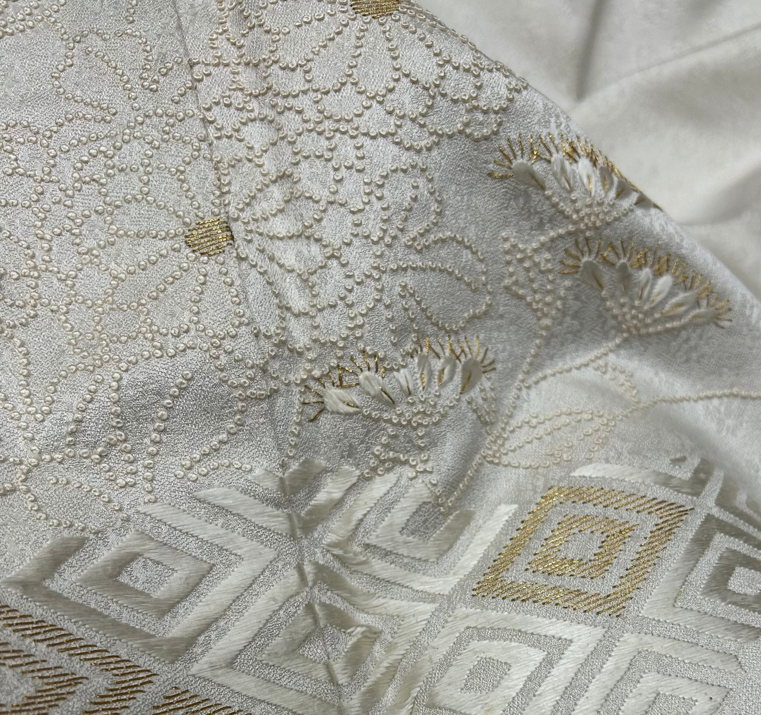 こちらは、優雅な色留袖のお着物です。象牙色を基調とした地に細かい地紋が施され、しっとりとした光沢感が魅力的です!相良刺繍により、鳥の子色や金糸で表現された四季の花が華やかさを引き立てています。高級感あふれる、特別な場にふさわしい一品です。五つ紋(ぬき紋)つき。
