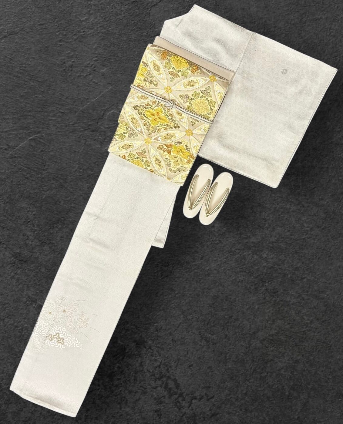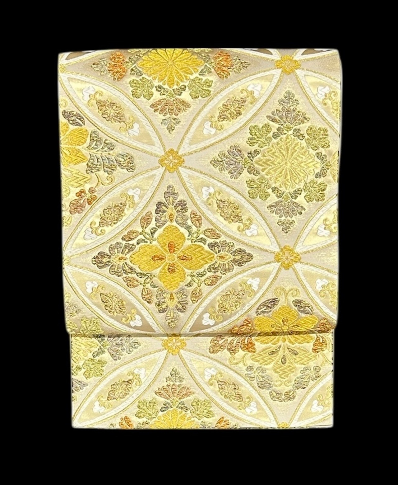 こちらは、豪華なデザインの袋帯です。練色を基調とした生地に、金糸の地が施されており、大きな七宝花菱の柄が目を引きます!繊細な金糸の濃淡が美しく、淡いお色味が上品さを添えています。程よいハリ感があり、着用時には優れたフィット感が実現されています。