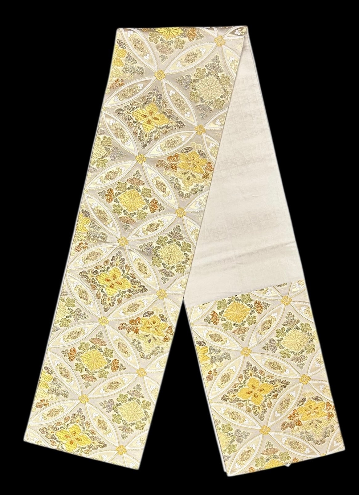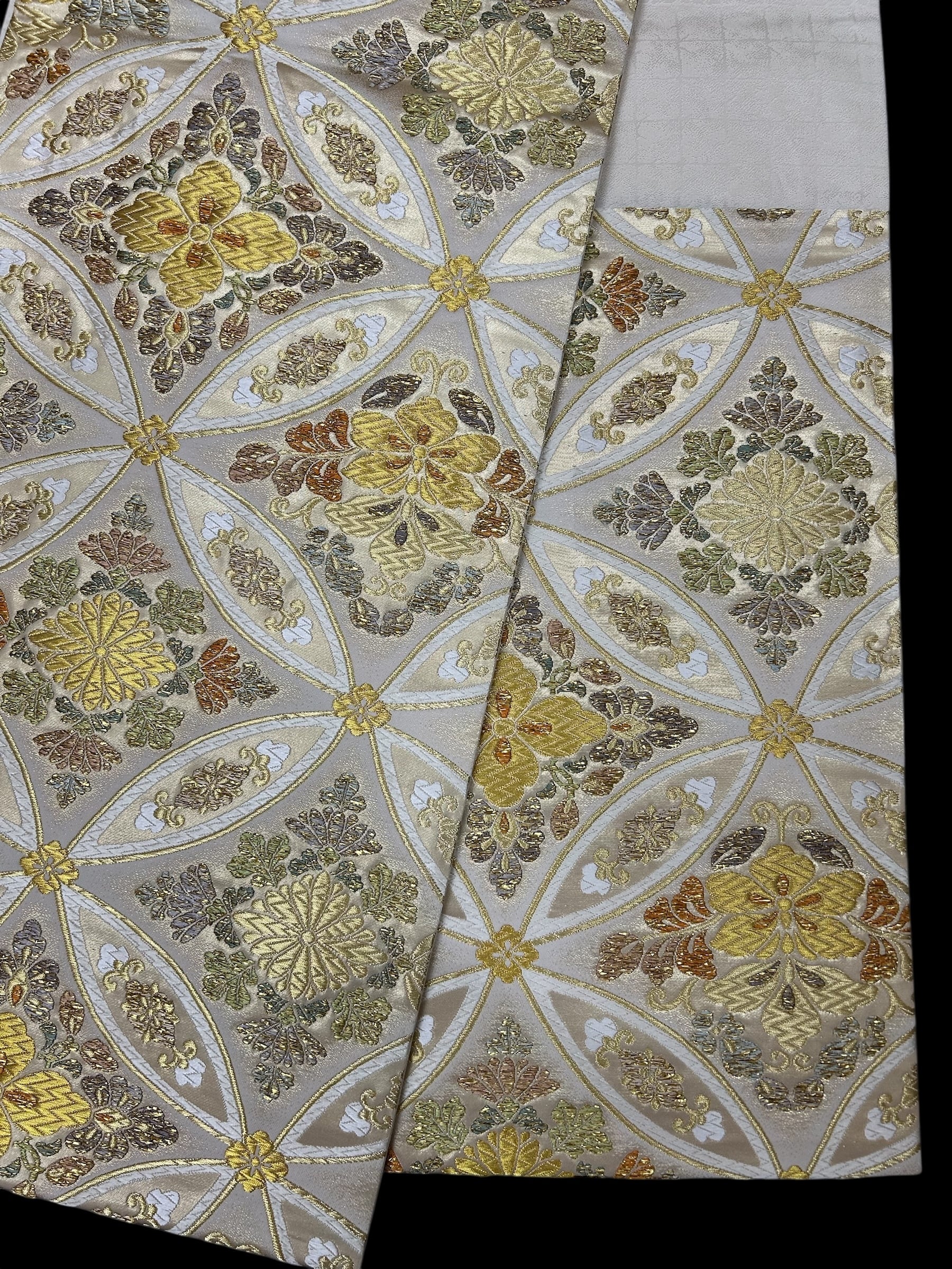 袋帯 銀座世きね 練色に金糸が織り込まれた美しい地 豪華な七宝花菱 長さ 443㎝ Q5845
