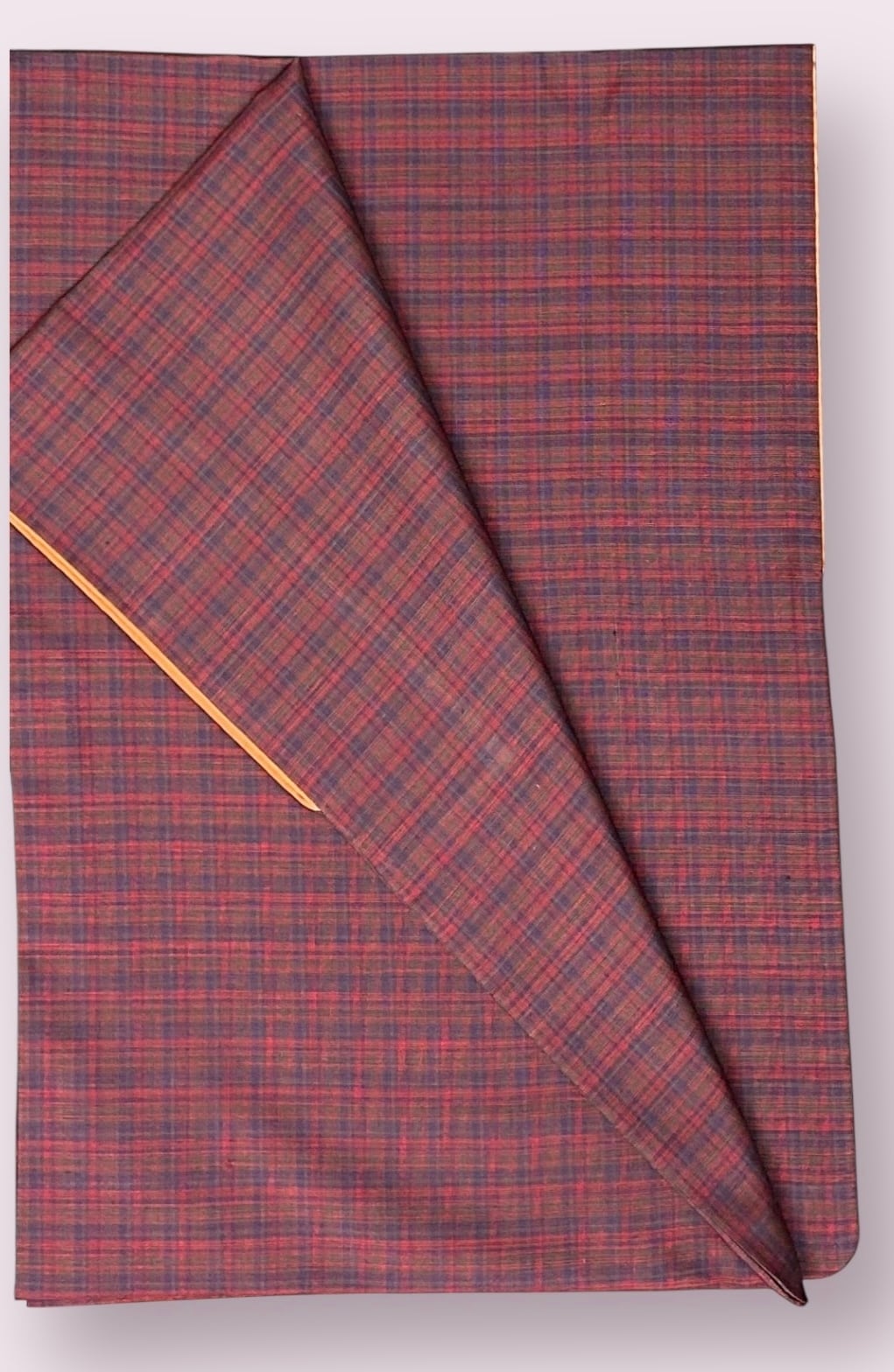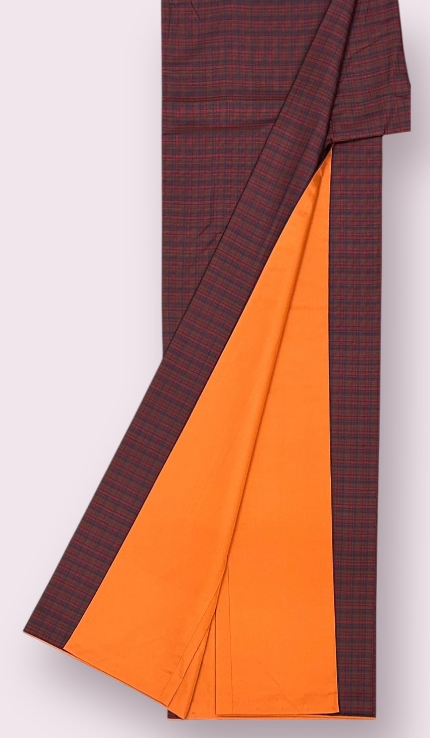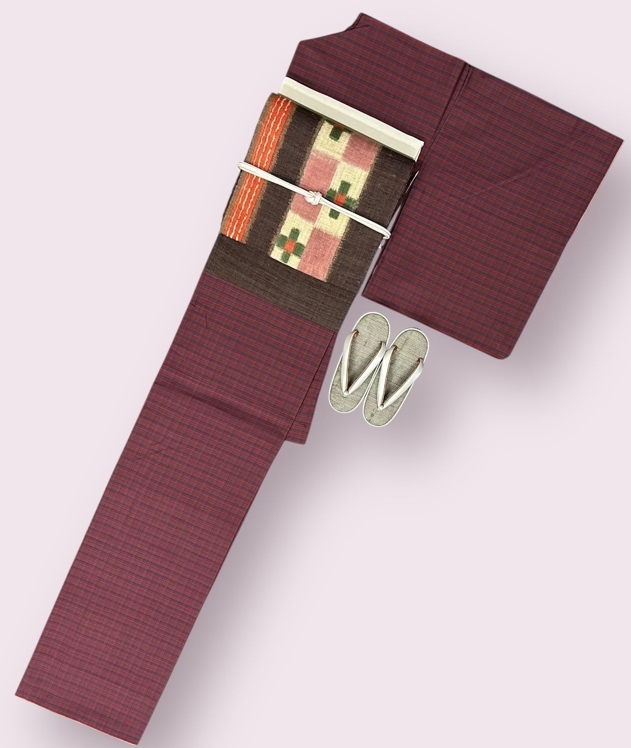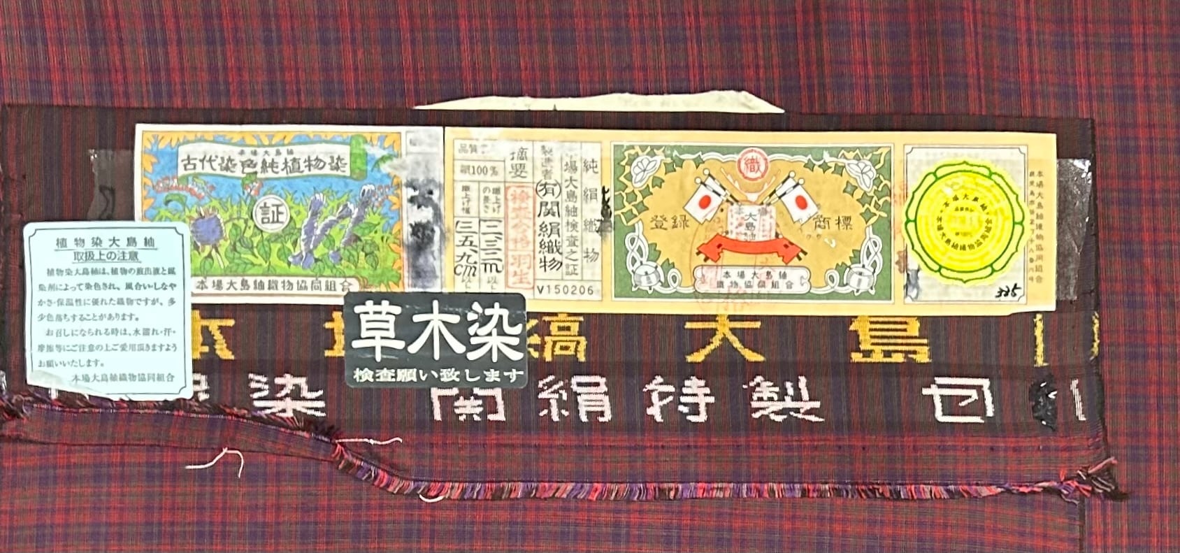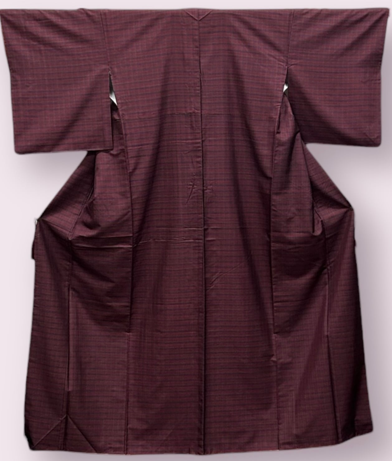 こちらは、五倍子、紫根、蘇芳を使ったお色味がそのままの古代染色純植物染、 関絹織物さんのたいへん素晴らしい縞大島です。しなやかな肌触りが心地よく、着心地抜群です!作家物で落款つき、証紙 反端もついております。