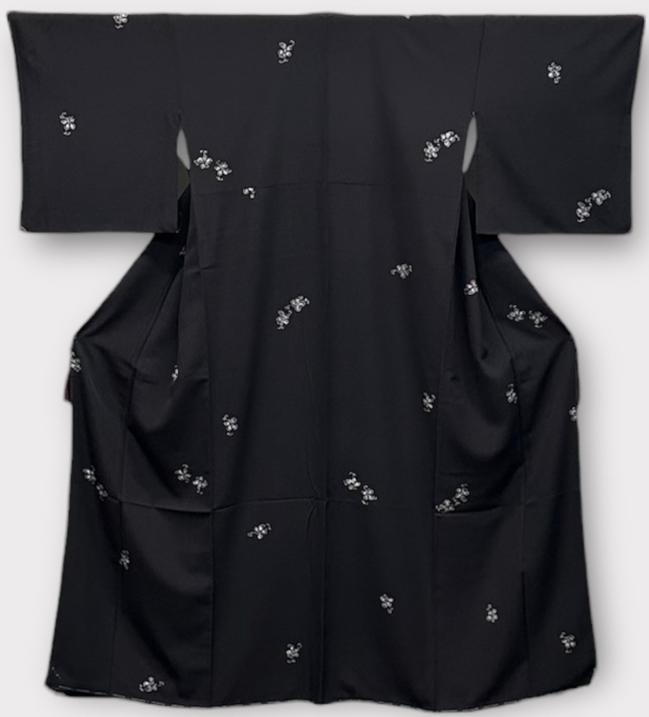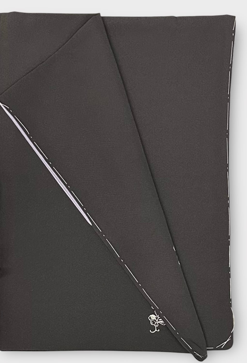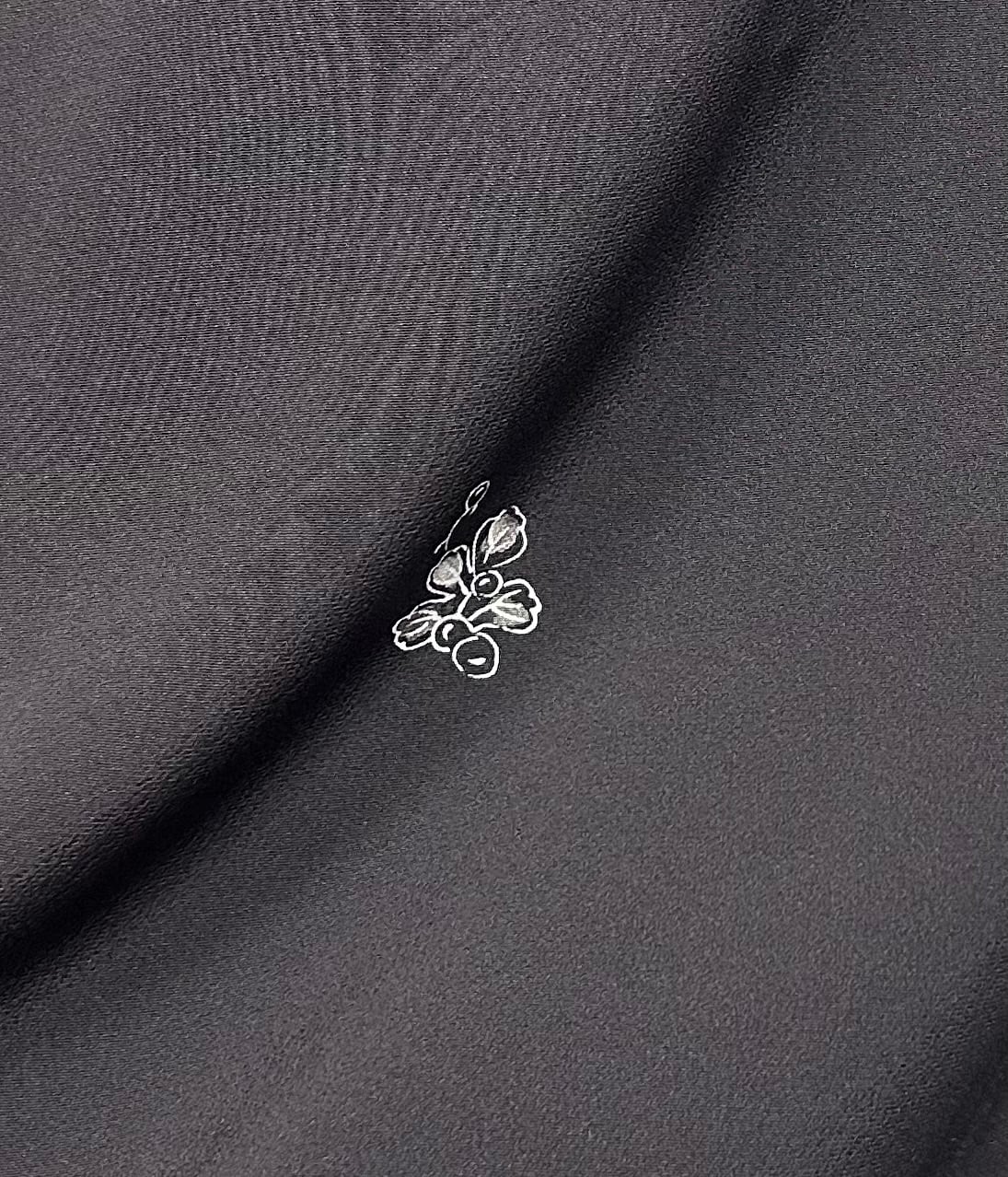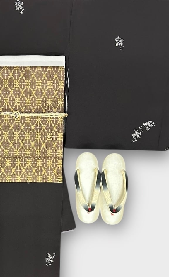 こちらは、しっとりとした烏羽色の地に、白と墨色の小さなぶどうのような飛び柄があしらわれた上品な小紋です。極上のさらりとした肌触りが特徴で、さまざまなシーンで華やかな存在感を放つ一品です。しつけ糸つき、高島屋お誂え品。