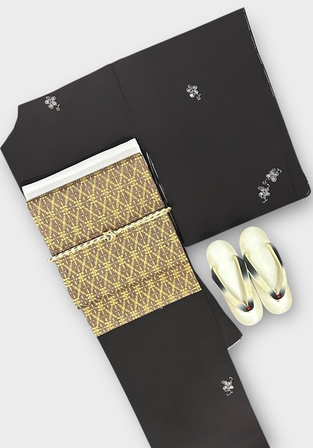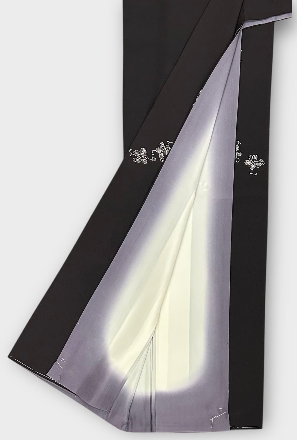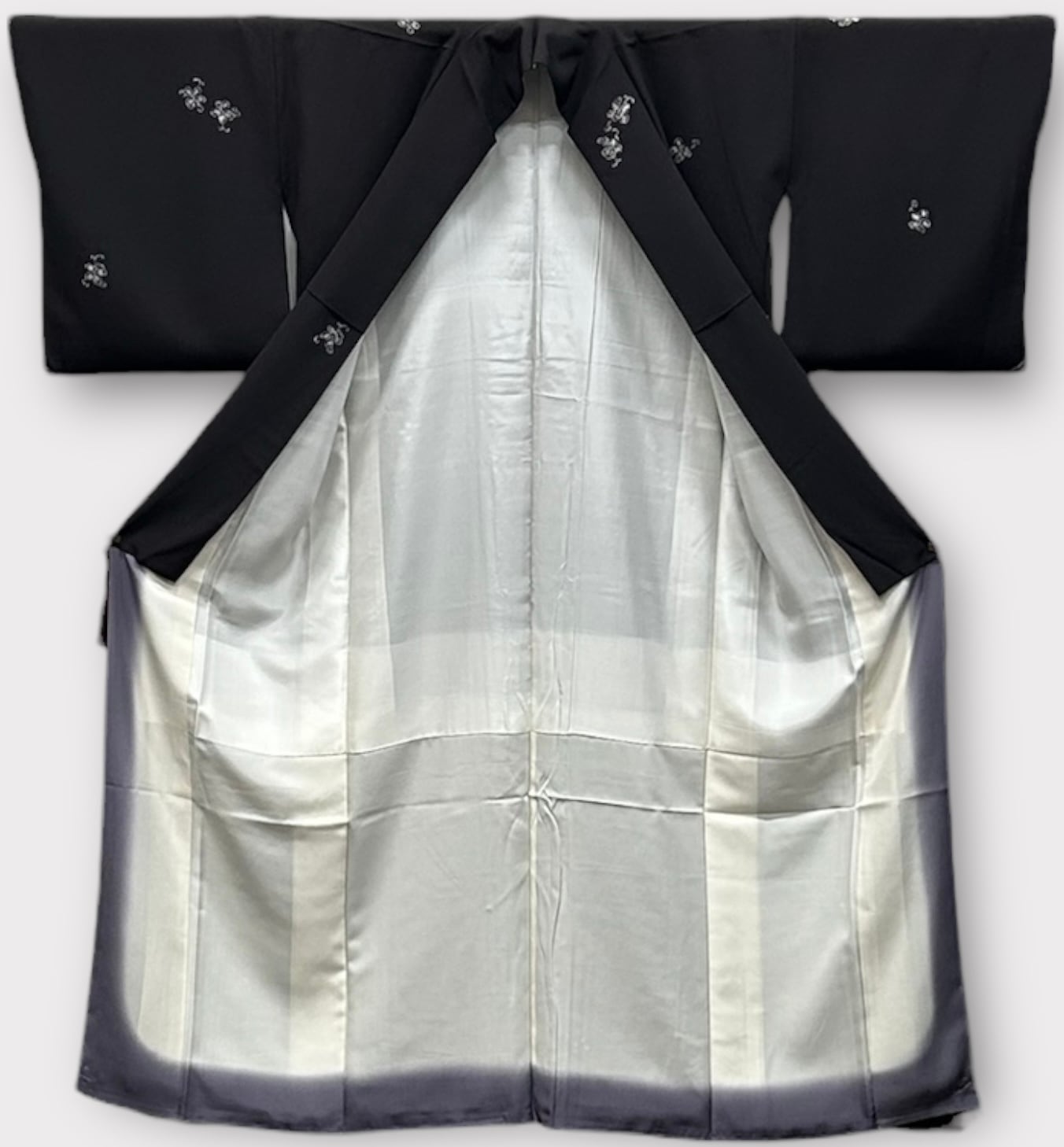こちらは、しっとりとした烏羽色の地に、白と墨色の小さなぶどうのような飛び柄があしらわれた上品な小紋です。極上のさらりとした肌触りが特徴で、さまざまなシーンで華やかな存在感を放つ一品です。しつけ糸つき、高島屋お誂え品。