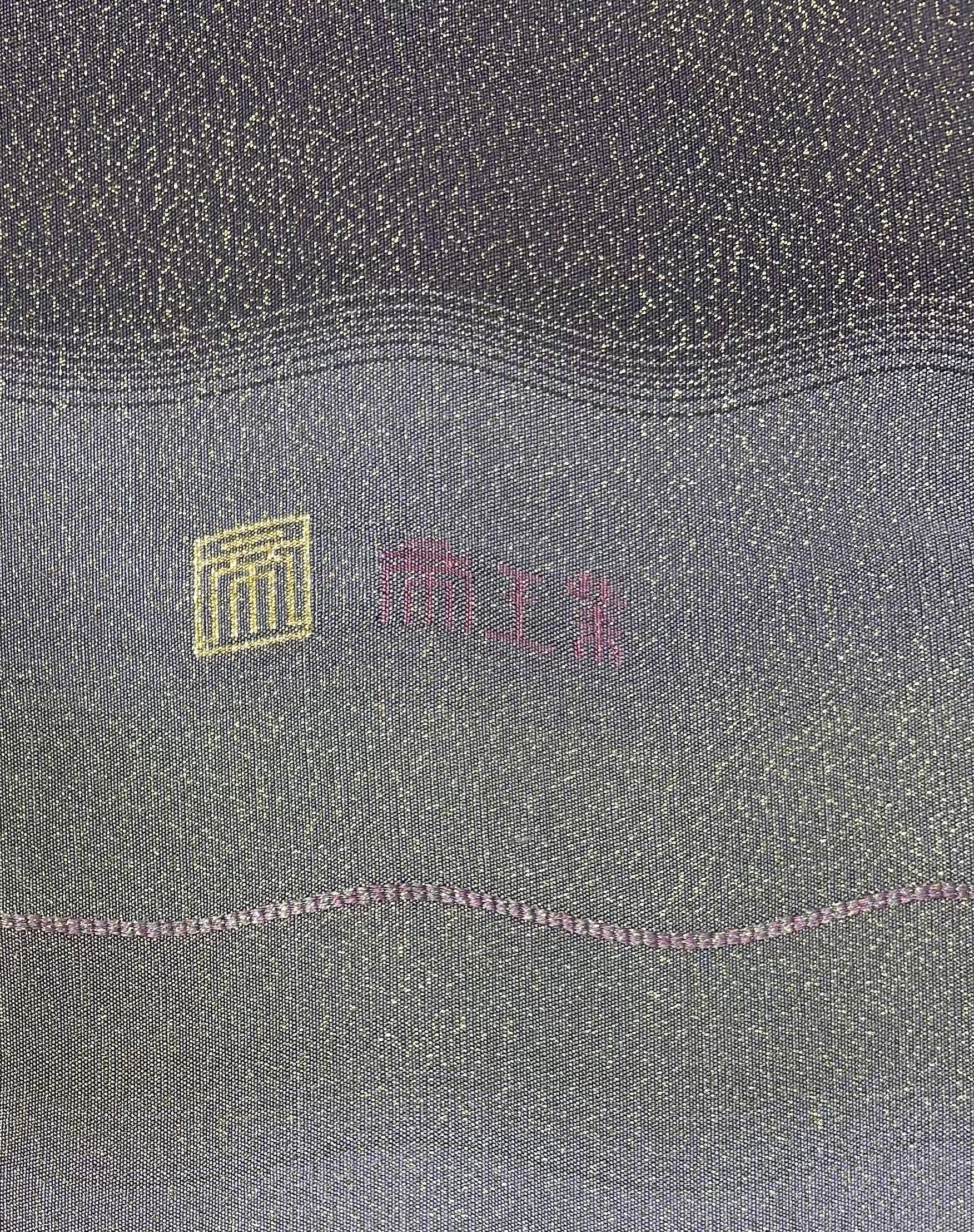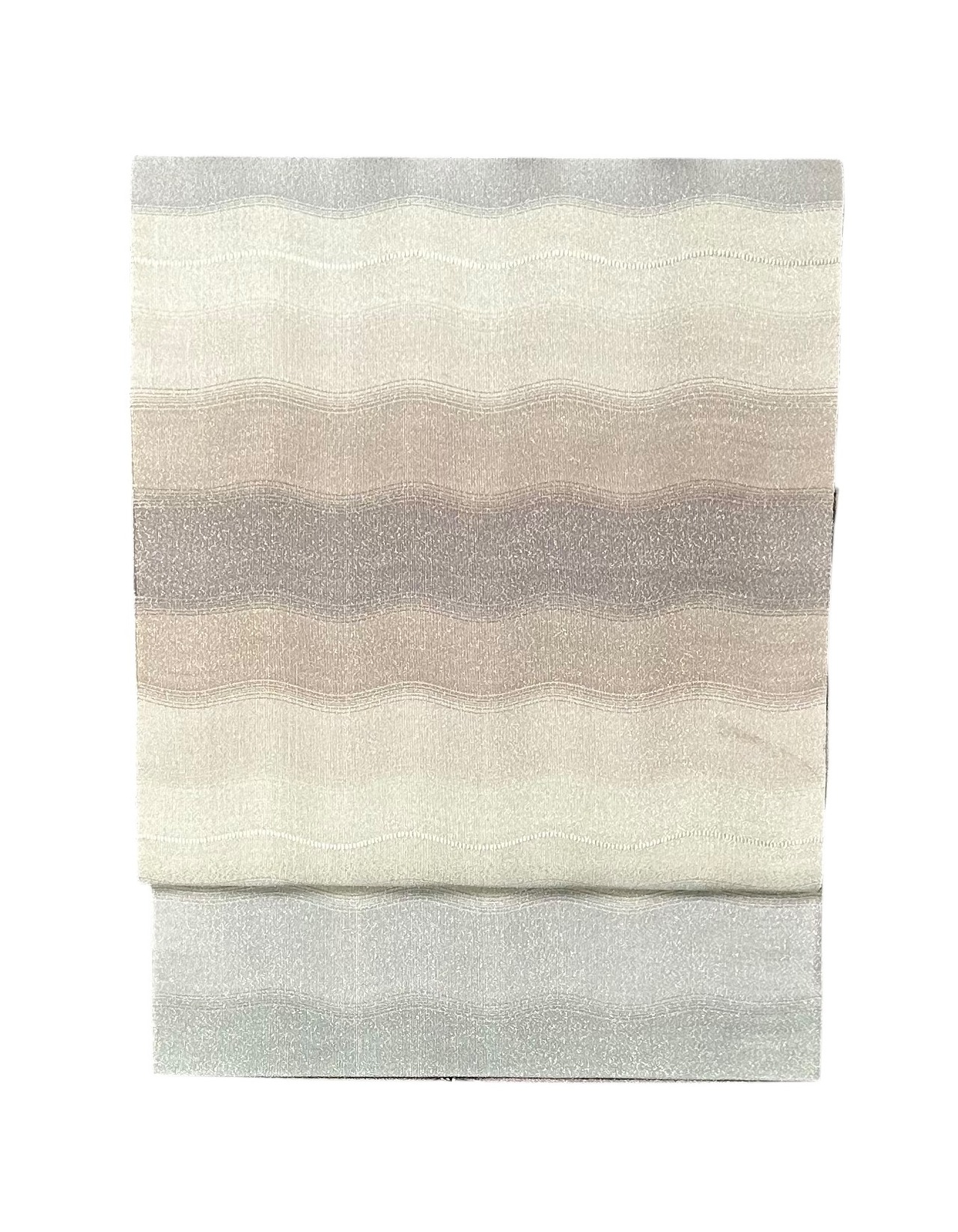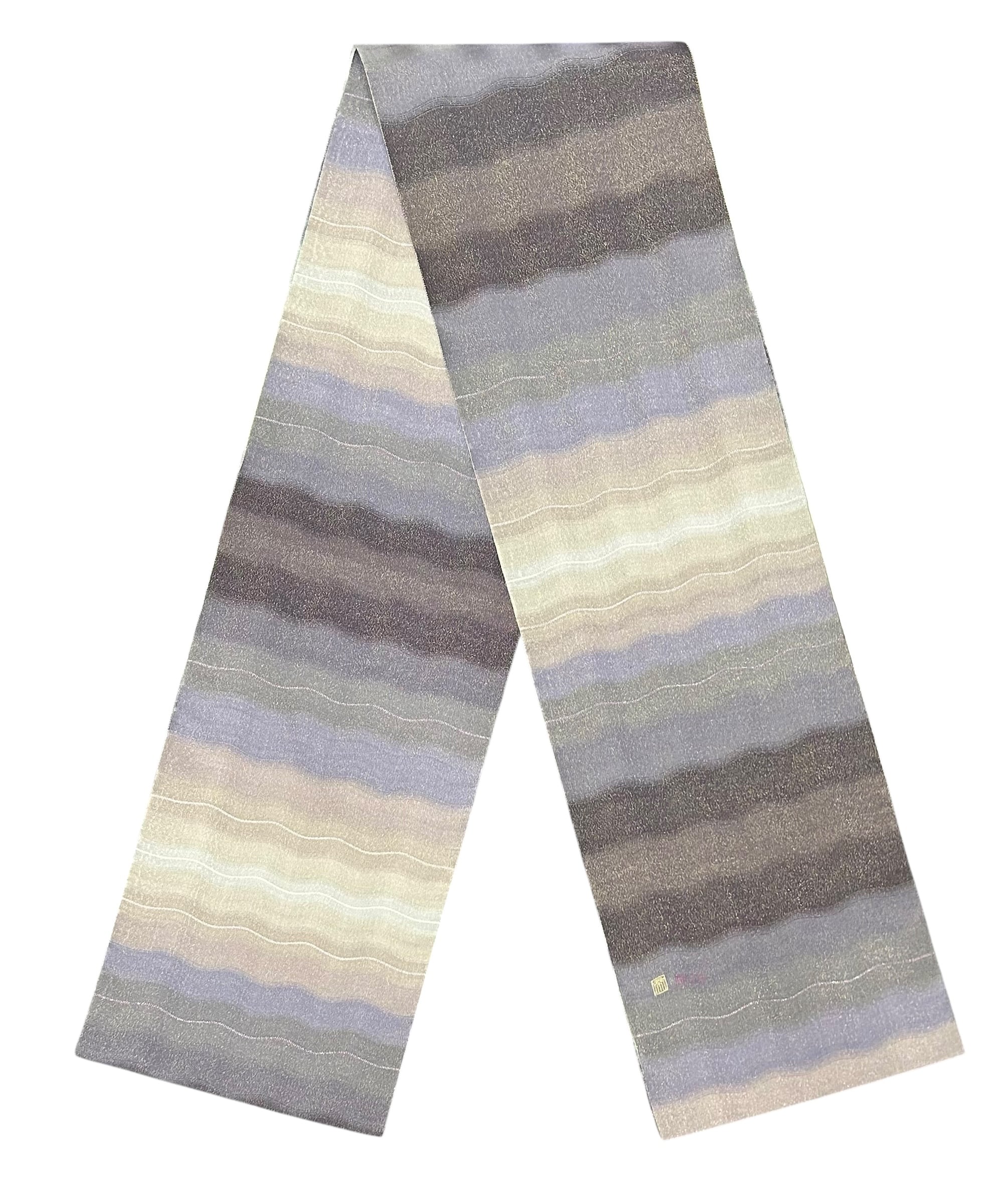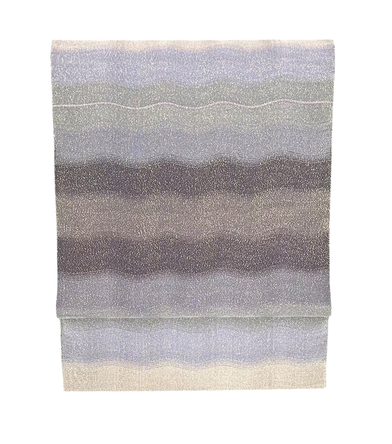 こちらは、優雅な帝王紫のグラデーションが魅力的な両面全通のリバーシブルの袋帯です。波打つようなラメ入りの横段が施されており、表面は濃い目の色合いの似せ紫から藤煤竹、薄鼠、鳩羽鼠、霞色などの美しいグラデーションが広がっています。裏面は明るめの砂色、亜麻色、煤色などで、コーディネートによって様々な雰囲気を楽しんでいただけます!落款も施されており、伝統の技が光る一品です。