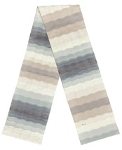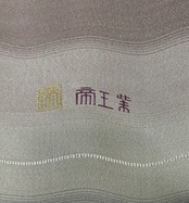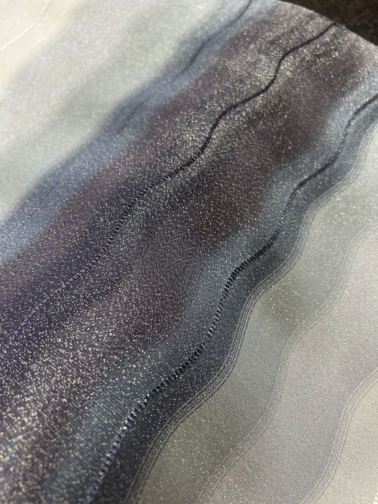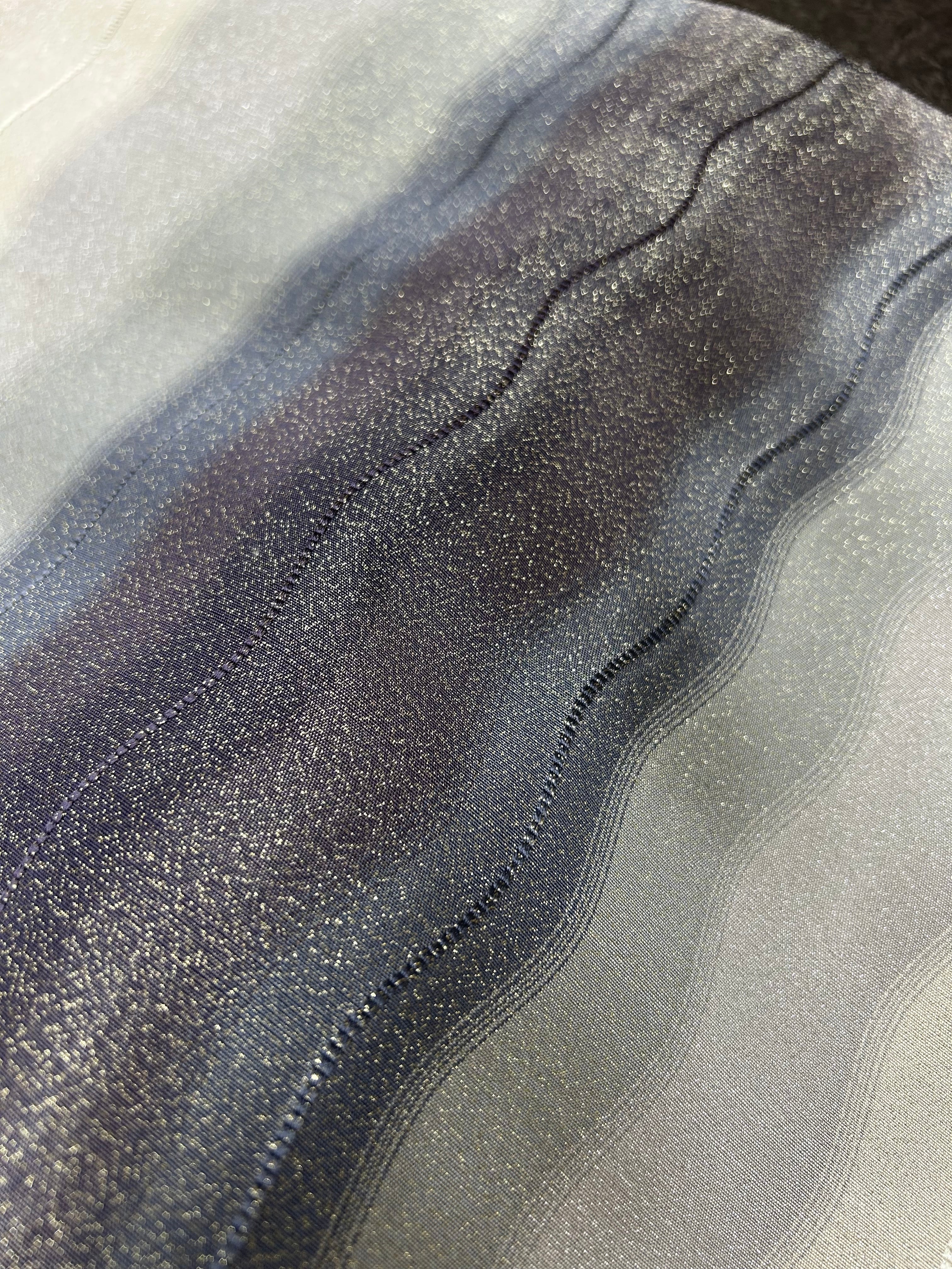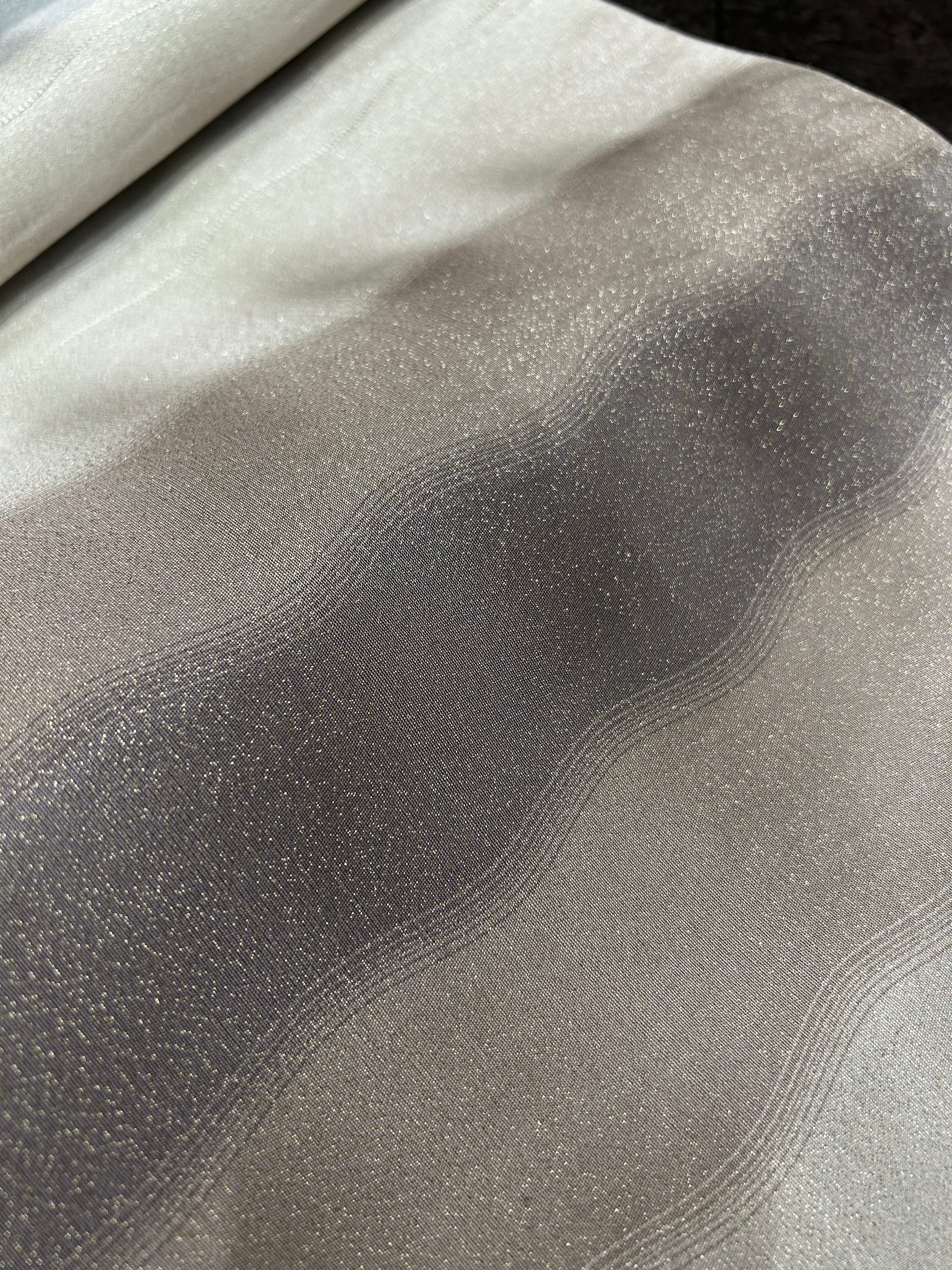 こちらは、優雅な帝王紫のグラデーションが魅力的な両面全通のリバーシブルの袋帯です。波打つようなラメ入りの横段が施されており、表面は濃い目の色合いの似せ紫から藤煤竹、薄鼠、鳩羽鼠、霞色などの美しいグラデーションが広がっています。裏面は明るめの砂色、亜麻色、煤色などで、コーディネートによって様々な雰囲気を楽しんでいただけます!落款も施されており、伝統の技が光る一品です。