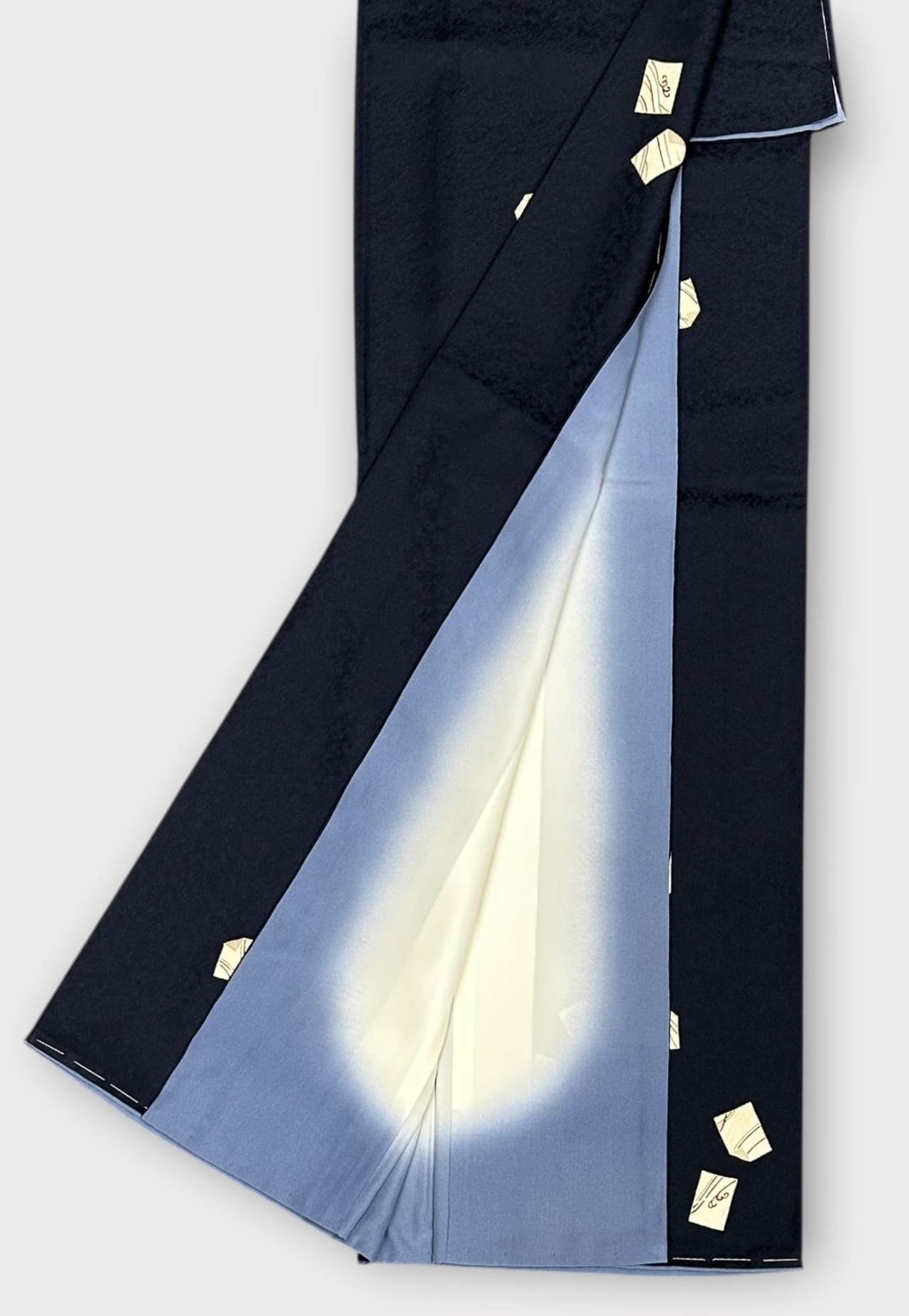 こちらは、落ち着きのある藍鉄色の地に、美しい光沢感を持つ小紋の着物です。光の加減によって浮かび上がる細やかな地紋が、シンプルながらも上品さを引き立てています!ほんのり金彩で囲まれた生成り色に色の入った色紙のような柄が、上品な飛び柄としてあしらわれており、どんなシーンにも華やかさを添えます。西武百貨店お誂え、しつけ糸もつき。サラッとした肌触りが特徴で、着心地の良さを実感していただけることでしょう。