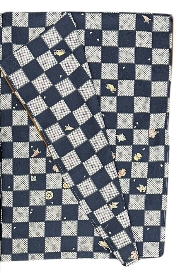 魅力的な市松模様が特長の小紋です!藍鉄と生成りの落ち着いたカラーリングが非常に上品で、鹿の子柄とランダムに描かれた桜の花びらが可愛らしさをプラスしています。また、藍鉄色の中に淡い退紅、山吹茶、老竹色などの色合いで描かれた宝尽くし可愛らしさを引き立てます。サラッとした肌触りは着用するたびに心地よさを感じさせます。
