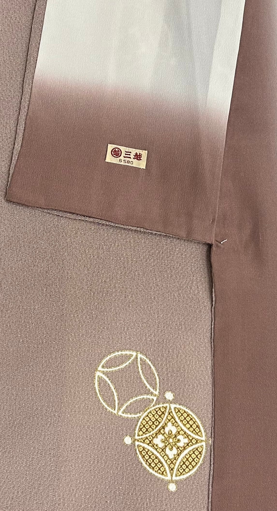 上品で華やかな小紋のお着物です!薄めの梅染色のちりめん地に、ほんのり金彩に囲まれた白や山吹色などの疋田柄の七宝文様が施されています。しっとり柔らかい肌触りが特徴で、着ることで心地よさと美しさを演出する素敵な一品です。しつけ糸つき、三越さんお誂えの素晴らしい逸品です。