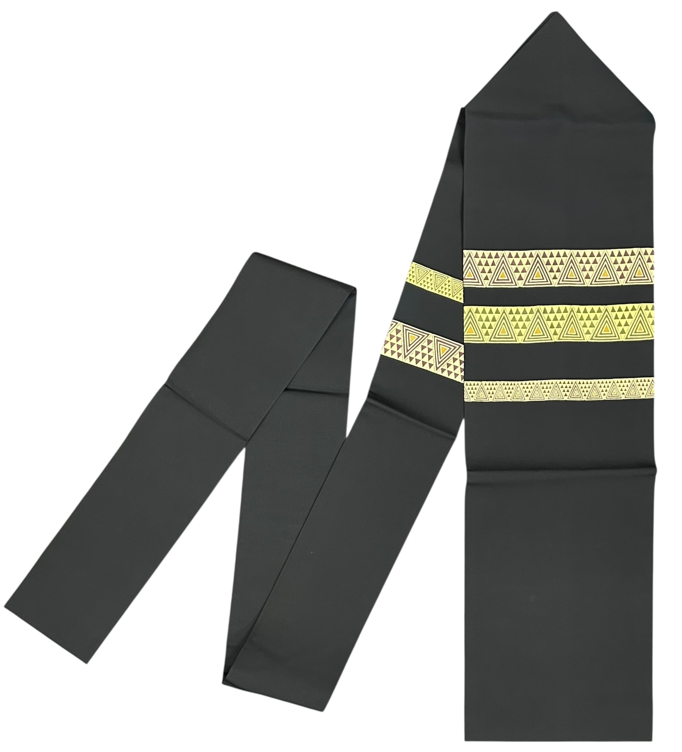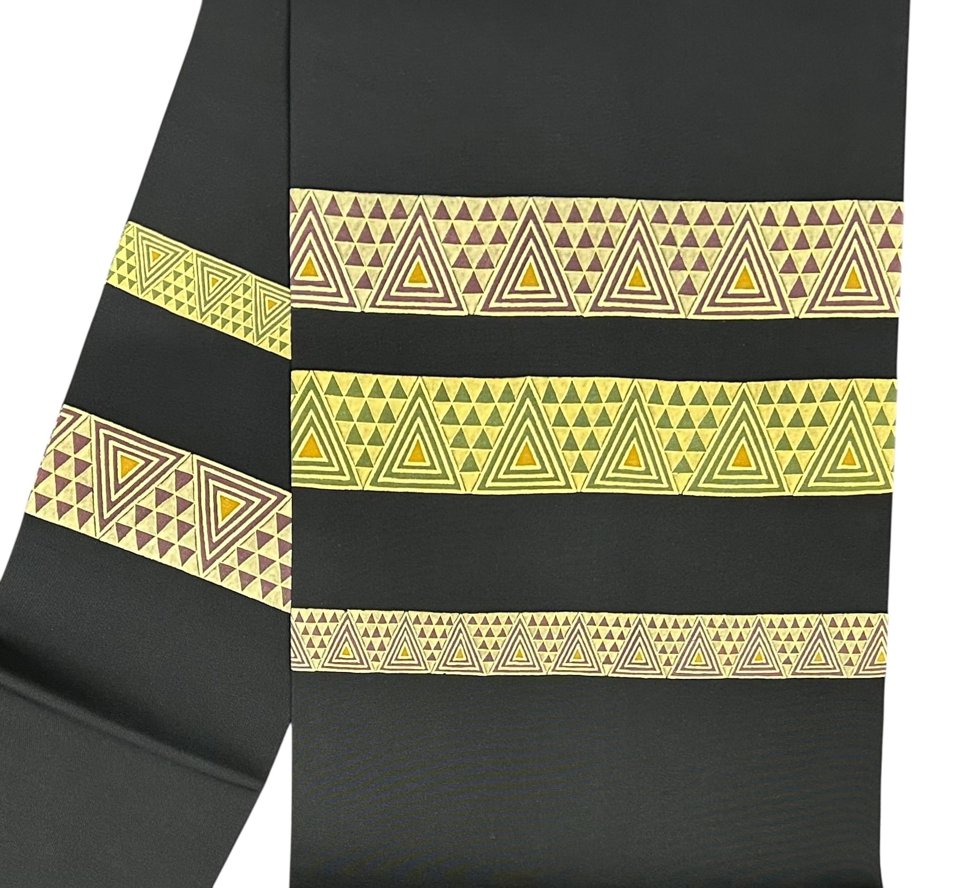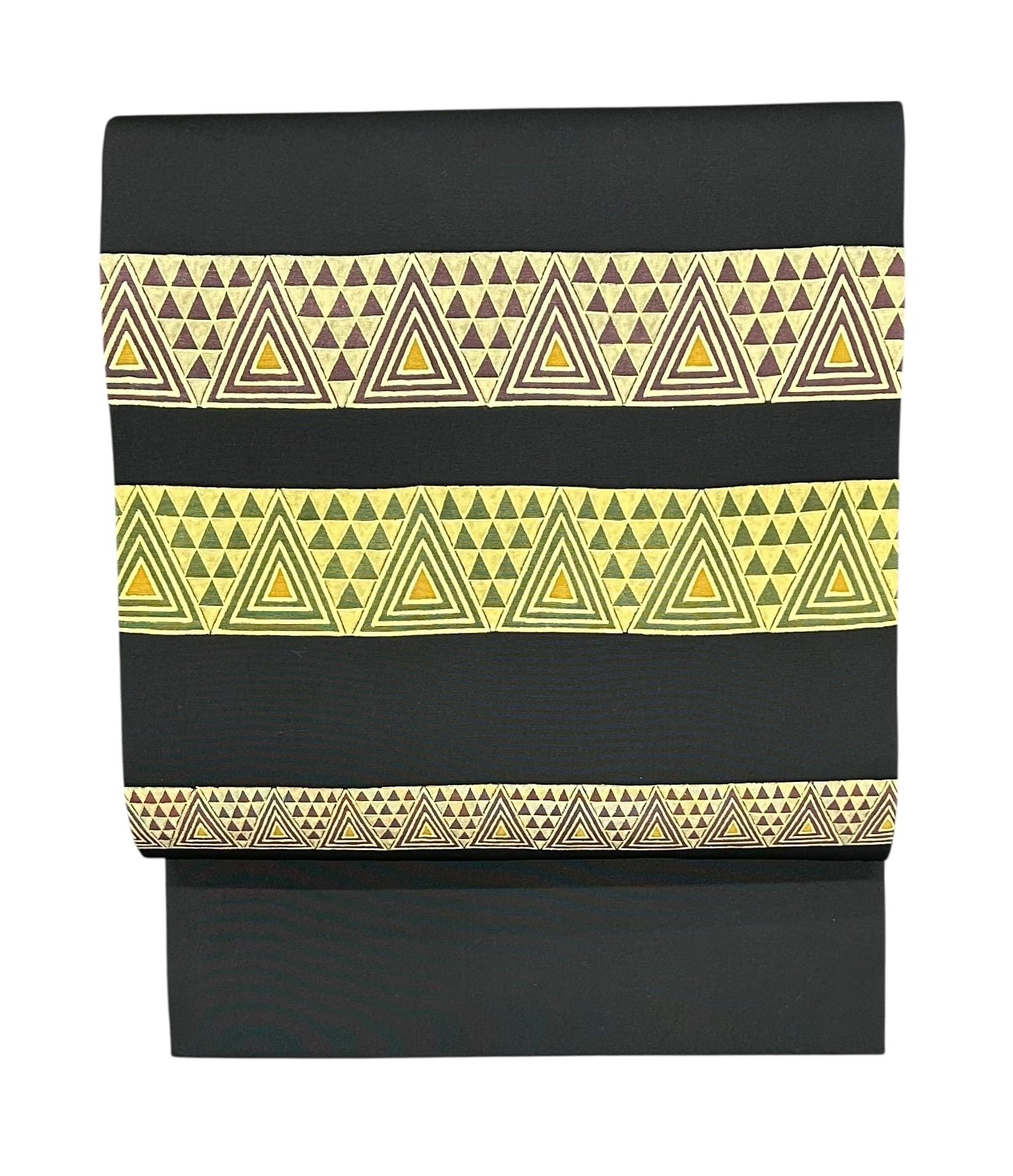 こちらは、魅力的なデザインの名古屋帯です!黒地に美しい鱗模様が施され、渋みのきいた金のアクセントが高級感を引き立てます。麹鹿色と赤褐色の微妙なコントラストが、着物スタイルを華やかに演出する素敵な一品です。ほどよいハリのある仕上がりが、着用時の心地よさと美しさを両立させています。ちた和さんお誂えの素晴らしい逸品です。