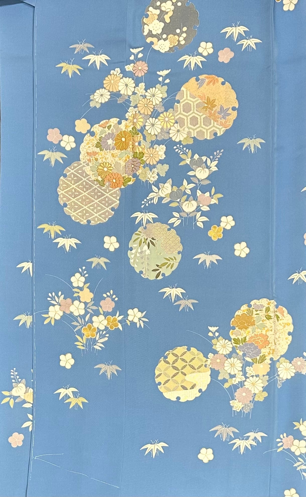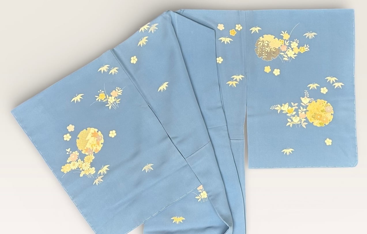 付下げ訪問着 高島屋 濃いめの勿忘草色 雪輪に四季の花 一つ紋 未使用品 裄丈 65.5㎝ K6096