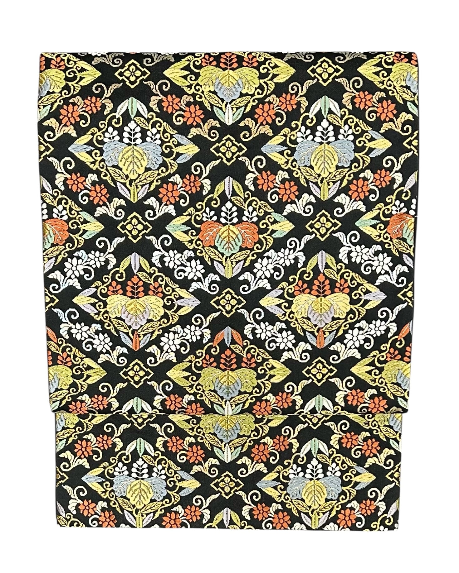 袋帯 黒地 豪華な菱文のような草花 長さ 434㎝ Q6318