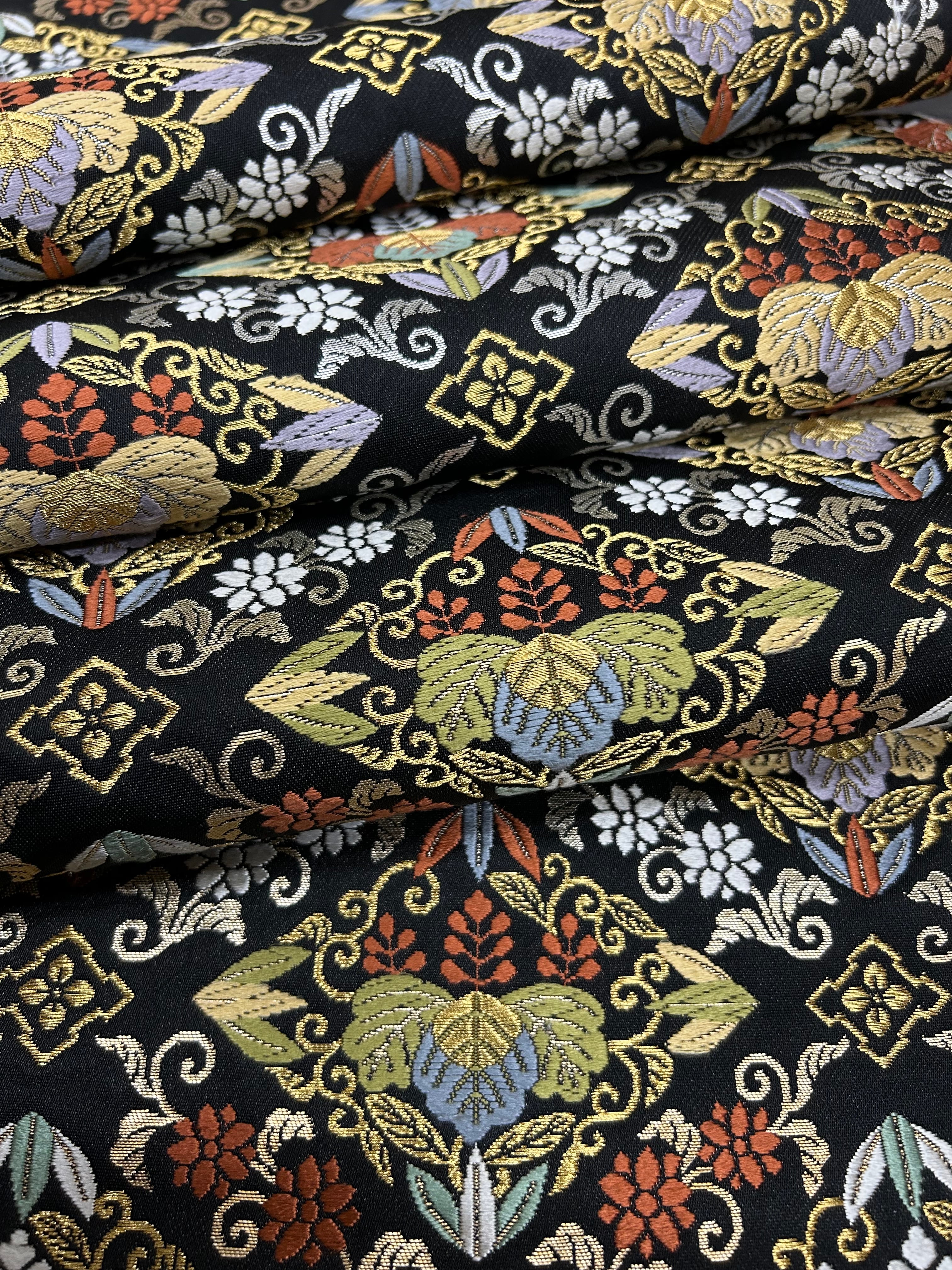 黒地に華やかな金、銀、白、真赭色、薄青色といった美しいお色味が、上品な印象を与えます。菱文のような草花の模様は非常に豪華で、ハリのあるしっかりとした生地が特徴です。特別な日の装いにぴったりな一品です。