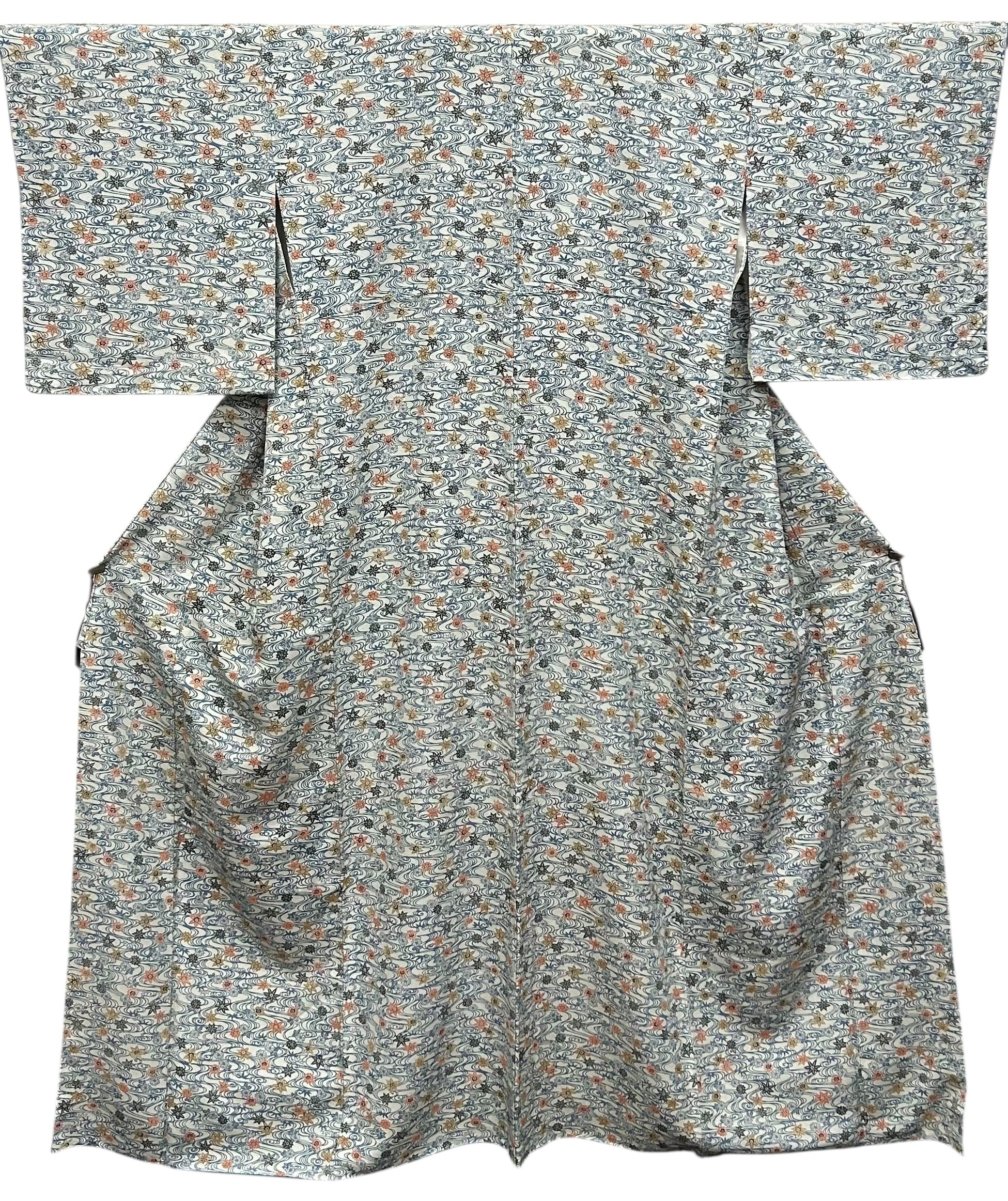 小紋 型染め 薄めの灰黄緑色地 流水 裄丈 68㎝ K6369