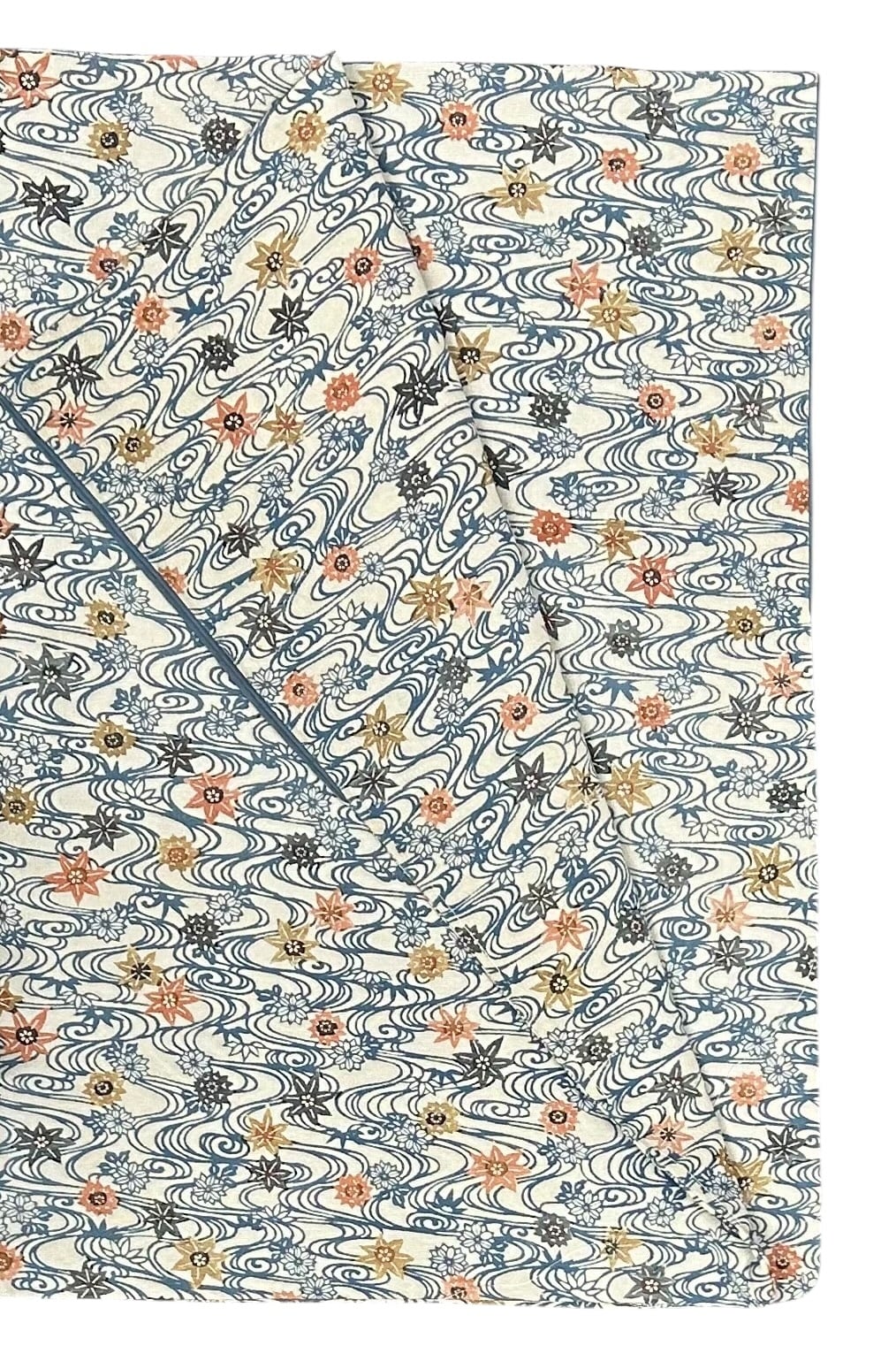 薄めの灰黄緑色地に流水紋様の型染めの小紋です。