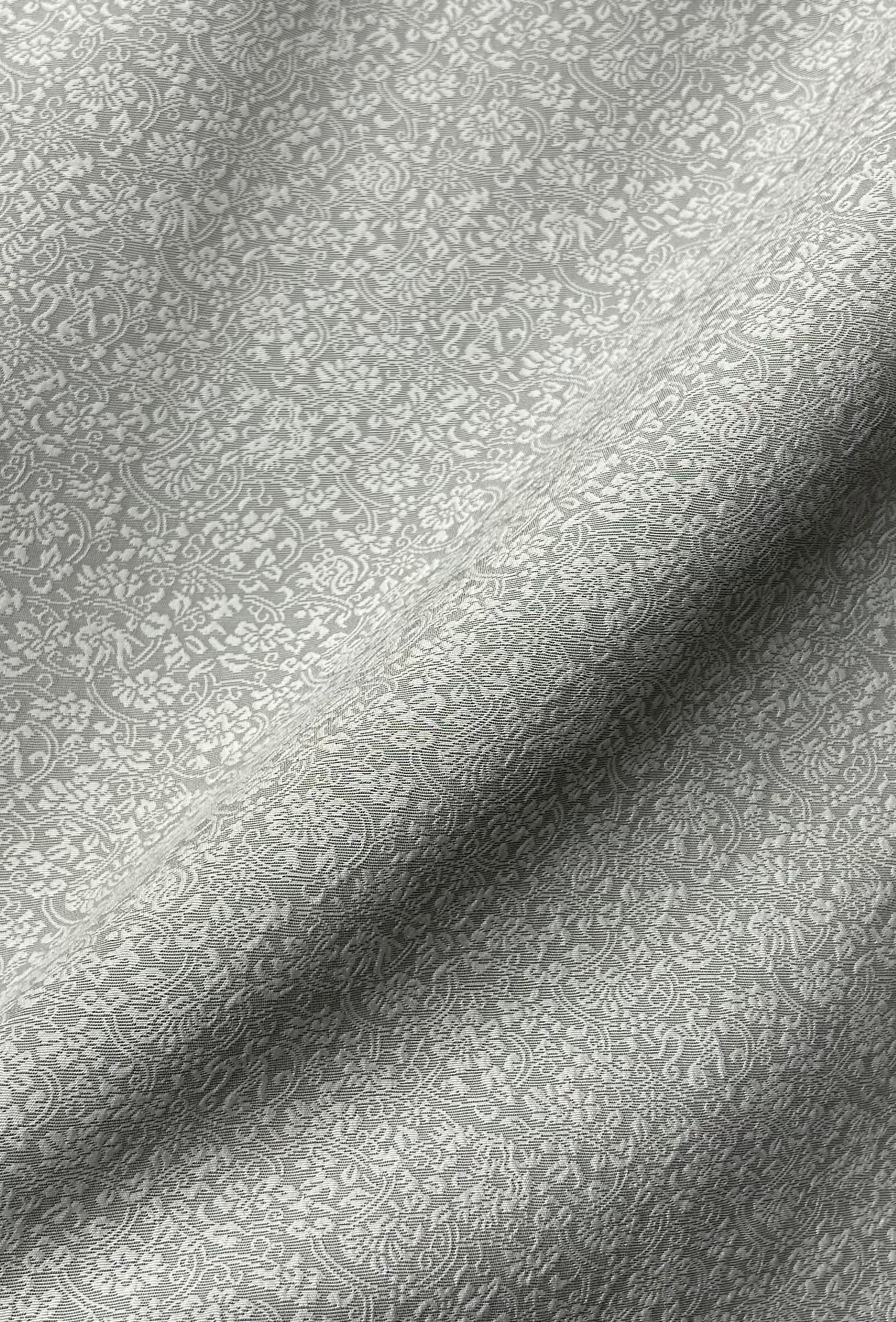 お召しのトールサイズ、蕎麦切り色の着物です。白の花唐草模様が施された上品なデザインで、柄に凹凸があり、華やかな印象を与えています。ほんのりハリのある生地は、さっぱりとした肌触りが特徴です。