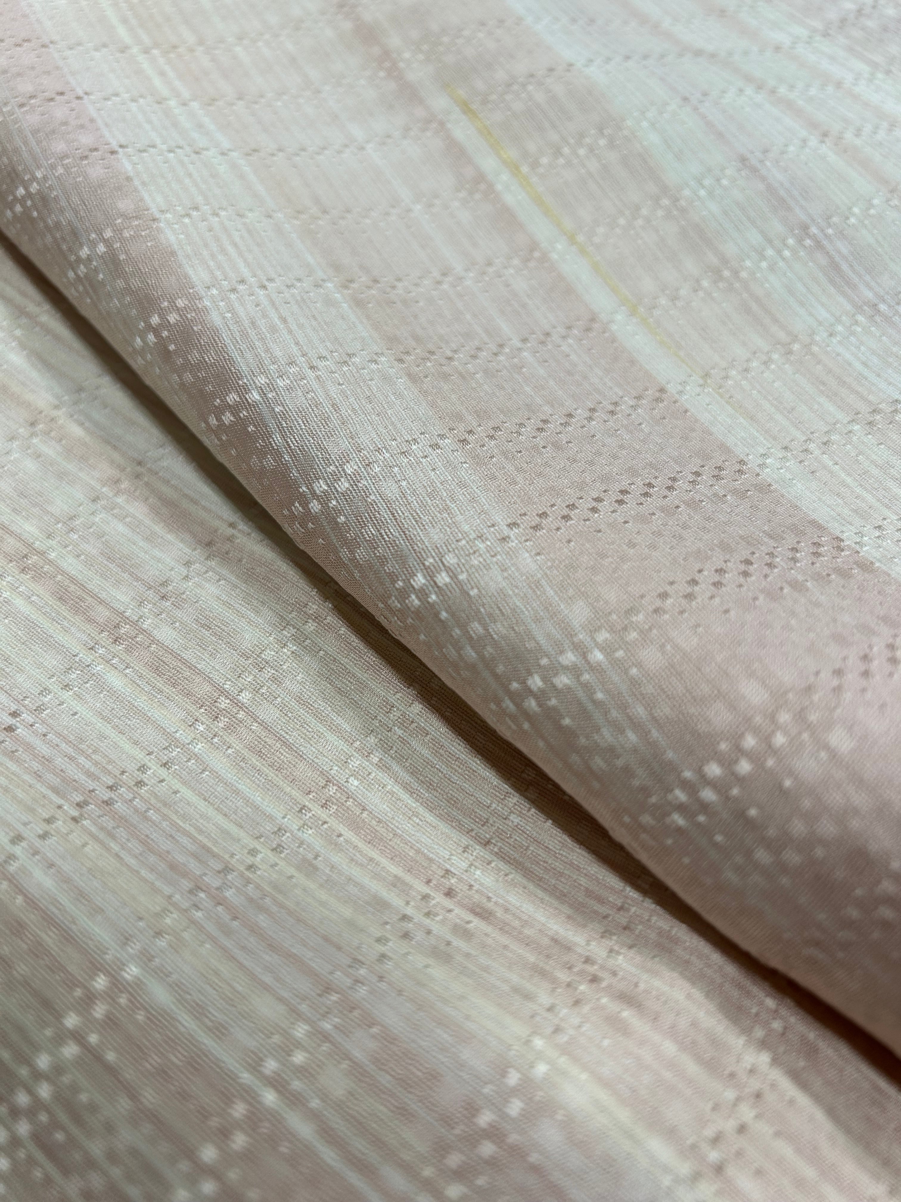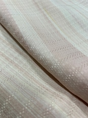 濃淡の美しいグラデーションが魅力の小紋をご紹介します。水柿色から洗柿色、薄卵色のランダムに織られた横段柄が、和の美しさを引き立てる一品です。同系色の花織のような地模様が縦縞のように浮かび上がり、可愛らしい色合いが見る人を惹きつけます。地はツルツルとした滑らかな触り心地で、所々金彩が施されています。