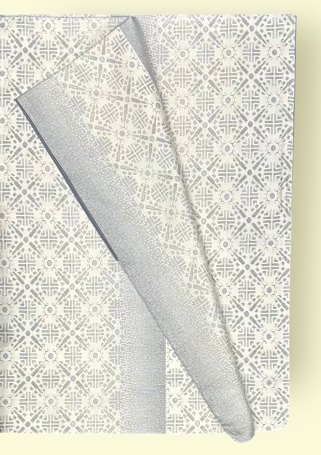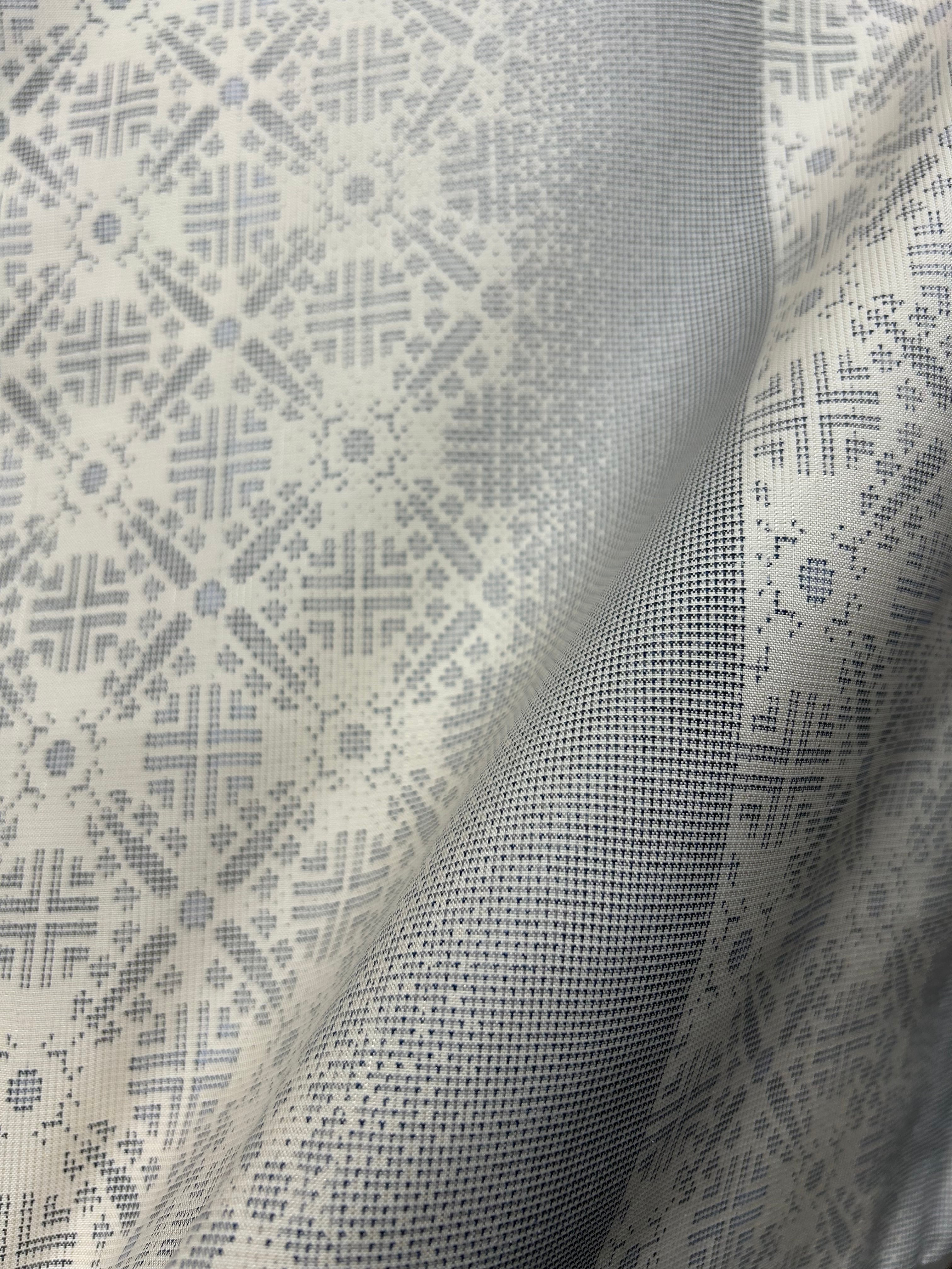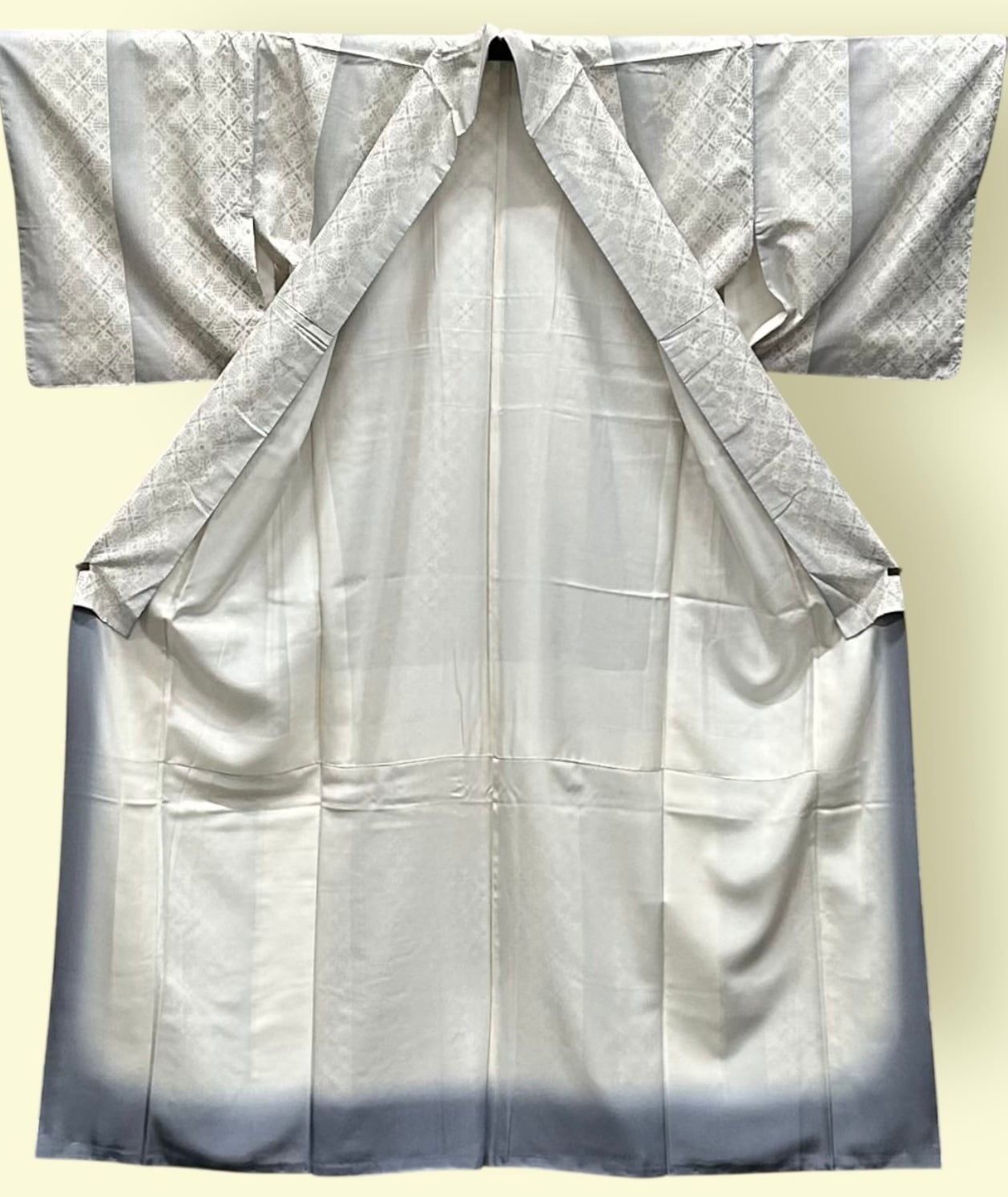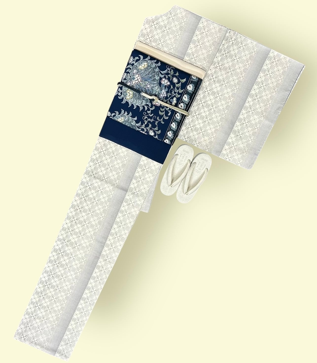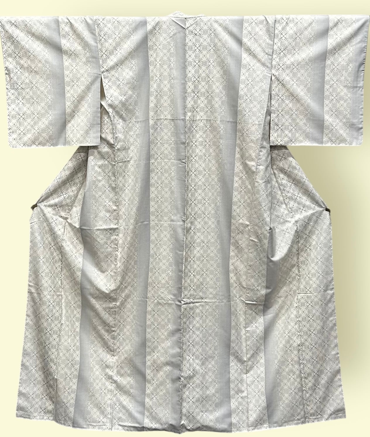 白大島 の美しいお着物 のご紹介です。鳥の子色と藍鉄色が織り込まれたお洒落な幾何学模様が、ナチュラルで洗練された印象を与えます。程よいハリ感と滑らかな肌触りが特徴で、使うシーンに応じて幅広く活躍します。