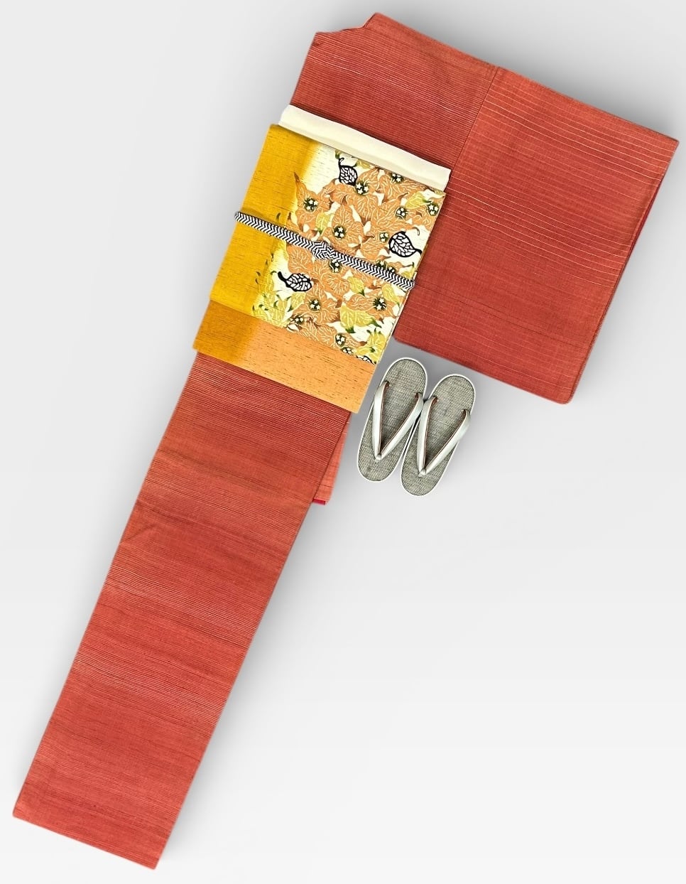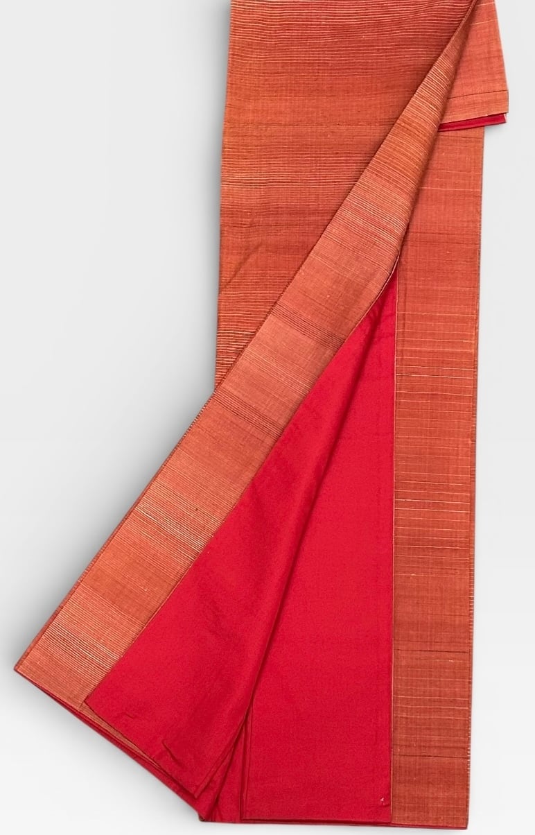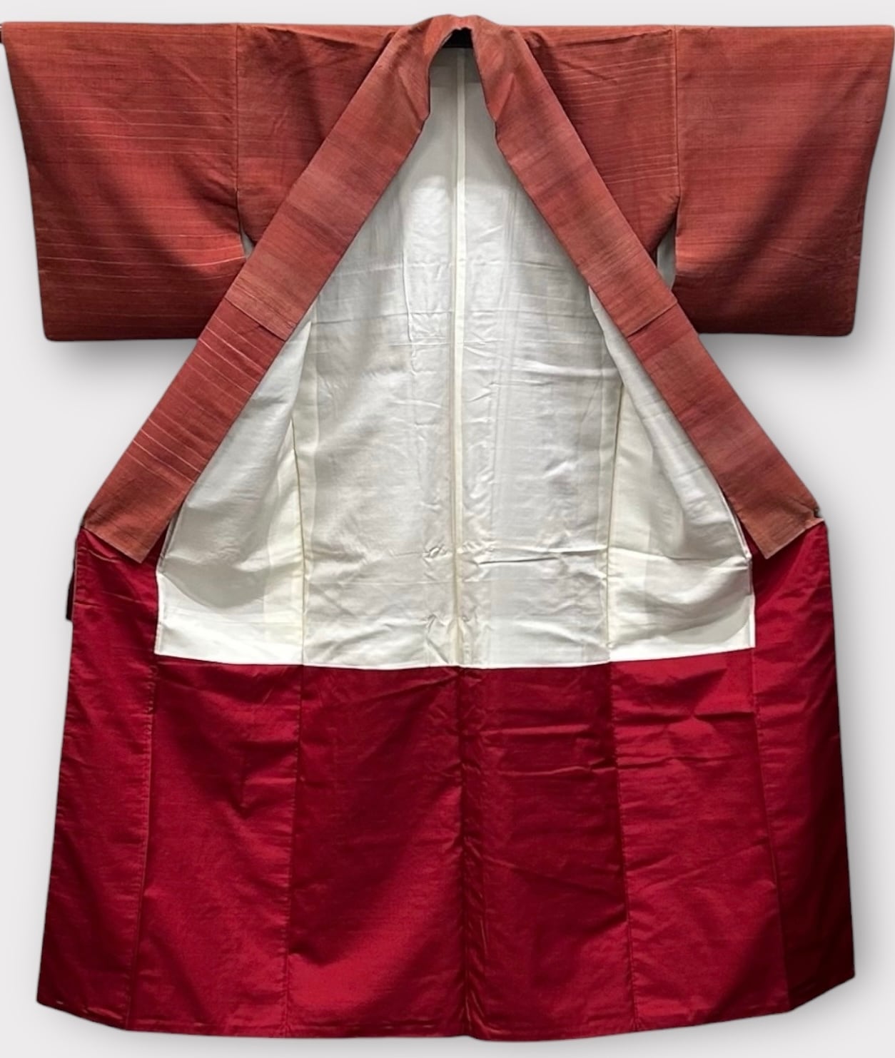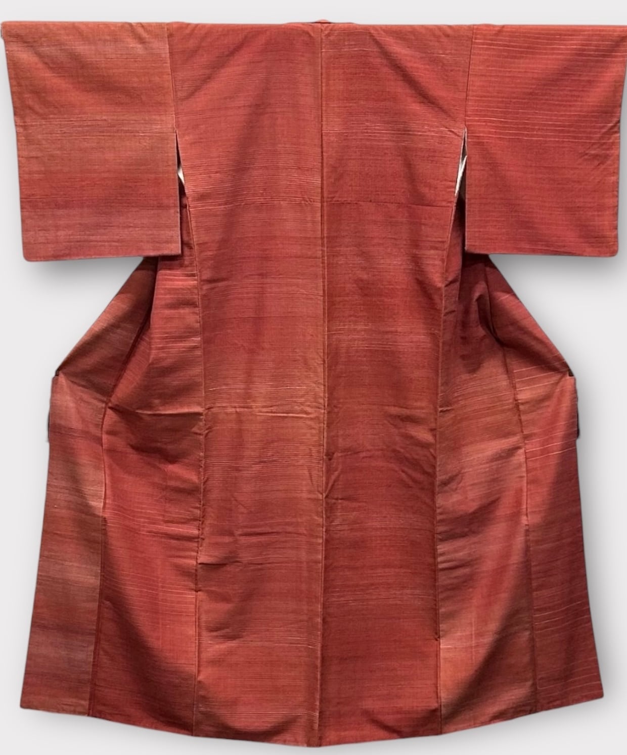 深みのある赤紅色と洗練された横縞が特徴の紬をお届けします。色合いの濃淡が美しいこの一品は、白、黒、水色、柳茶色などの細いランダムな横縞が施され、シックでありながら存在感があります。ハリのあるしっかりとした地は、着用するたびに心地よさを感じられるお着物です。