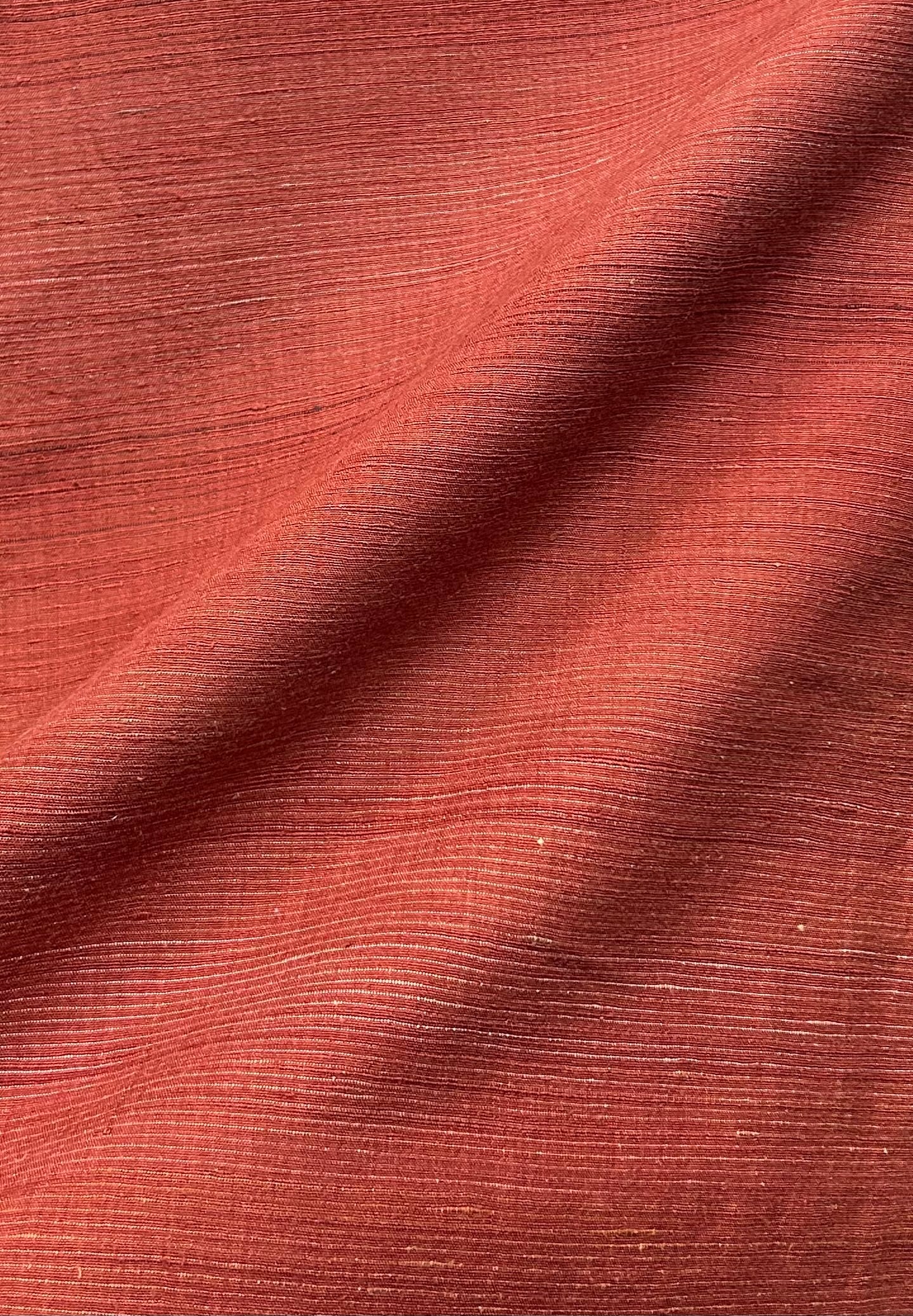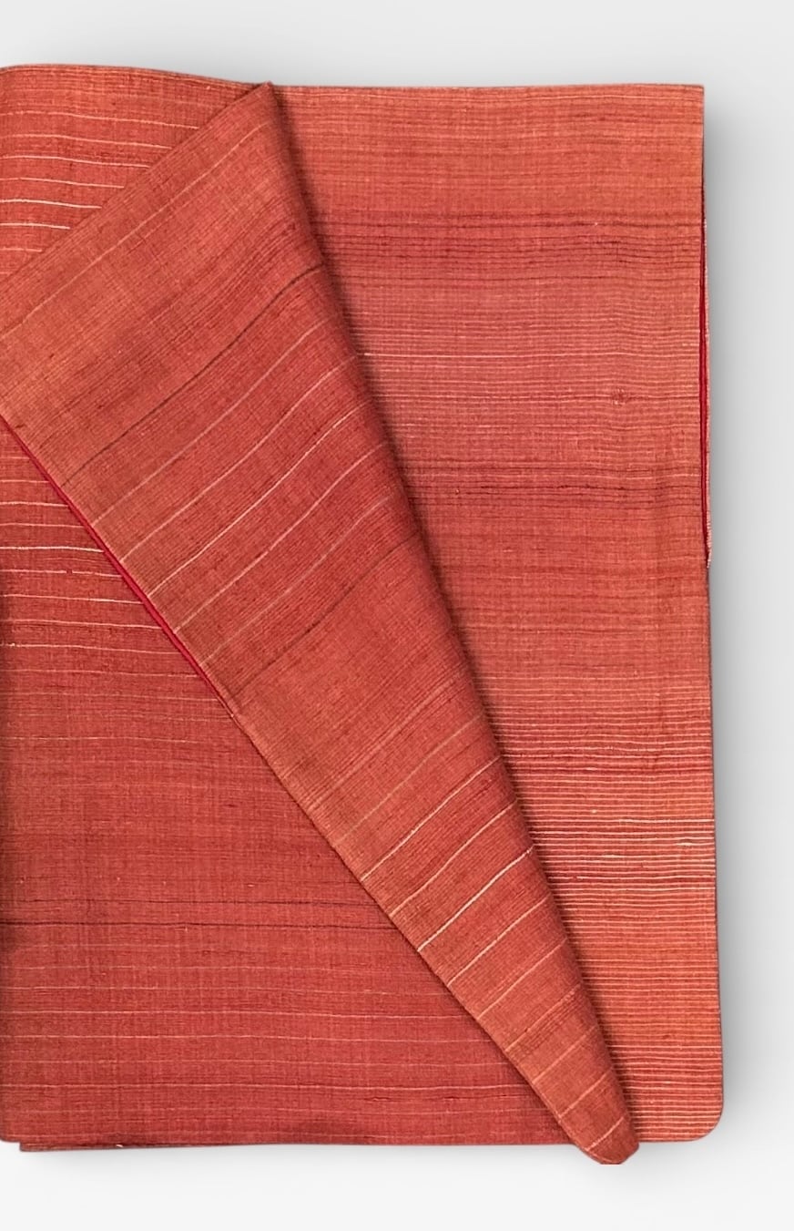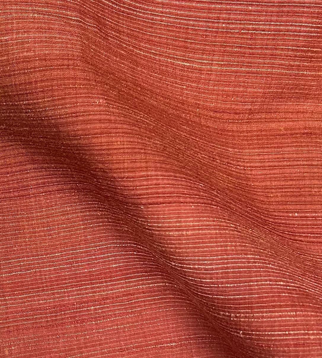 深みのある赤紅色と洗練された横縞が特徴の紬をお届けします。色合いの濃淡が美しいこの一品は、白、黒、水色、柳茶色などの細いランダムな横縞が施され、シックでありながら存在感があります。ハリのあるしっかりとした地は、着用するたびに心地よさを感じられるお着物です。