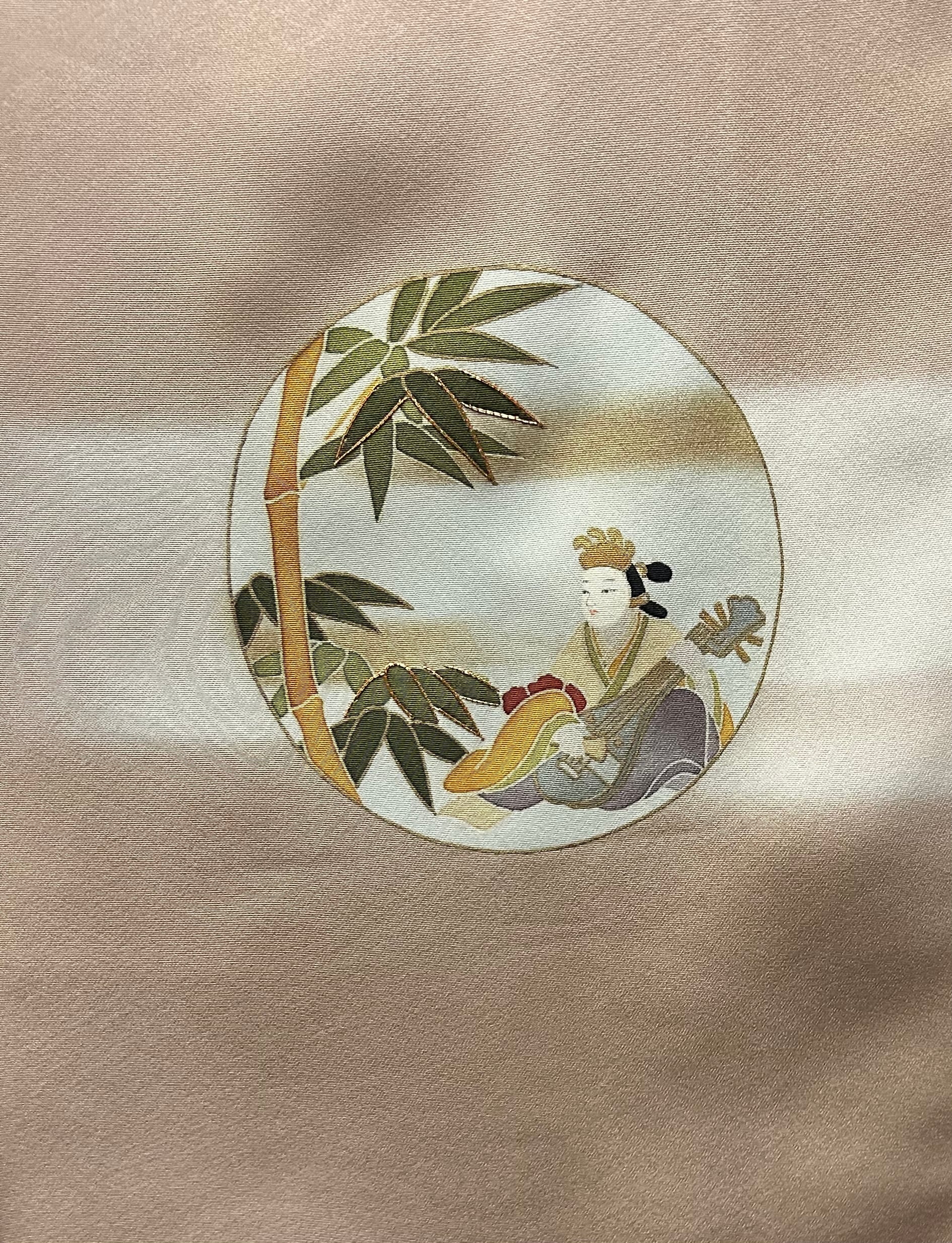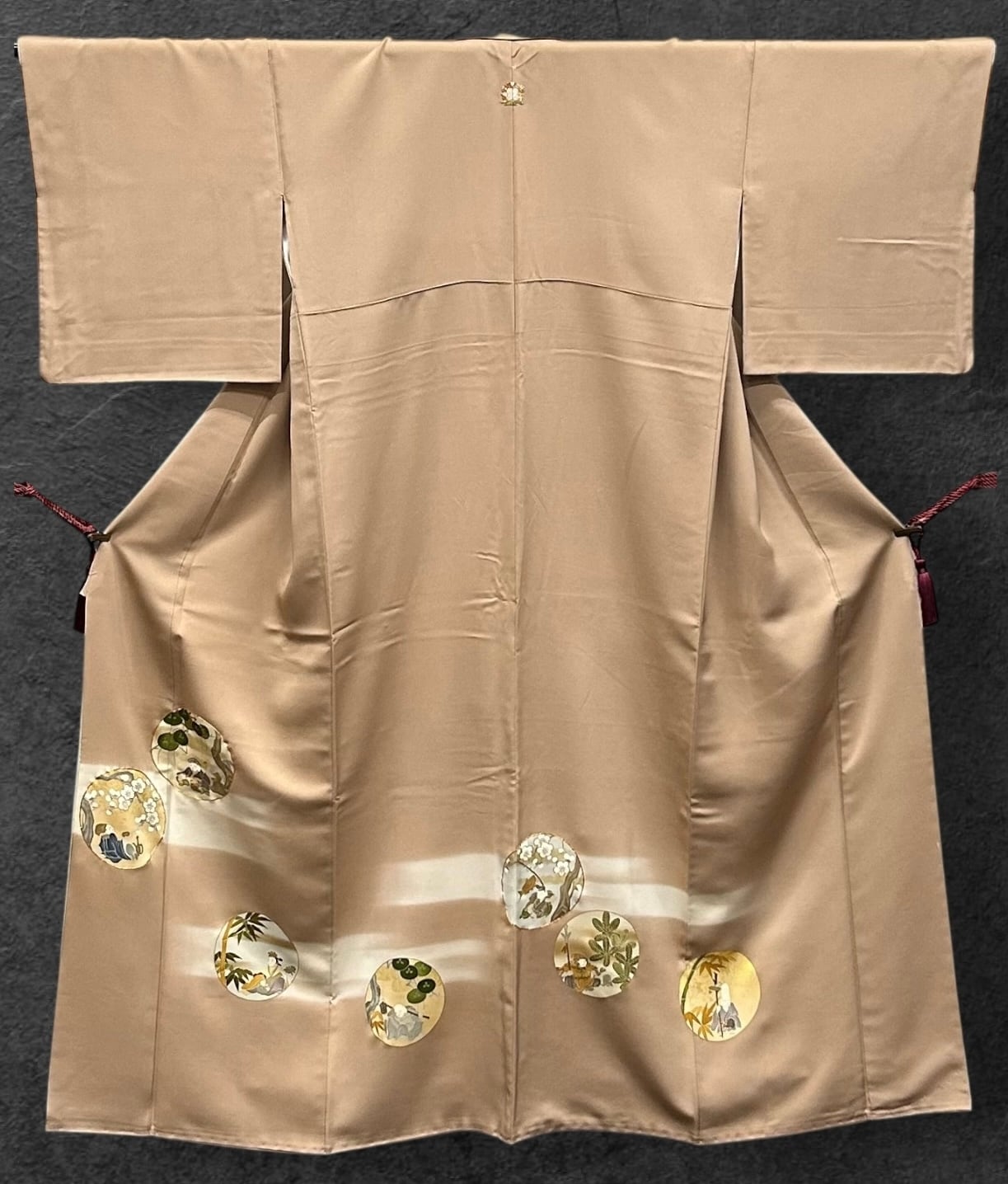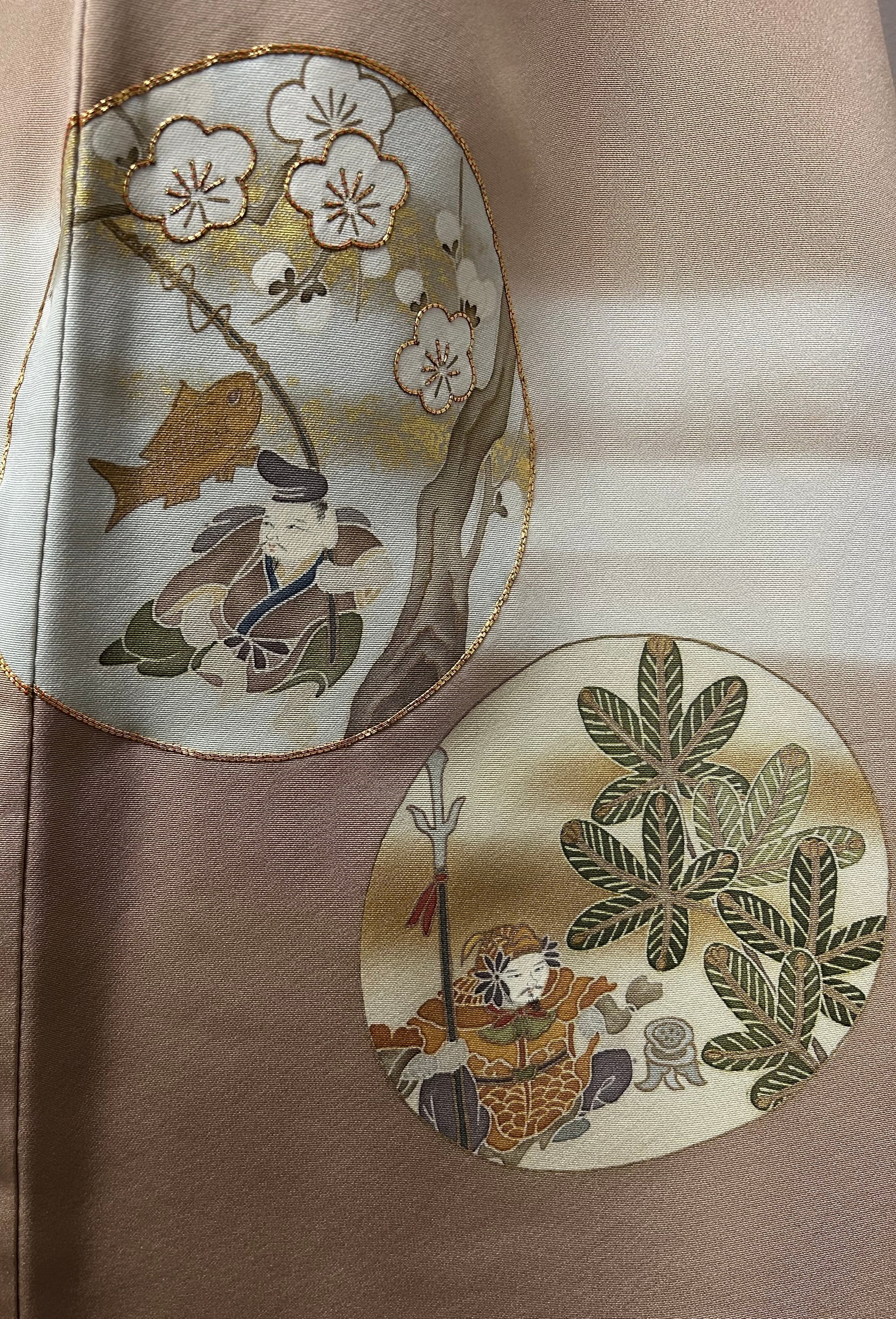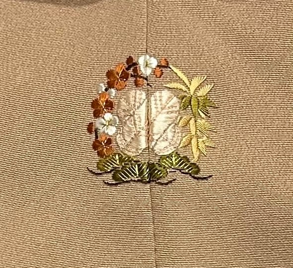 美しい伽羅色の地に、松竹梅と七福神の所々金こま刺繍が施された色留袖をお届けします。こっくりとしたなめらかな肌触りが特徴的で、洒落紋(刺繡)も加わった特別な一品です。華やかさと落ち着きを兼ね備えたこの色留袖は、特別な日のお出かけにぴったりです。しつけ糸つき。