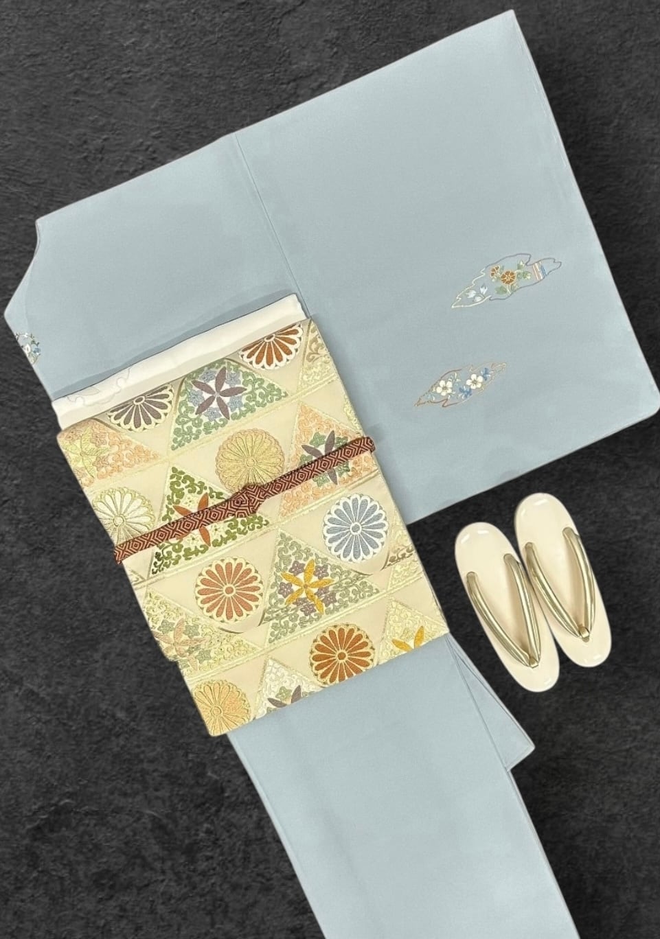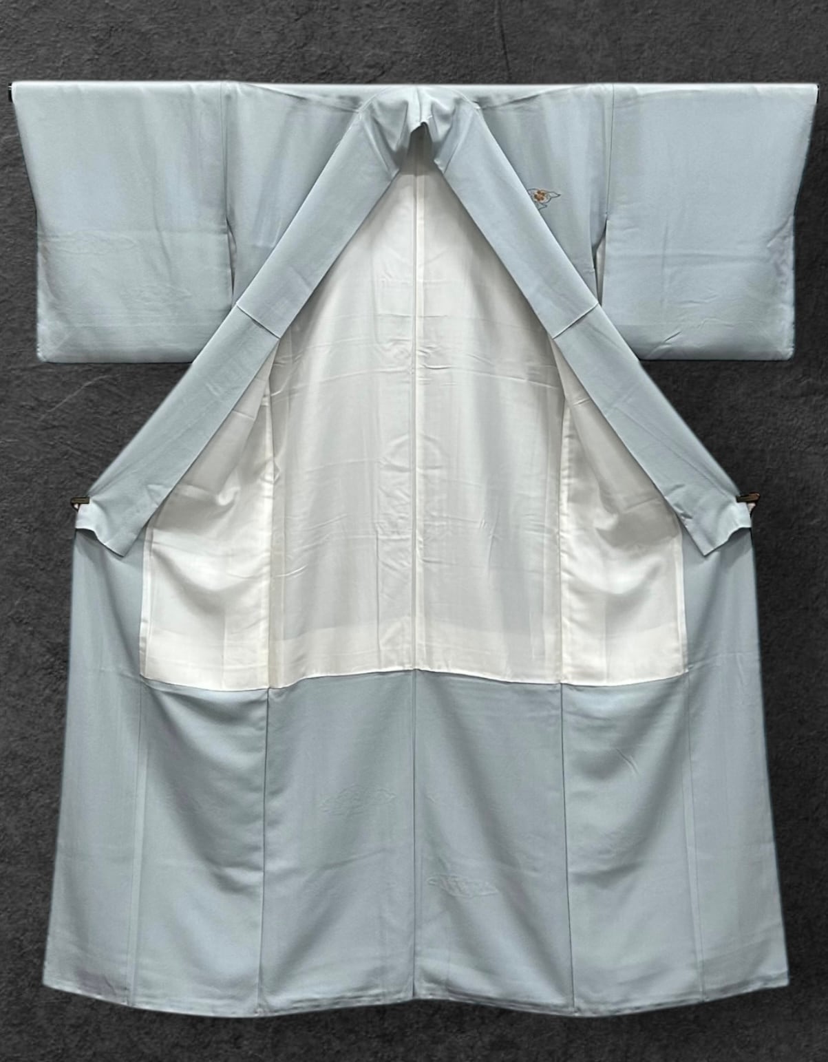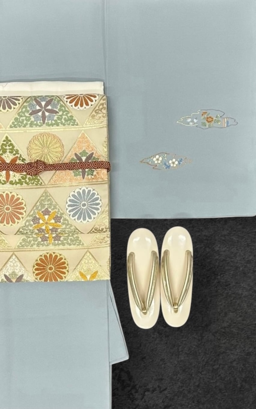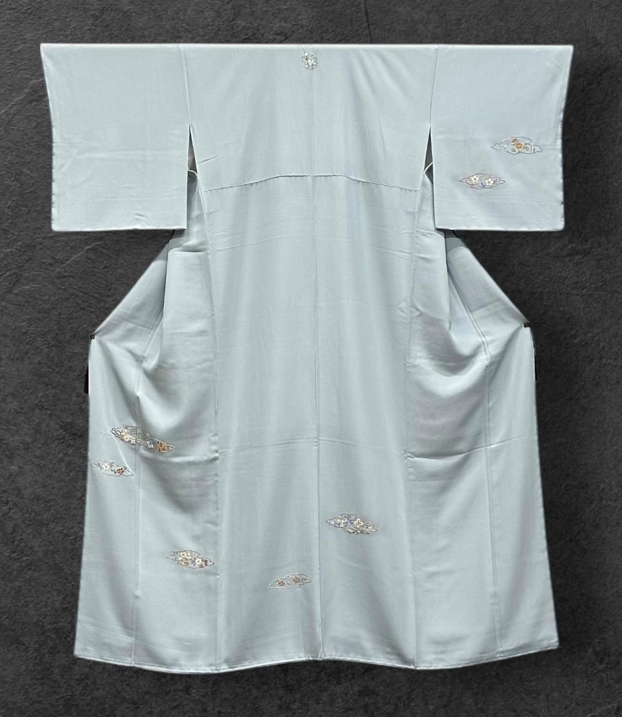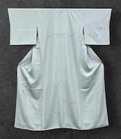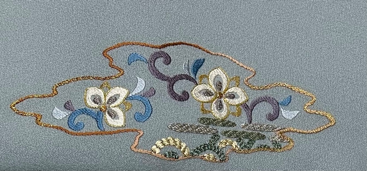 清楚で上品な雰囲気を纏った美麗な付下げです。若干くすんだ秘色色の地に、雲のような形を持つ中に繊細な花々の刺繍が施されており、総刺繍で仕上げられた清楚なデザインが特徴です。また、一つ紋部分には飾り刺繍紋が施されており、特別な場面でも贅沢な印象をあたえます。