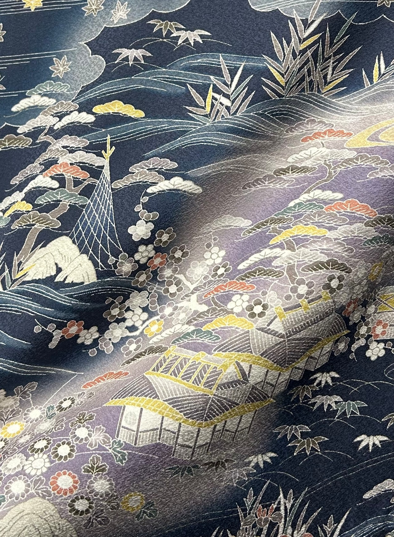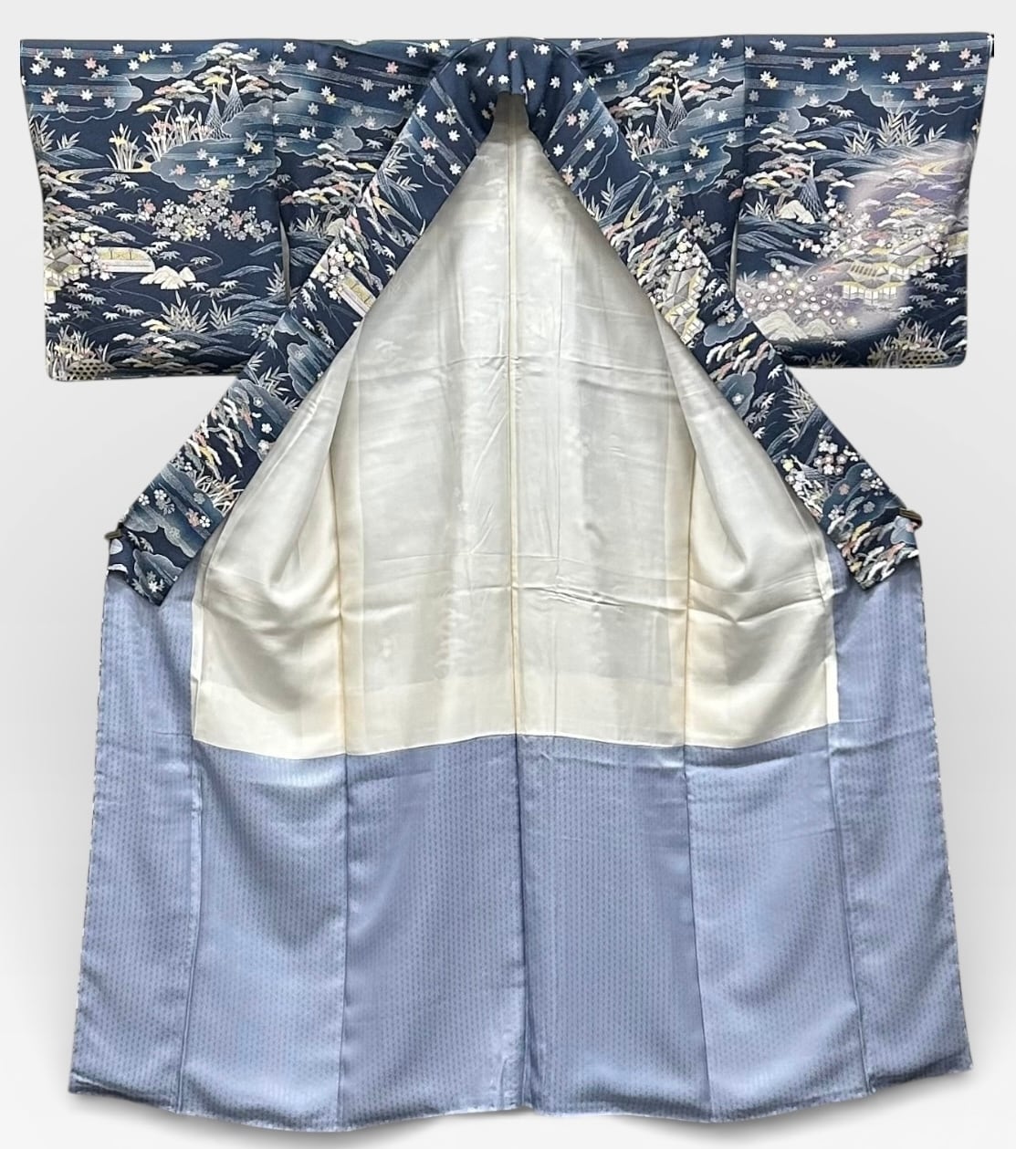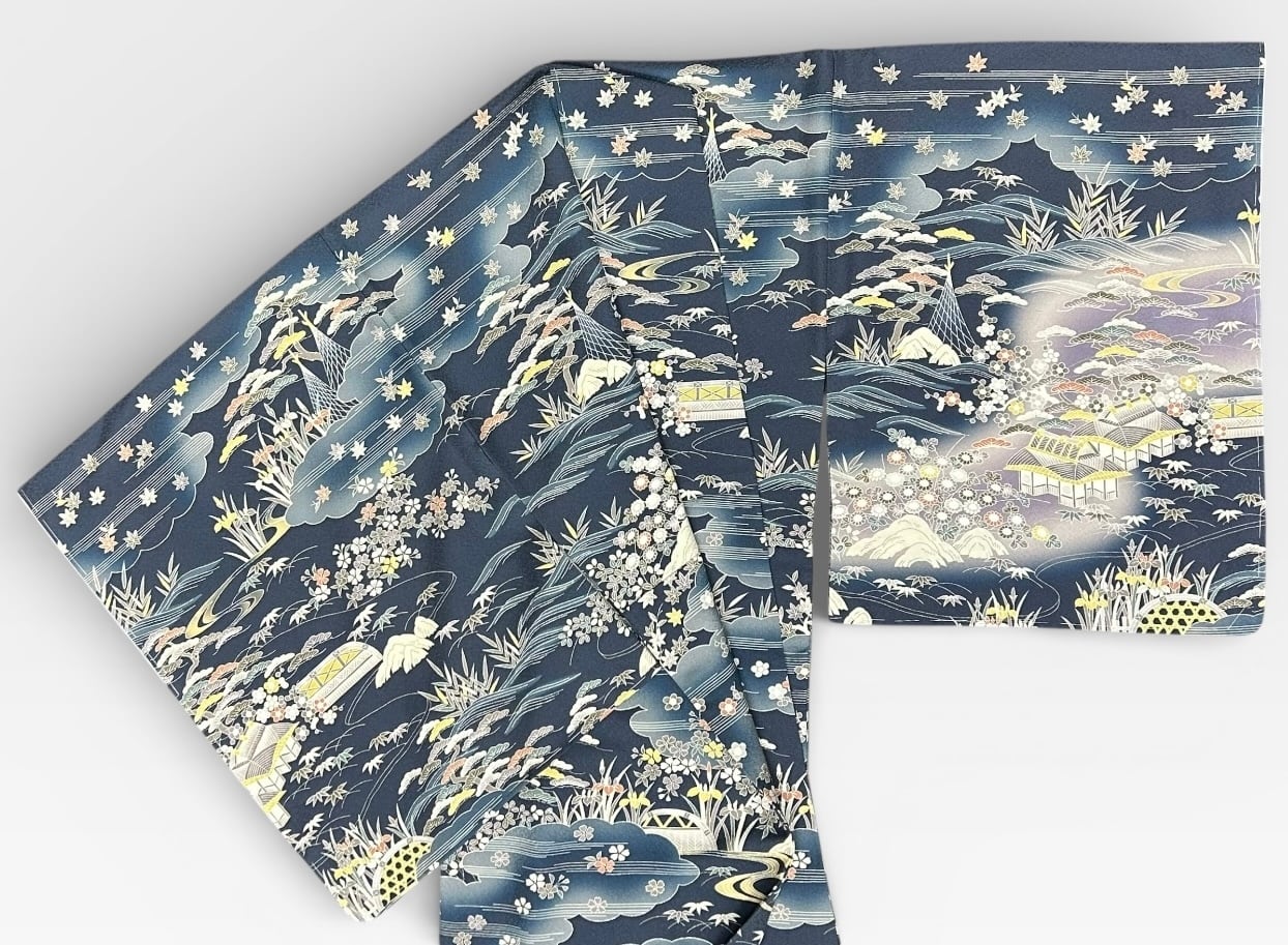 美しい付下げのお着物のご案内です!青みのある鉄御納戸色に半色~藤鼠色などのお色味が重なり合い、上品な茶屋辻文様が施されています。しっとりと柔らかい質感が落ち着いた気品を感じさせます。しつけ糸つき。