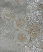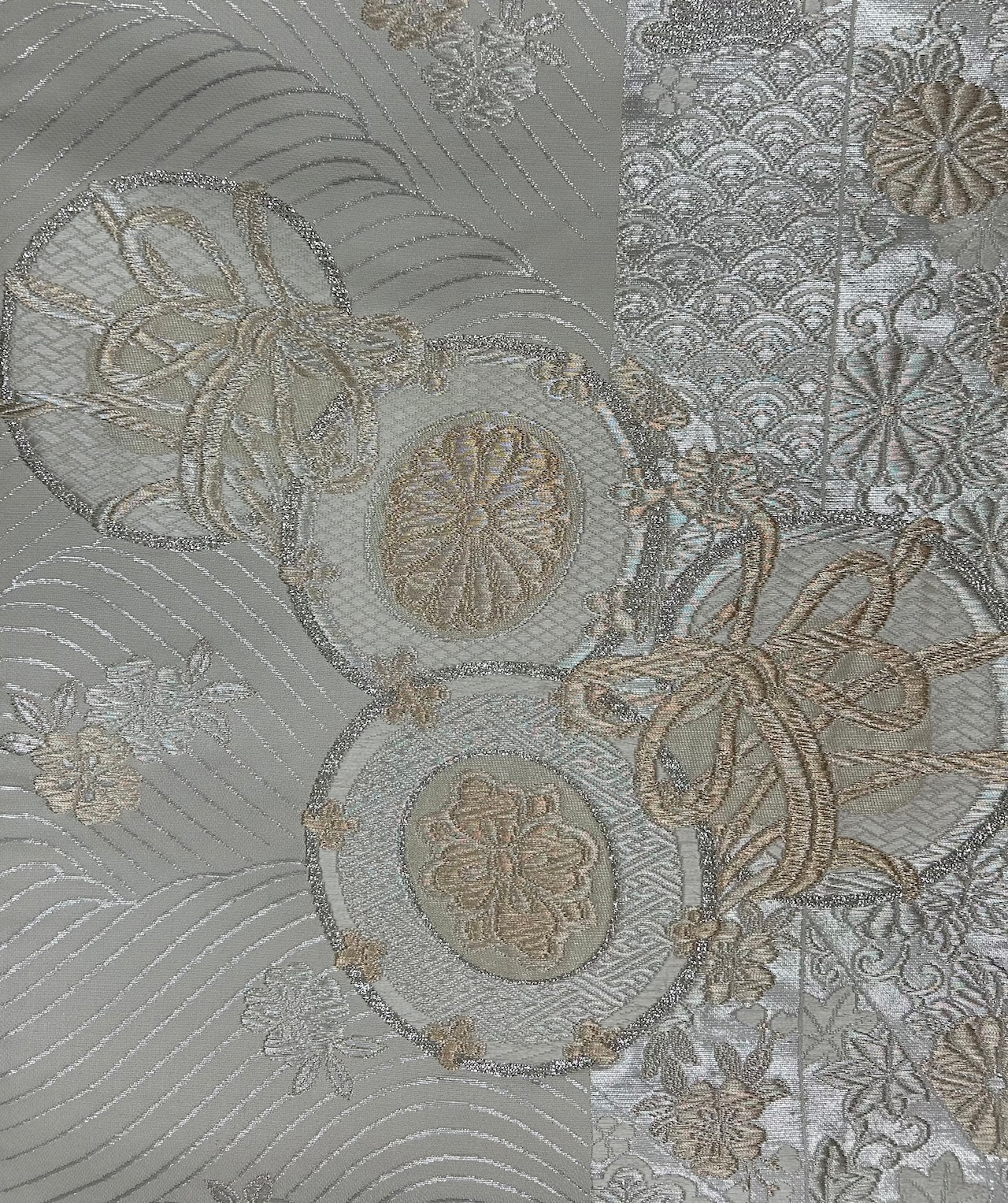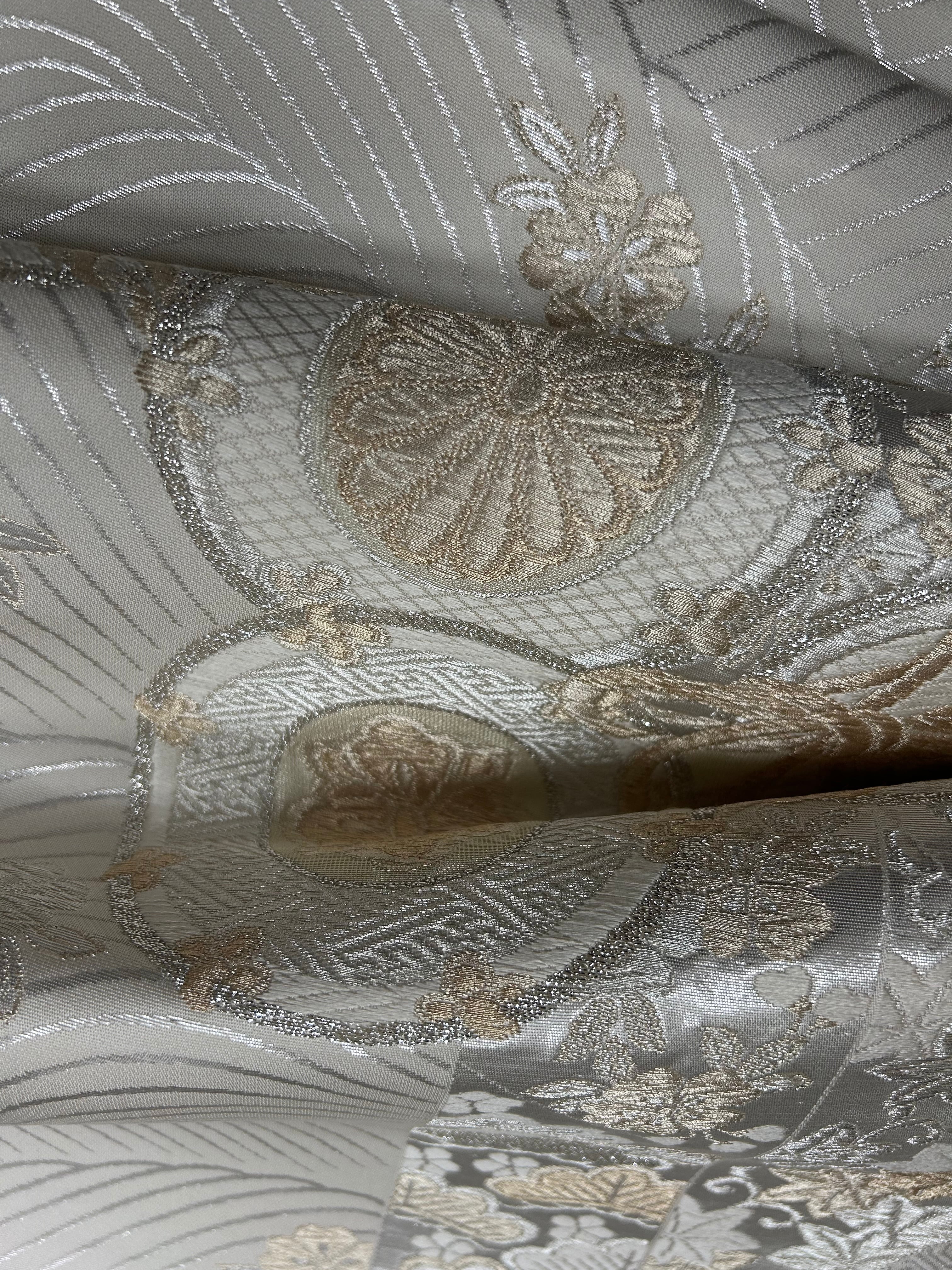 美しい袋帯のご案内です!象牙色の地に華やかな金糸と銀糸を巧みに織り交ぜ、四季の花や有職文様、さらに吉祥文様である波模様や青海波、鼓のデザインが施されています。ほんのりとしたハリを持ちながらも柔らかい質感で、片面全通の仕立てが特別なシーンにぴったりな一品です。