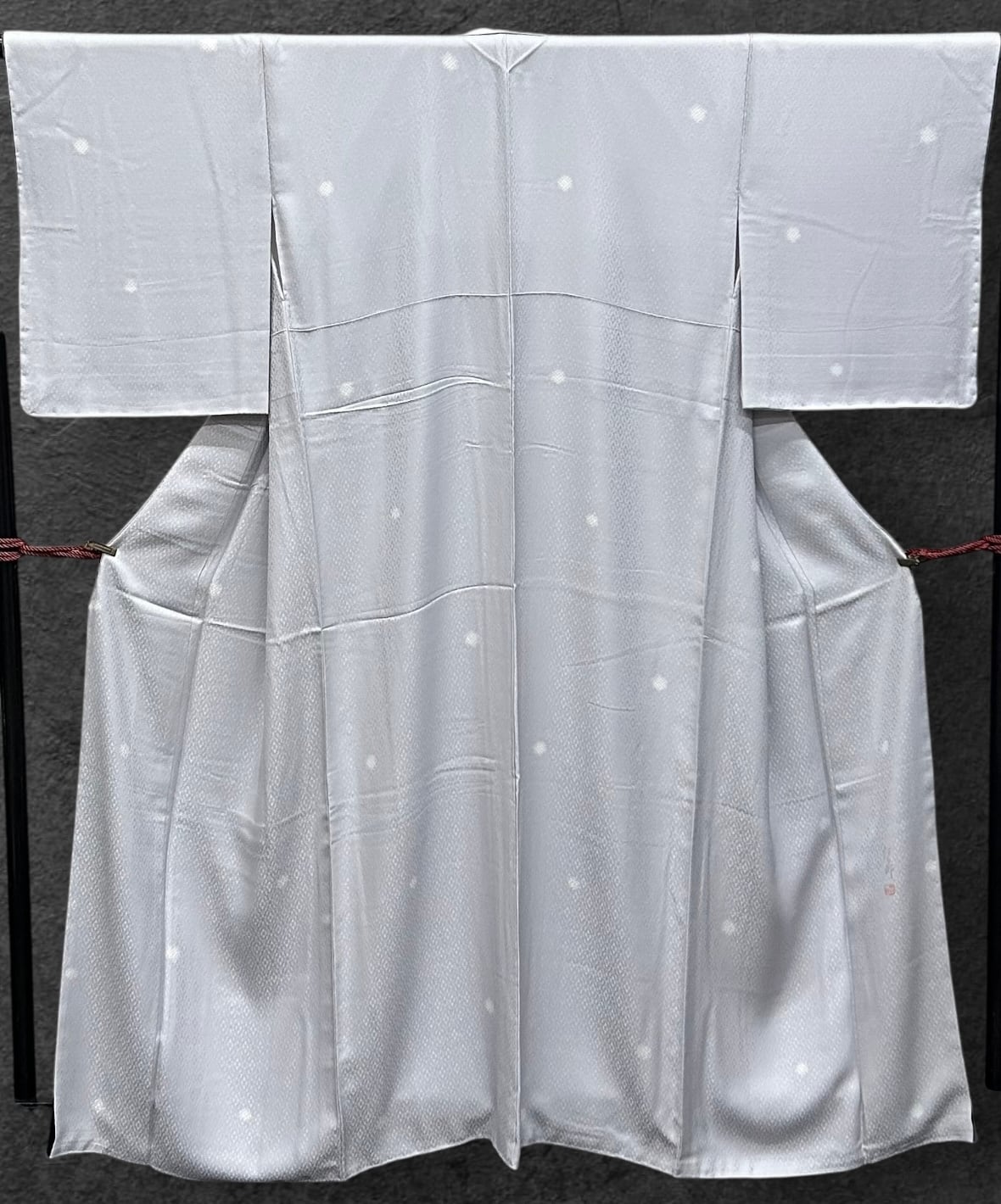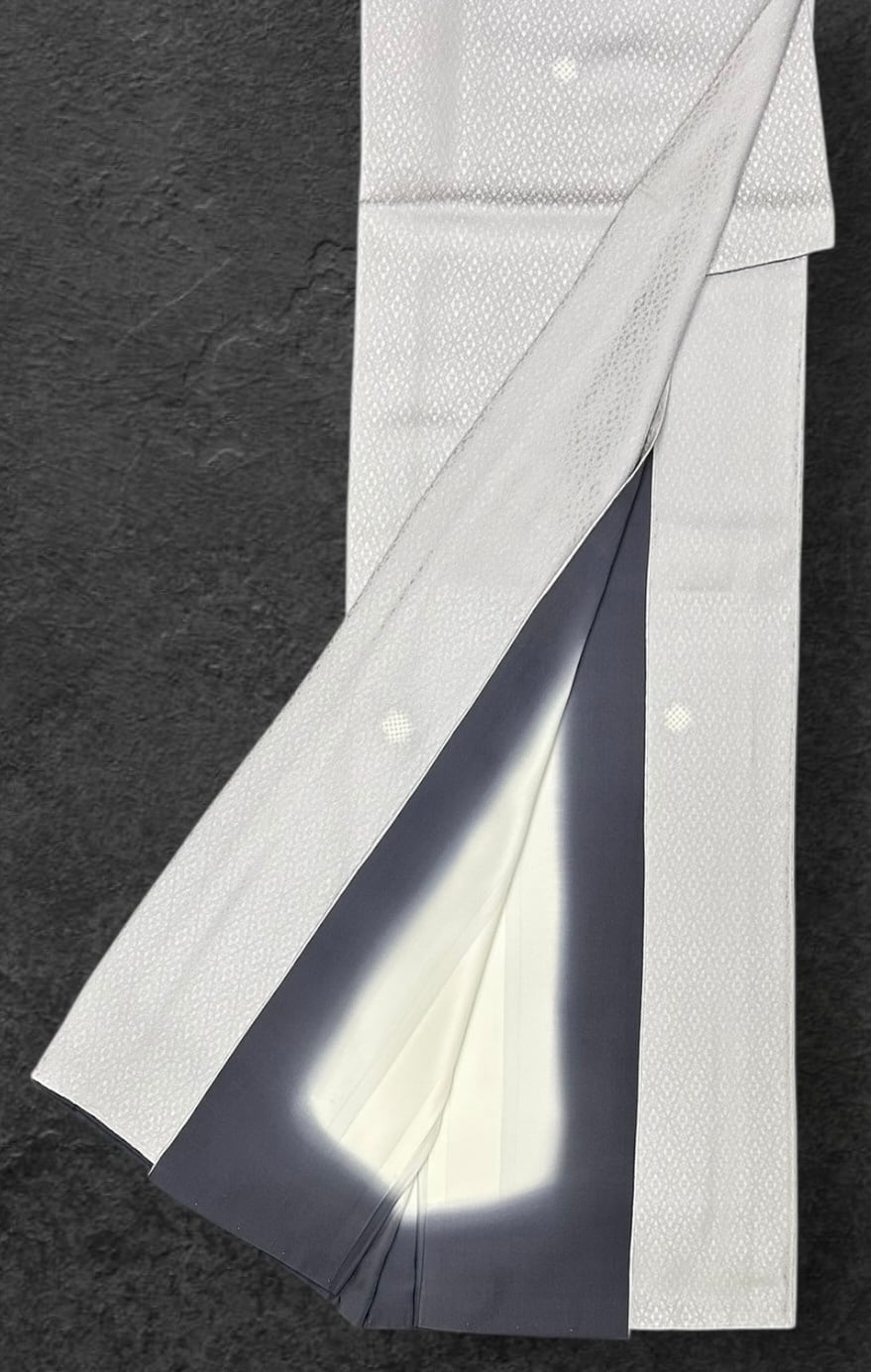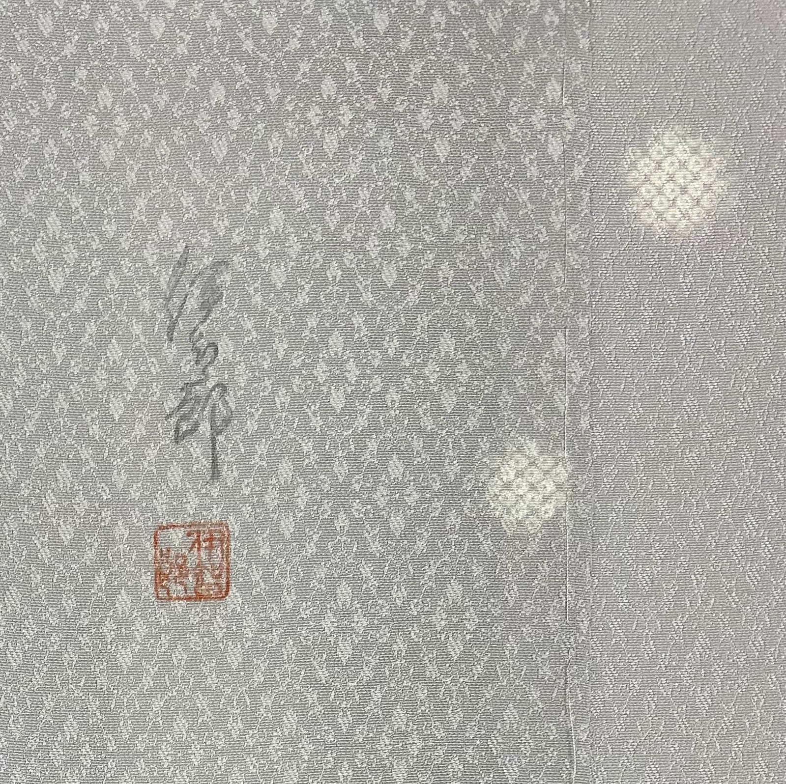 美しい紫水晶色の地に、花菱の洒落た地紋が施された小紋です。細やかな疋田柄の蛍ぼかしが、上品ながらも華やかな印象を与えます。柔らかく滑らかな肌触りが特徴で、着心地も抜群です。作家物、落款つきの素晴らしい逸品です。ガード加工すみ、しつけ糸つき。