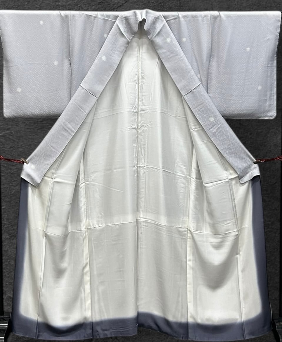 小紋 作家物 落款つき 紫水晶色の地 お洒落な花菱の地紋 疋田柄の蛍ぼかし ガード加工すみ しつけ糸つき 裄丈 68.5㎝ K6089
