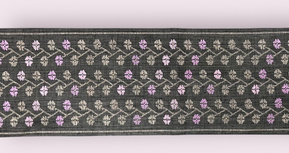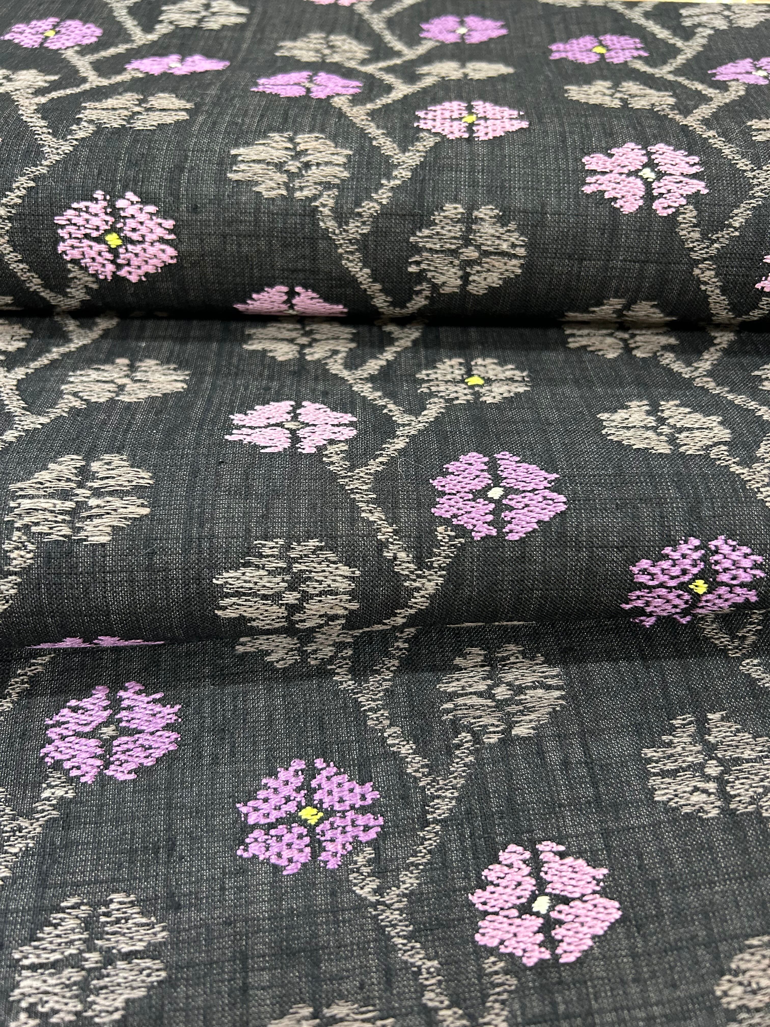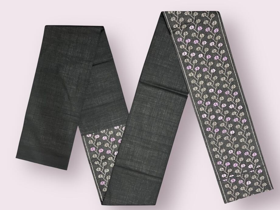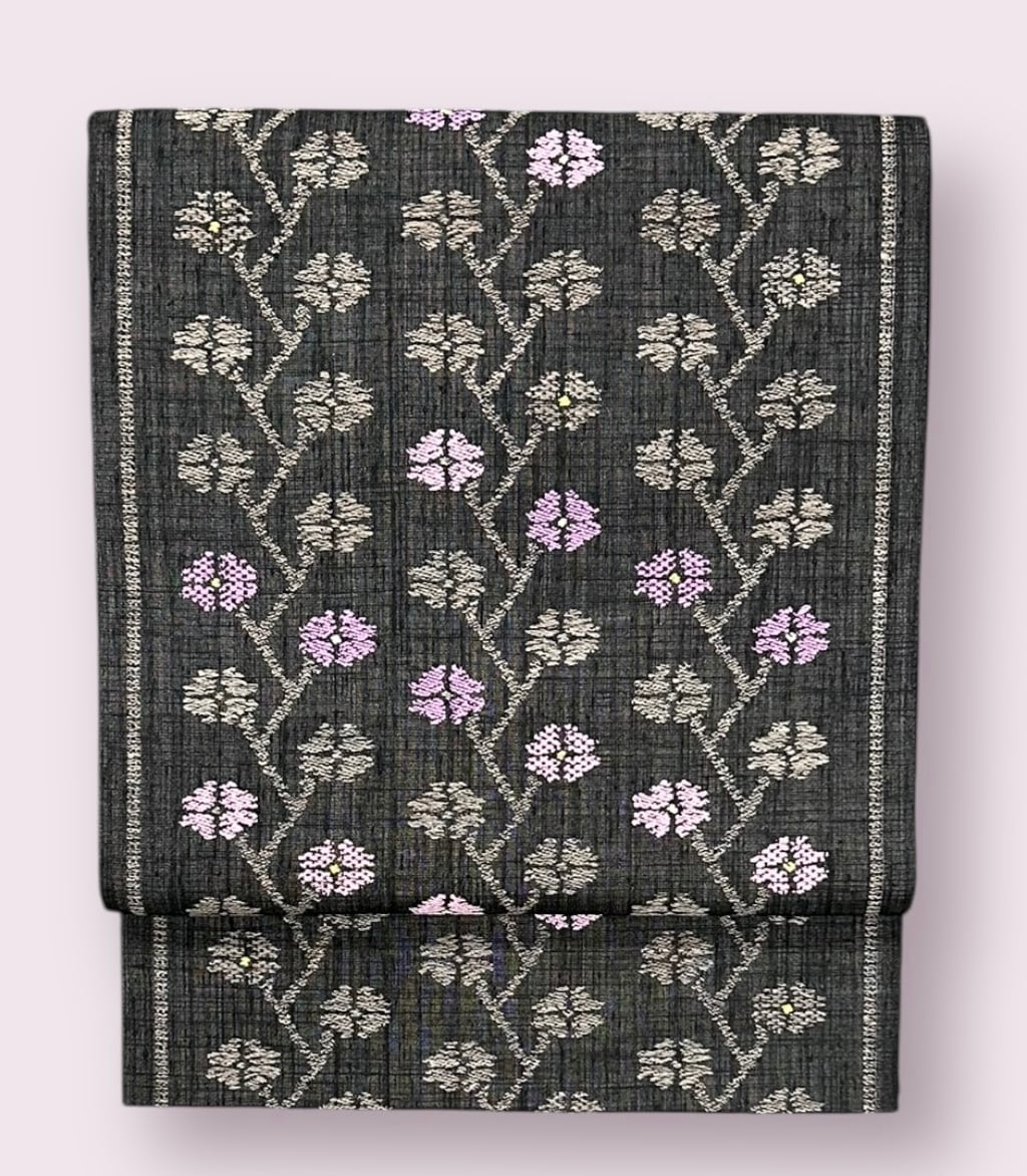 黒の紬地に規則正しい花模様は濃い江戸鼠色で表現され、差し色の紫や紅藤色が可愛らしさを引き立てます。どんな着物にも合わせやすく、存在感を際立てる美しい洒落袋帯です。