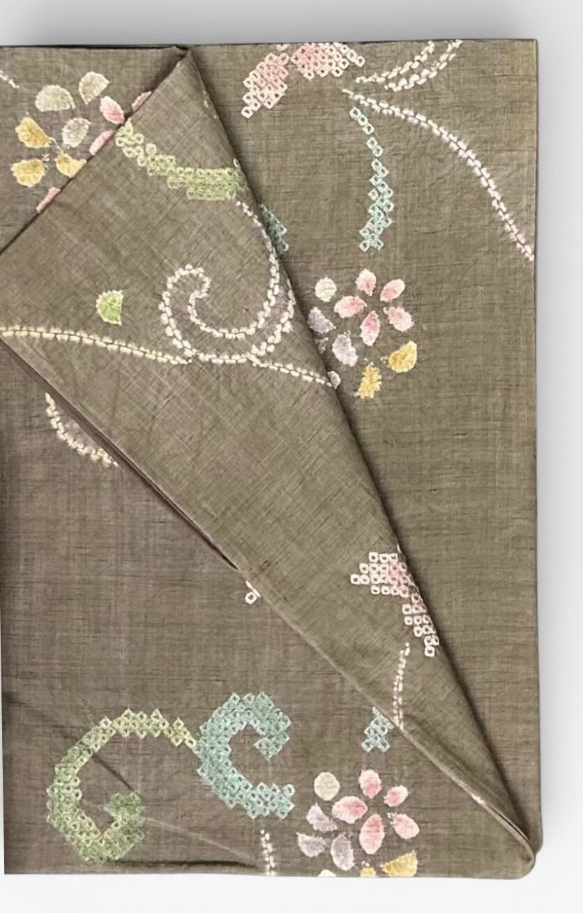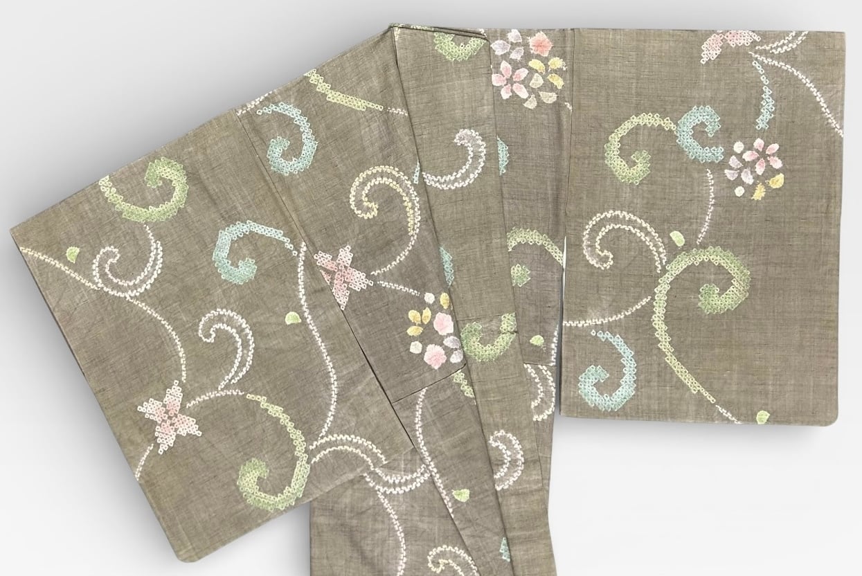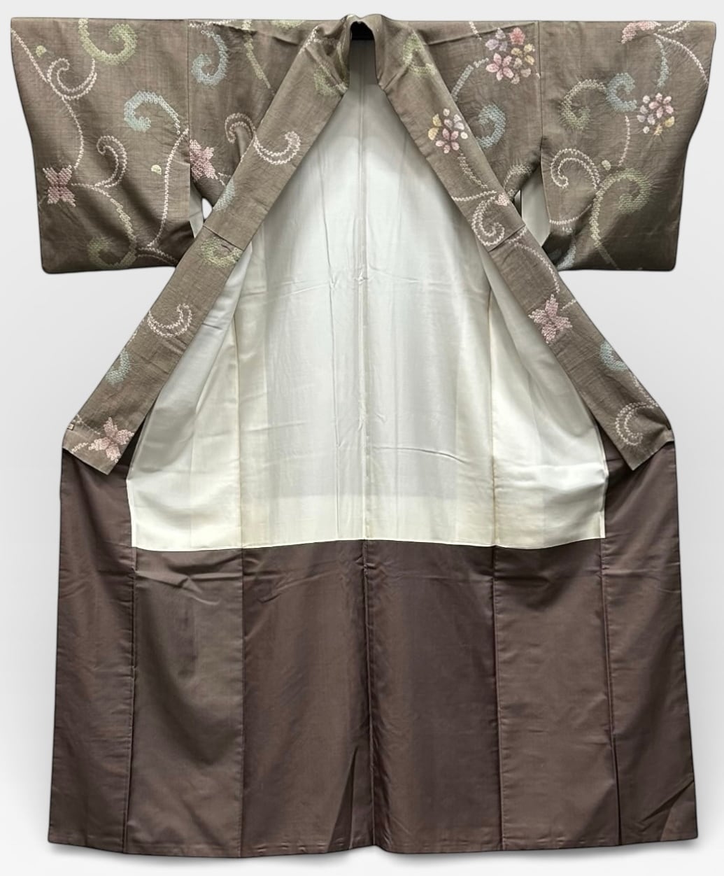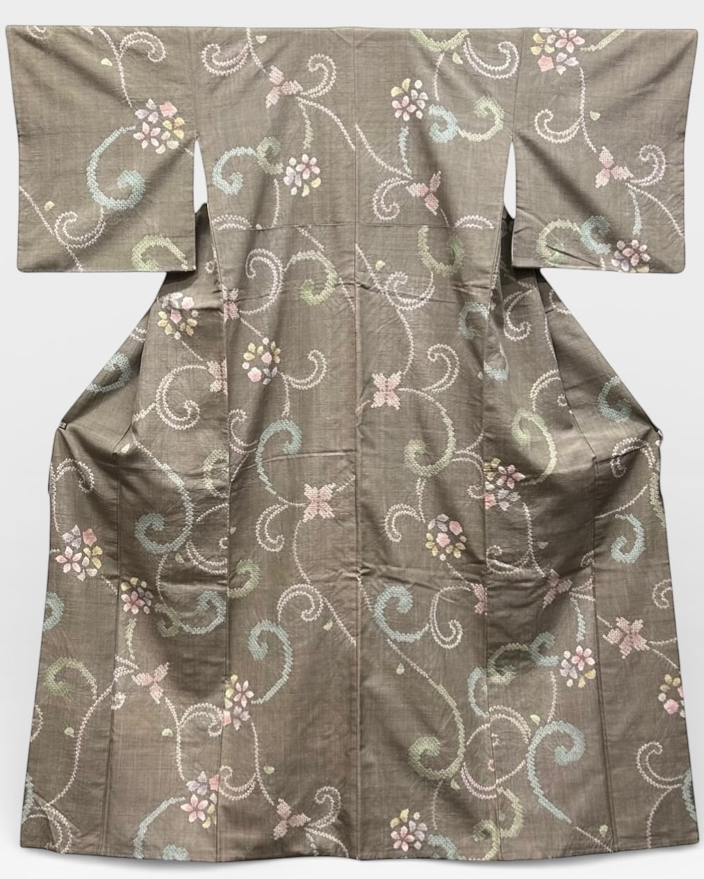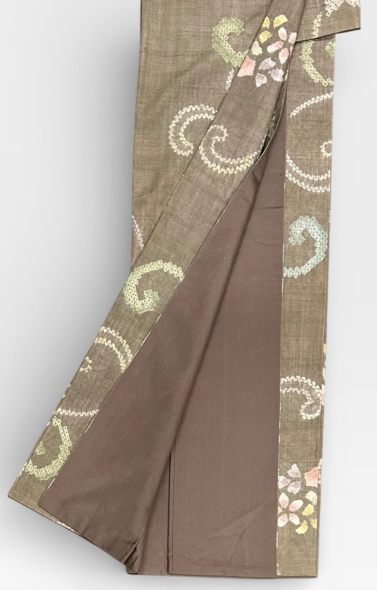 紬 三越 茶色がかった江戸鼠色の地 優雅な絞りの草花文様 裄丈 64㎝ K6447